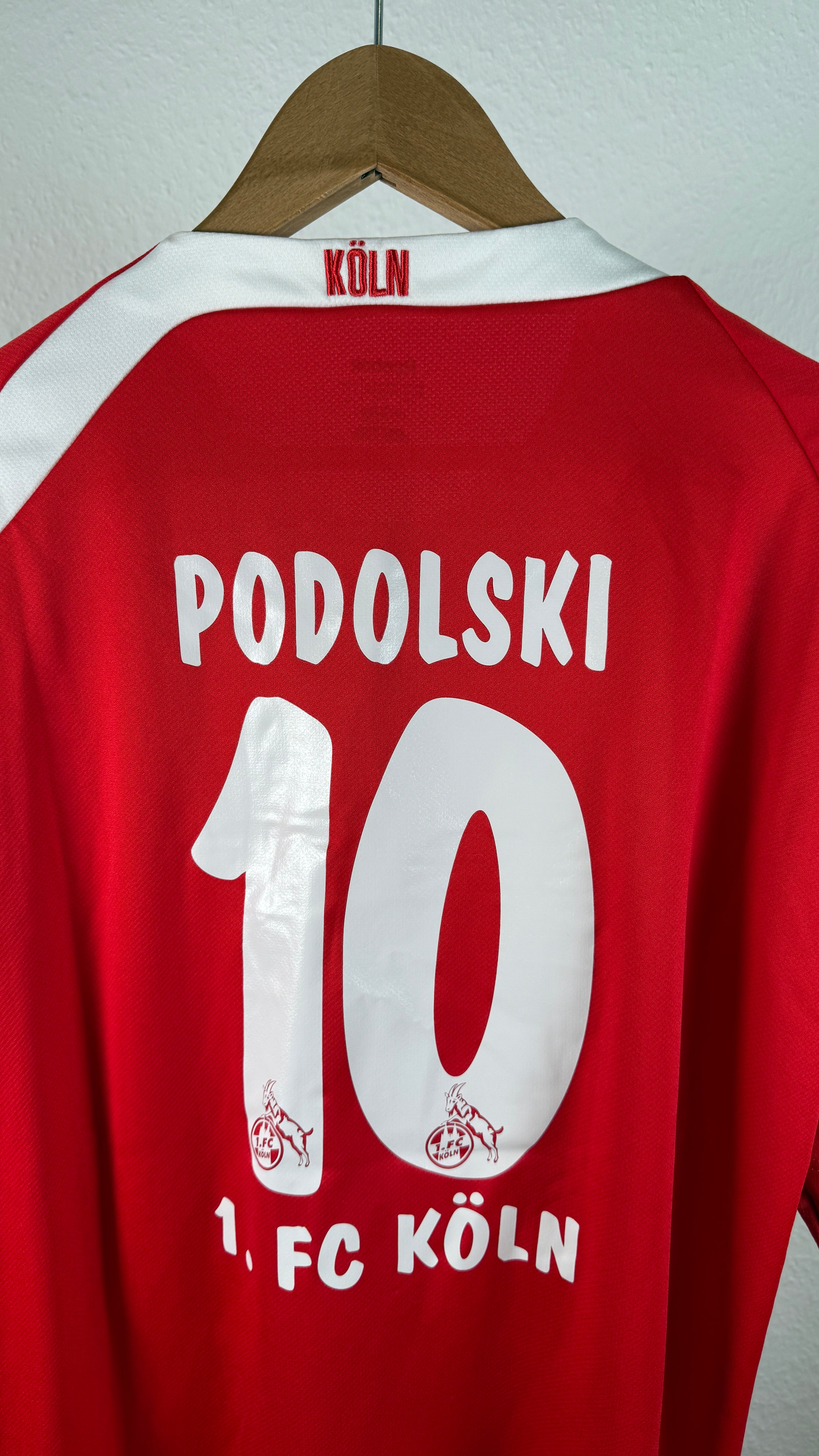 Original Heimtrikot des 1. FC Köln aus der Saison 2009/10 mit dem Flock von Lukas Podolski, der nach seiner Zeit beim FC Bayern München zurück in seine Heimatstadt wechselte.