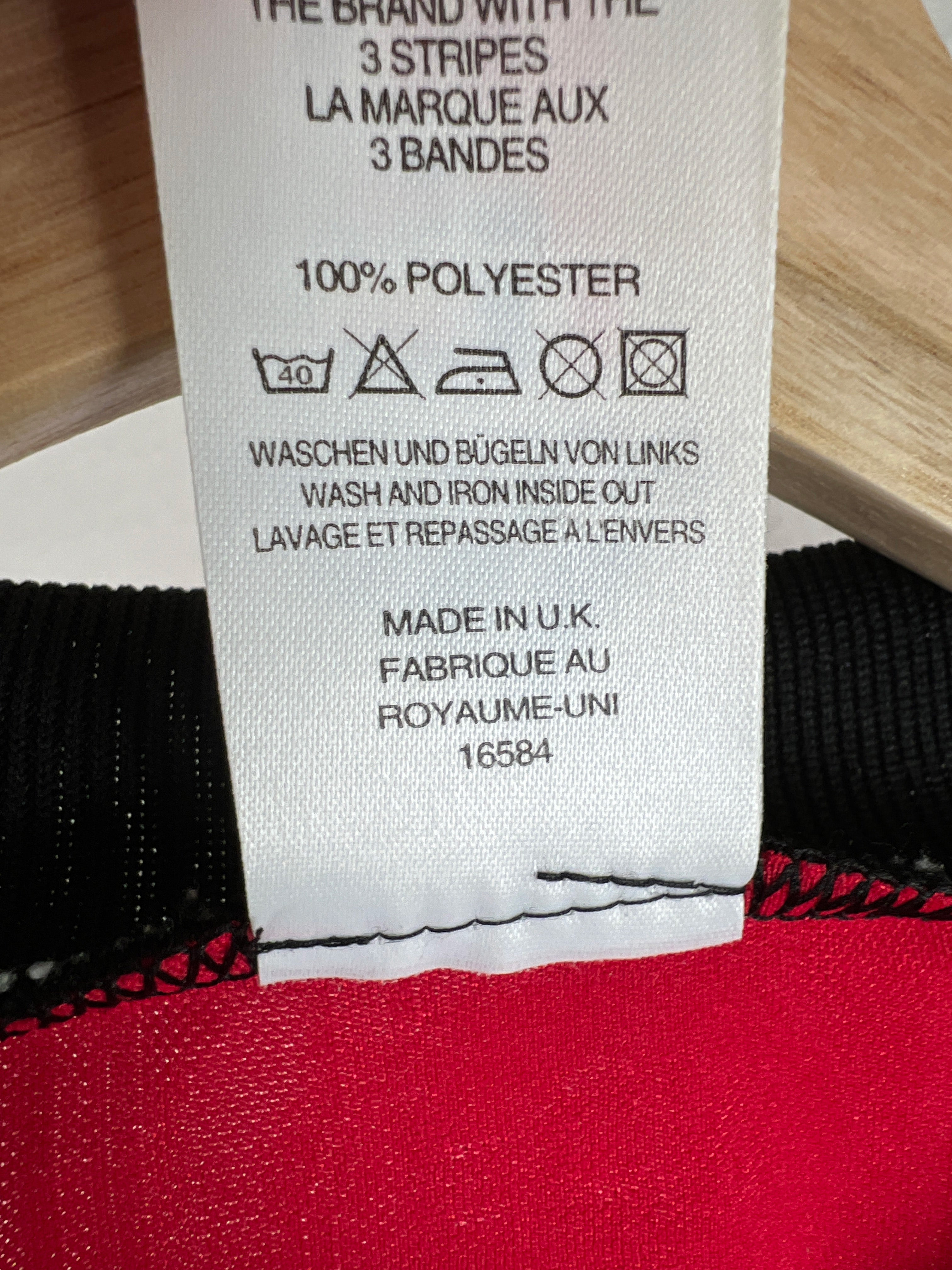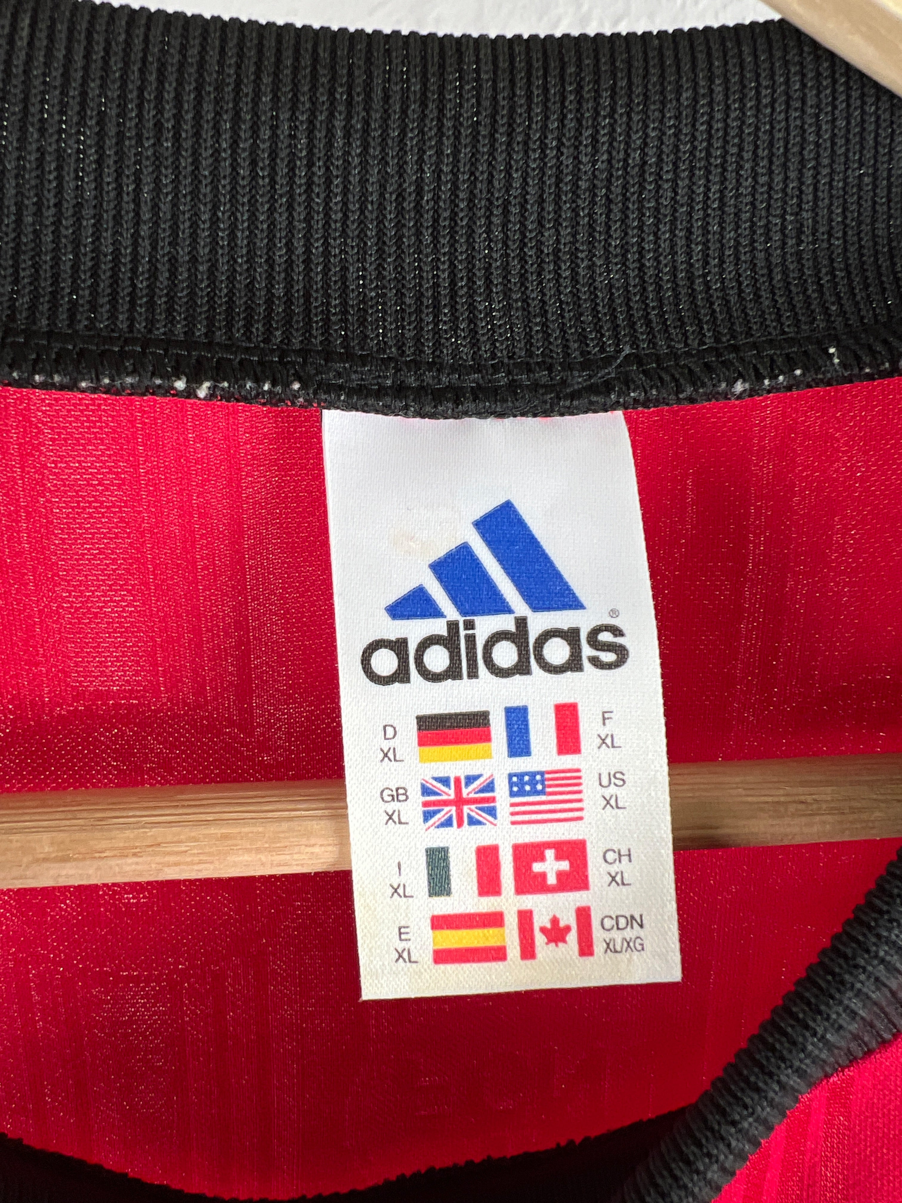 Markantes Design aus den späten 90ern mit auffälligem Jacquardmuster und ikonischem Sponsor. Schwarzer Kontrastärmel, klassische adidas-Streifen und hochwertig gesticktes Vereinslogo.