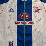 BESONDERHEITEN – Heimtrikot von Hansa Rostock aus der Saison 1999/2000 mit originalem Baumgart-Flock (#27) und Autogrammen des Teams auf der Vorderseite. Klassisches Nike-Design mit Kia-Motors-Sponsor. Besonders selten in dieser Größe und mit Unterschriften – ein echtes Sammlerstück für Hansa- und Bundesliga-Fans.