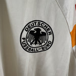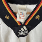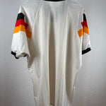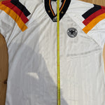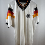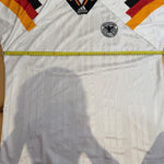 Besonderheiten: Original Heimtrikot der deutschen Nationalmannschaft von 1992 – ikonisches Design mit dem markanten Balken-Muster in Schwarz-Rot-Gold. Klassiker der frühen 90er und ein beliebtes Sammlerstück