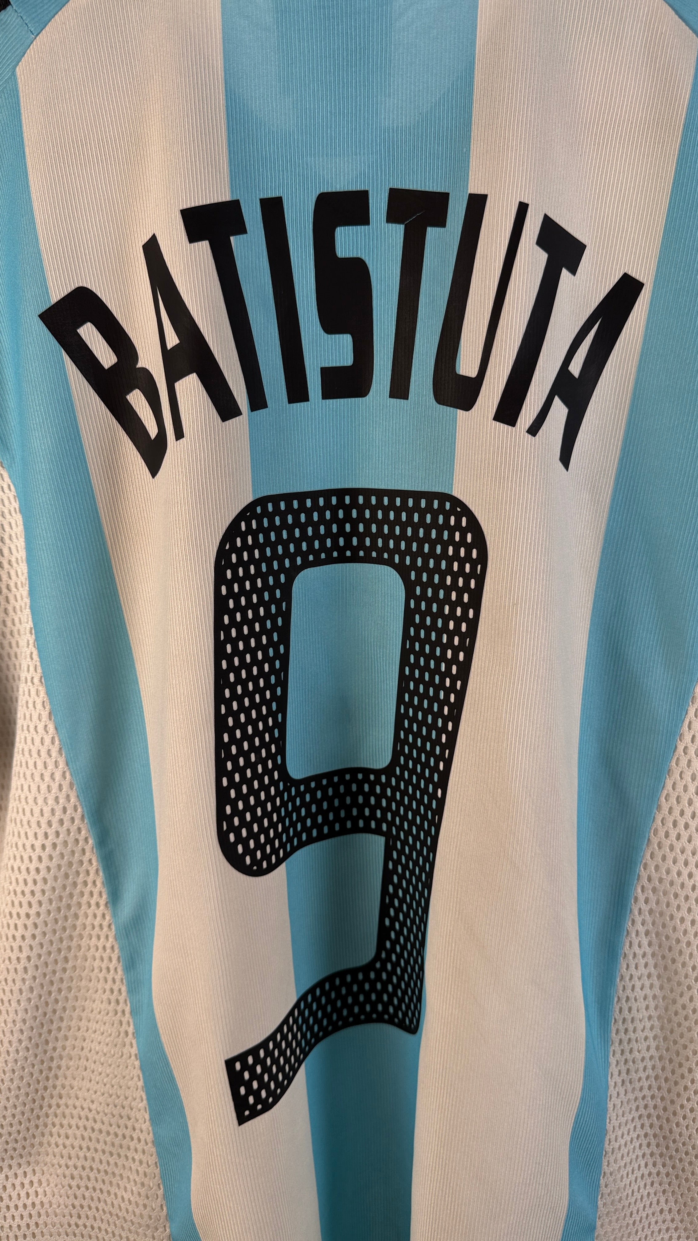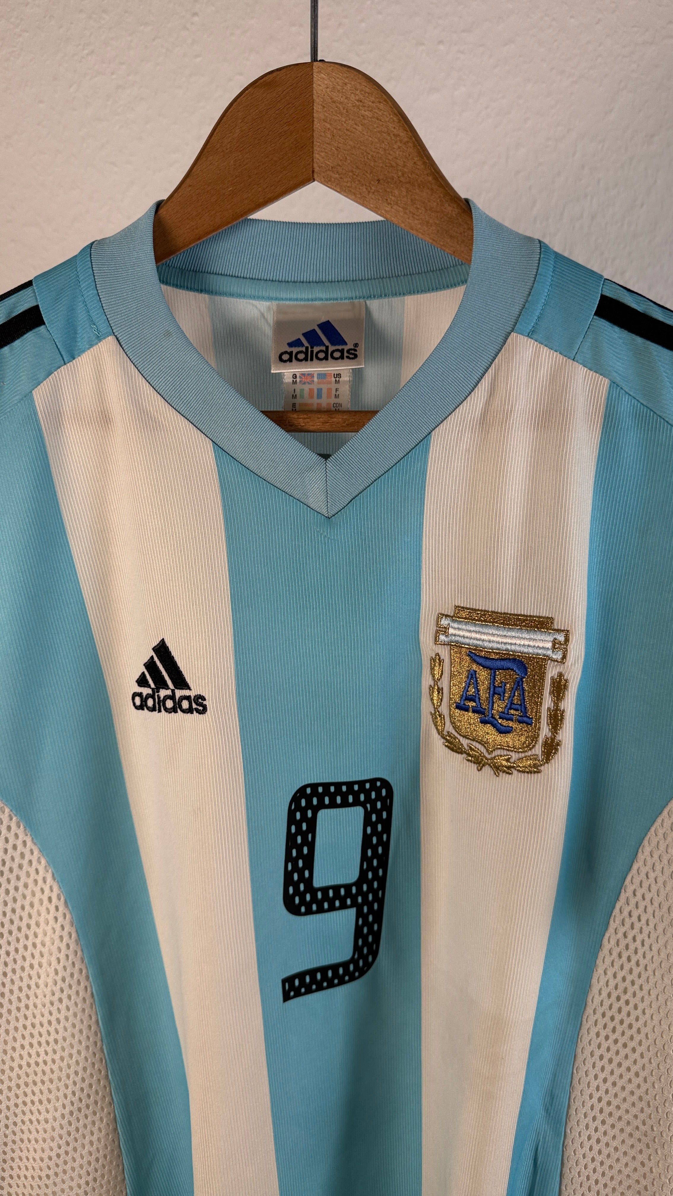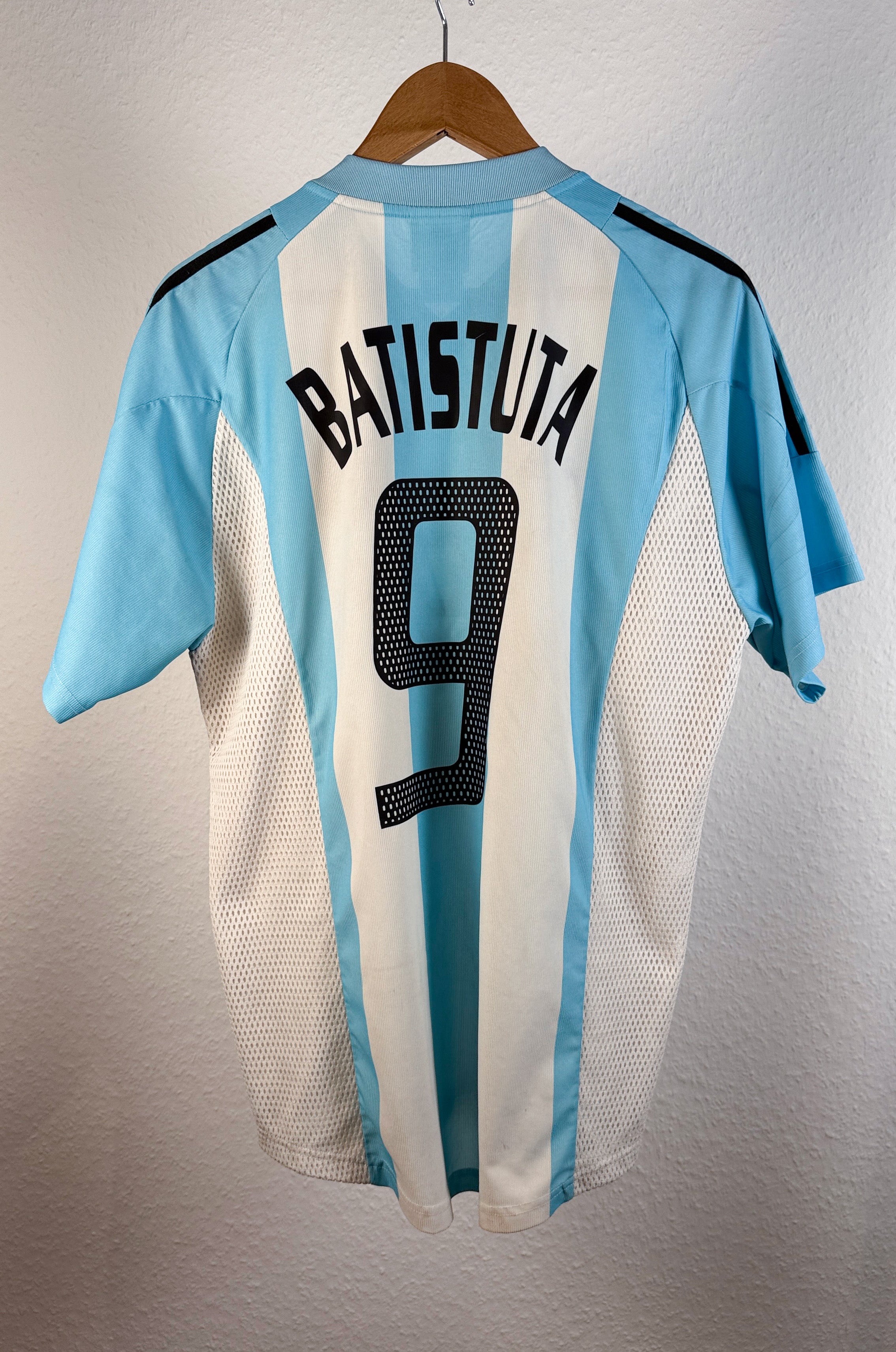 BESONDERHEITEN – Heimtrikot der „Albiceleste“ aus der WM 2002 in Japan & Südkorea mit originaler Beflockung von Gabriel Batistuta #9, einer der größten Stürmer der argentinischen Fußballgeschichte. Klassisches Adidas-Design in Hellblau-Weiß – ein starkes Sammlerstück trotz kleiner Mängel.