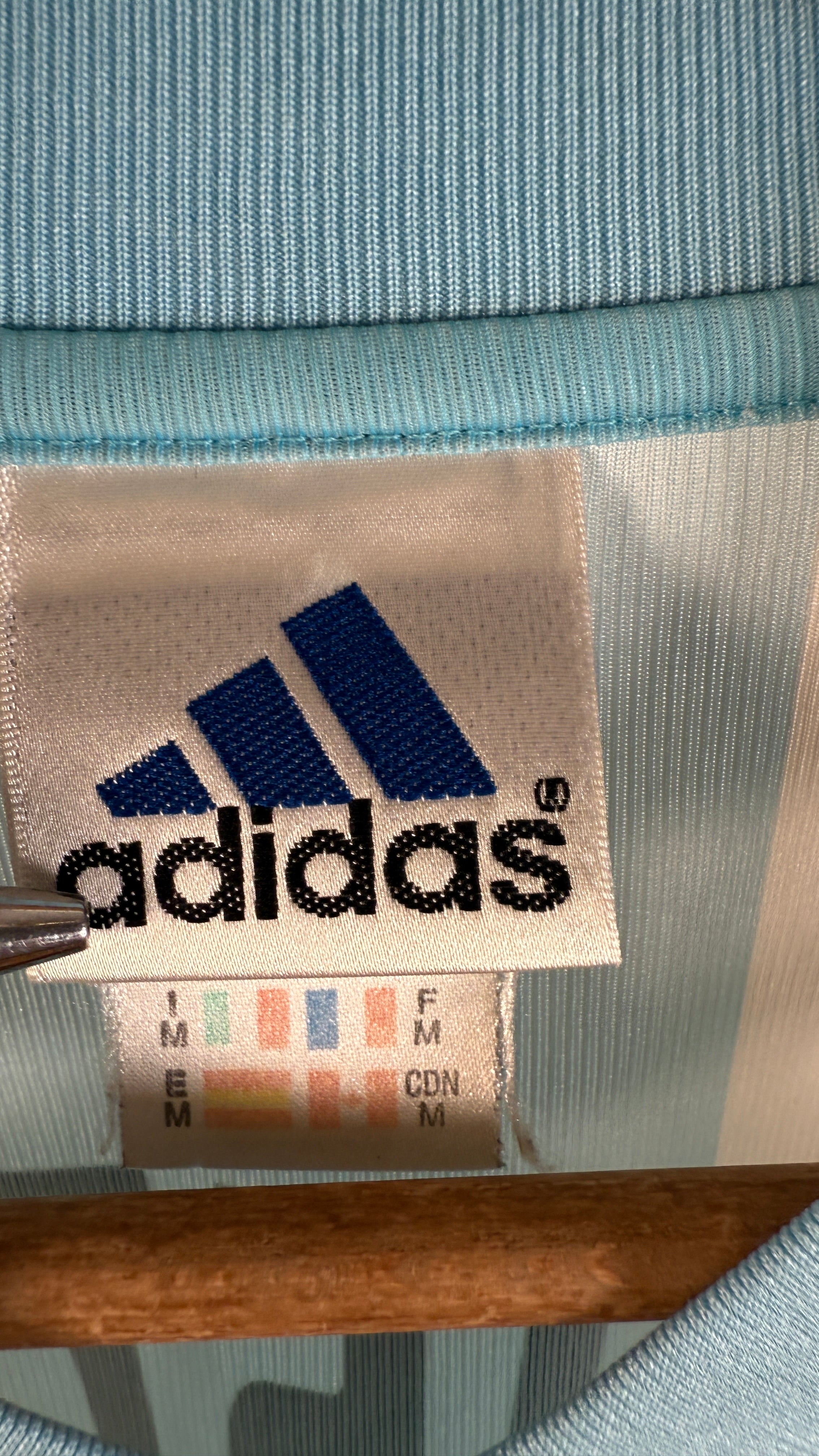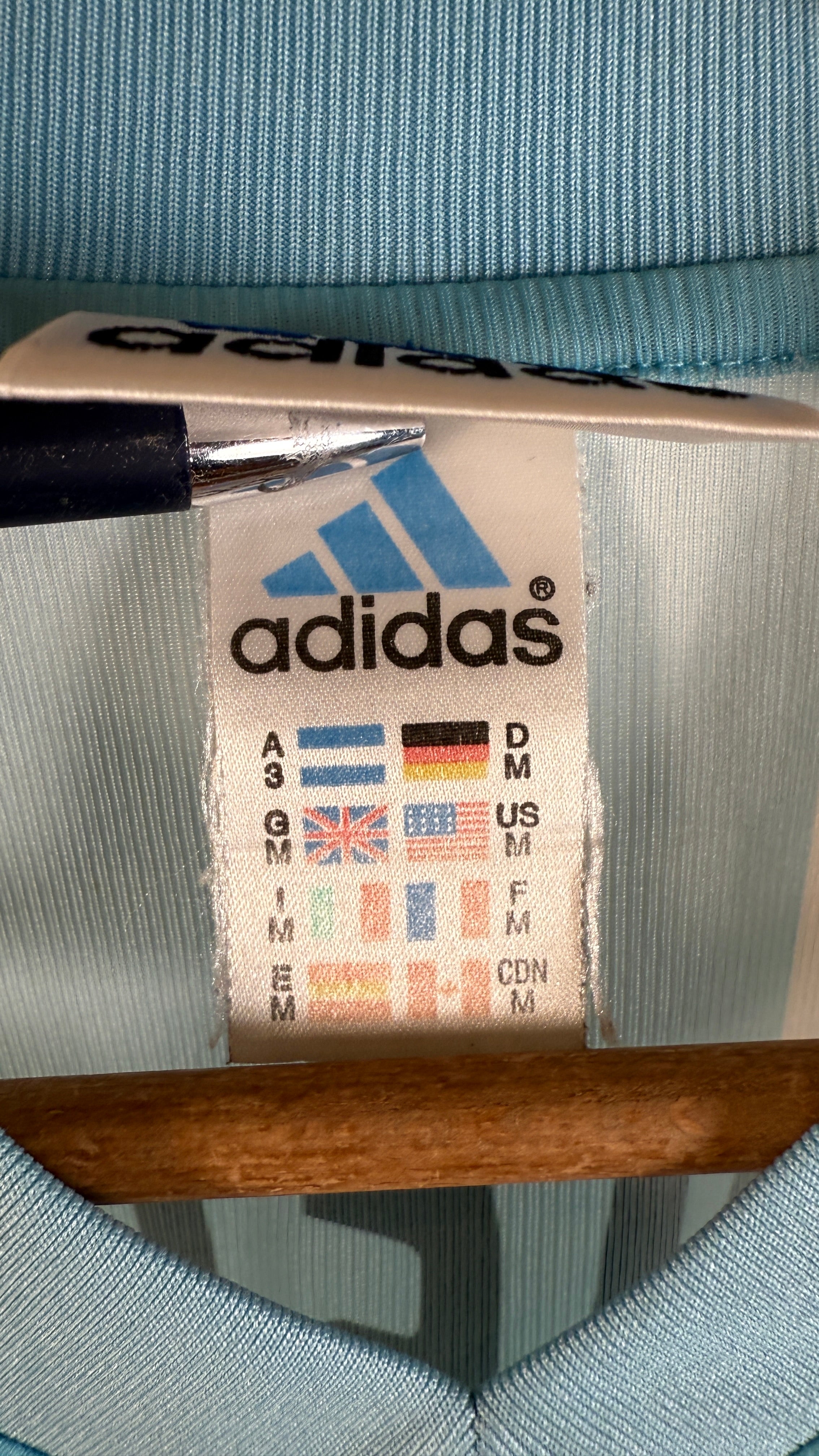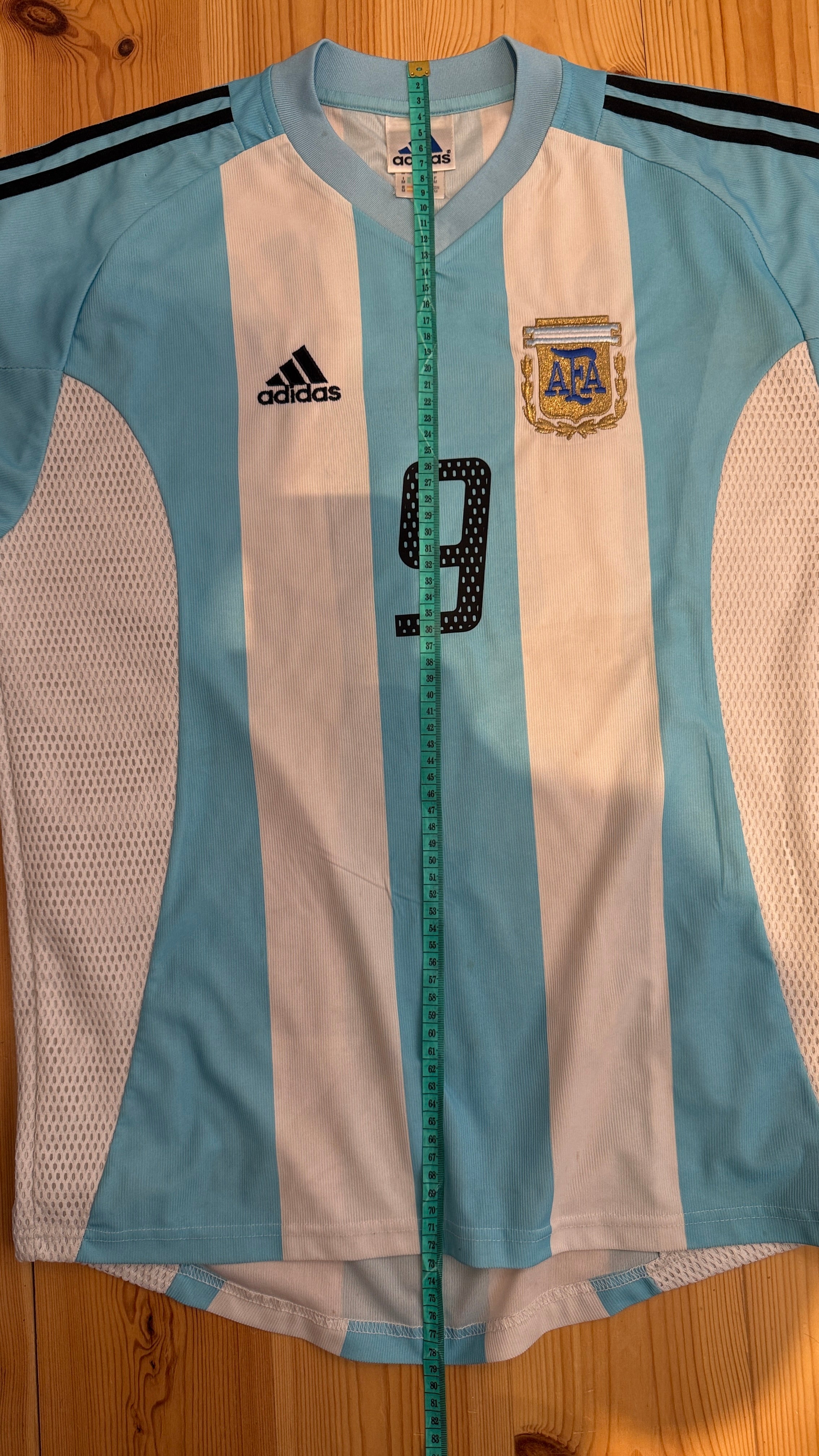 BESONDERHEITEN – Heimtrikot der „Albiceleste“ aus der WM 2002 in Japan & Südkorea mit originaler Beflockung von Gabriel Batistuta #9, einer der größten Stürmer der argentinischen Fußballgeschichte. Klassisches Adidas-Design in Hellblau-Weiß – ein starkes Sammlerstück trotz kleiner Mängel.