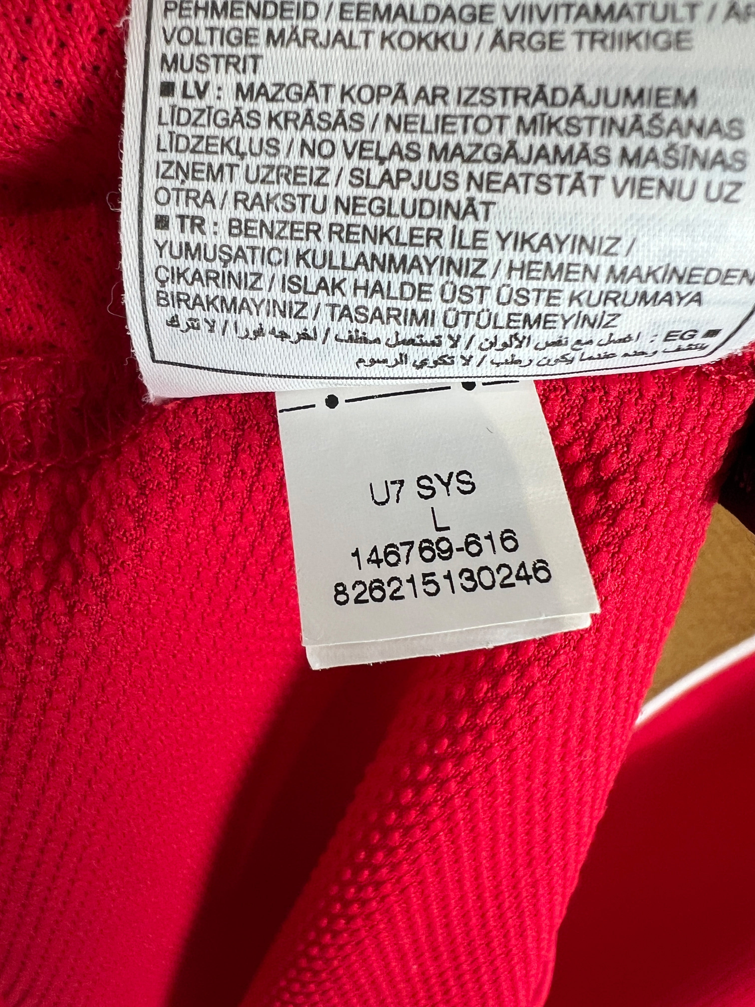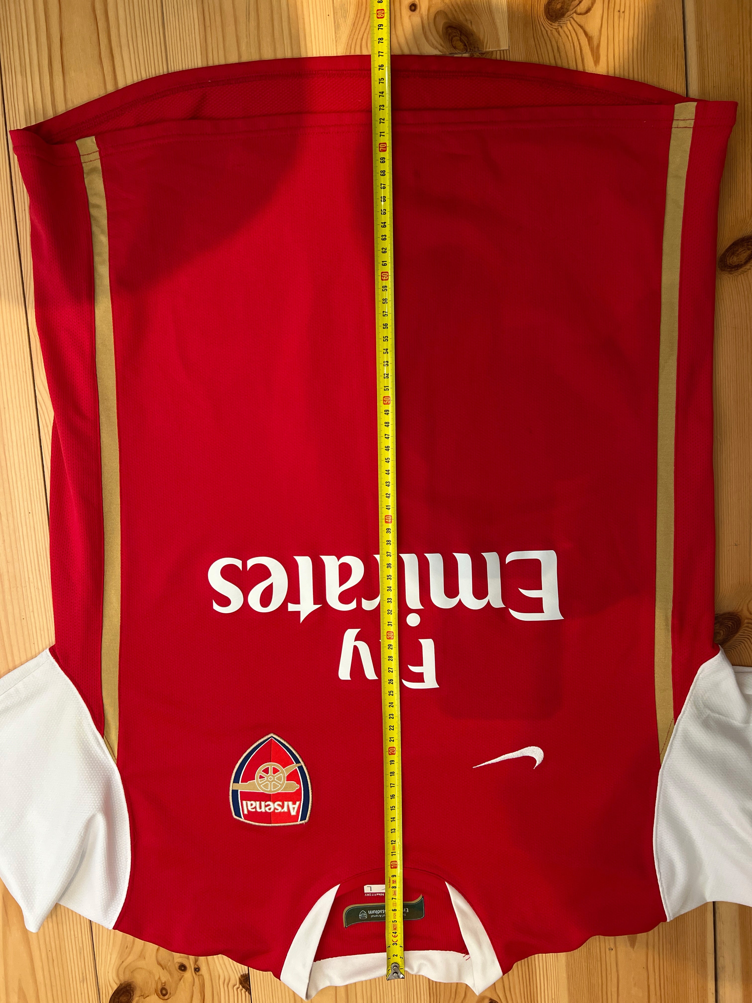 Besonderheiten: Champions League Edition. Das Trikot ist mit dem klassischen Arsenal Wappen und einem großen Sponsorenlogo versehen. Spielername und Nummer sind auf der Rückseite in goldener Schrift.
