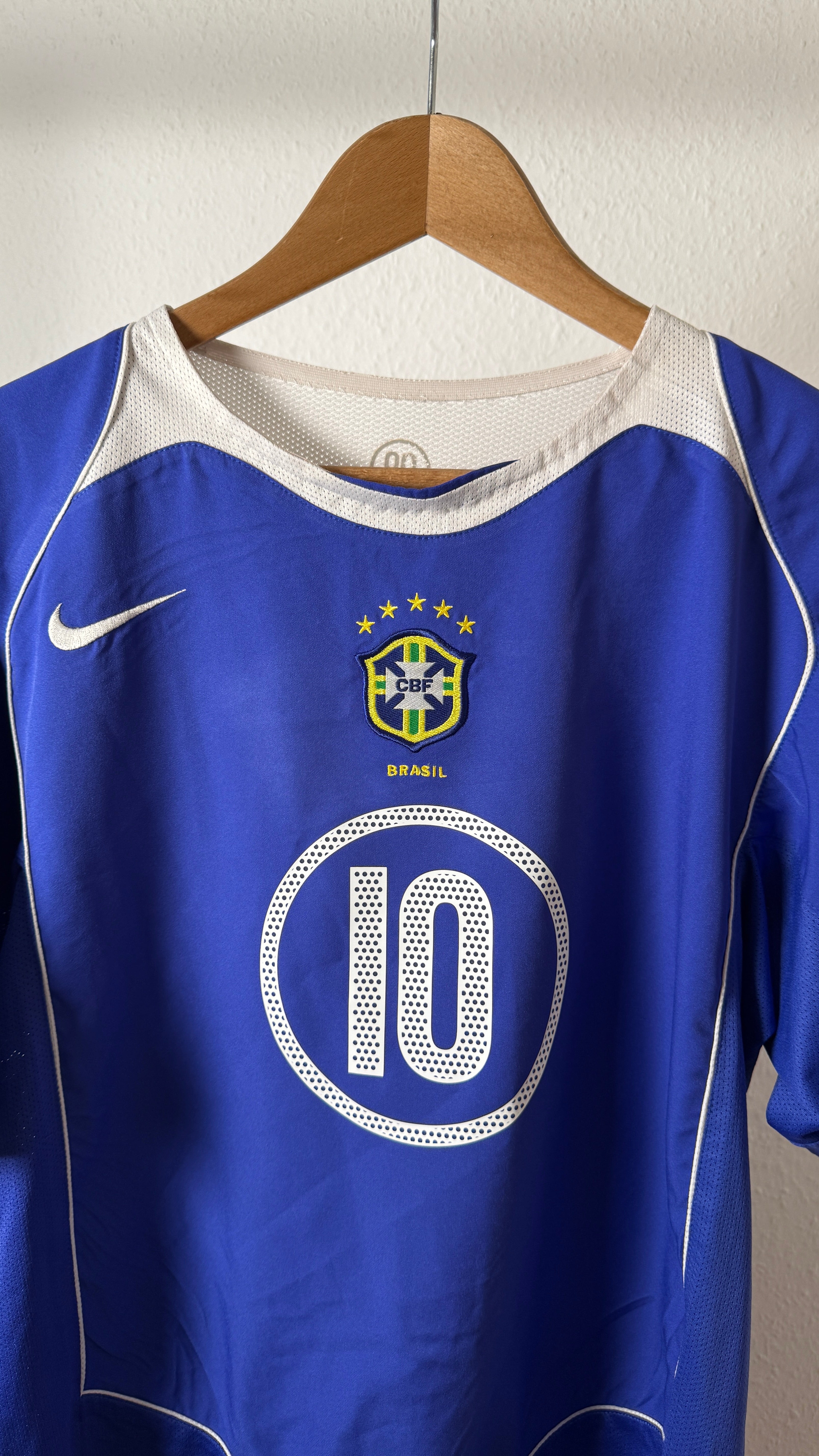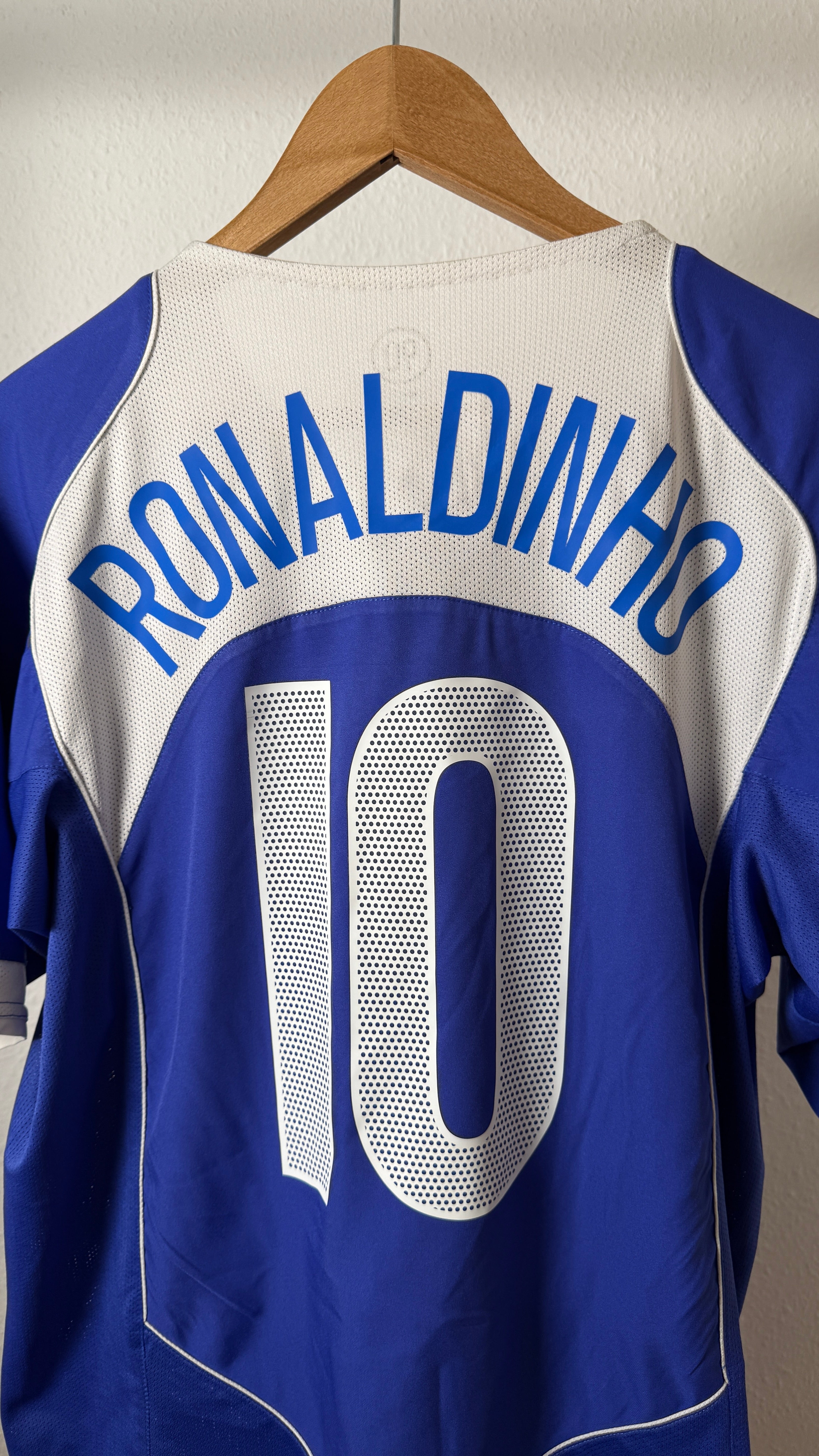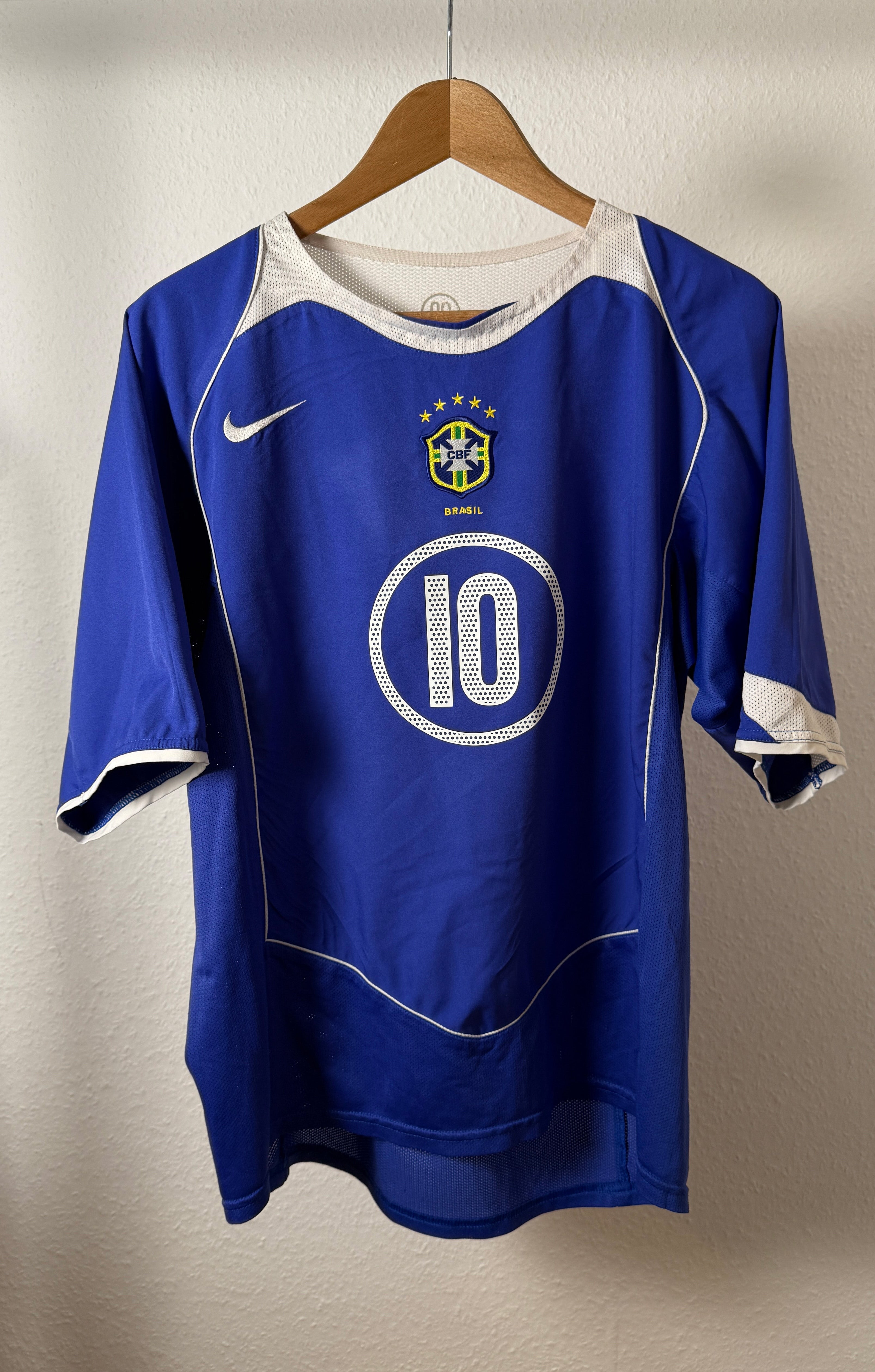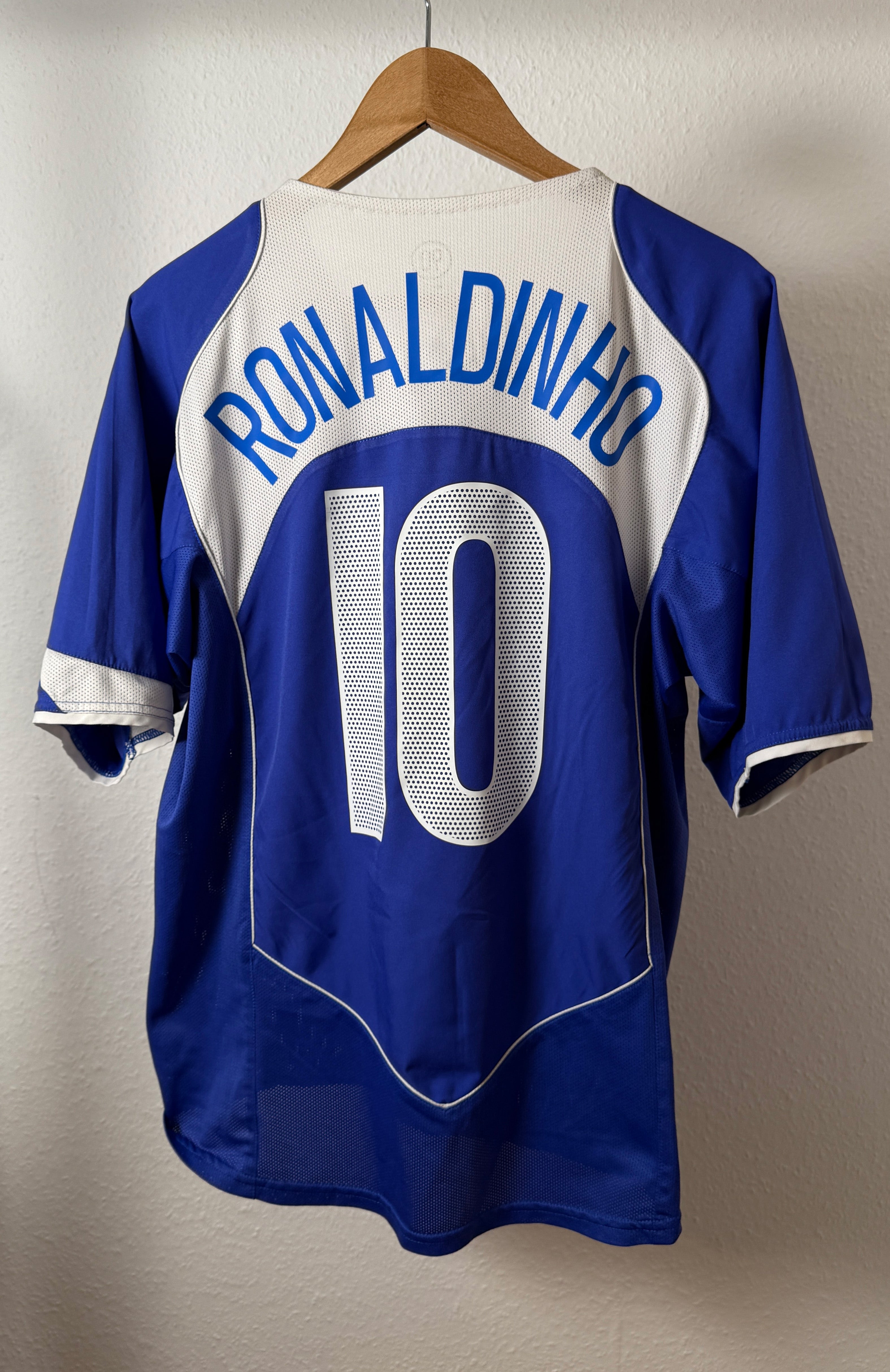 Original Brasilien Auswärtstrikot 2004 von Nike mit Ronaldinho (#10) – absolute Fußballlegende und einer der größten Brasilianer aller Zeiten. Starkes Vintage-Trikot aus den frühen 2000ern und ein echtes Sammlerstück für Seleção-Fans und Trikot-Sammler.