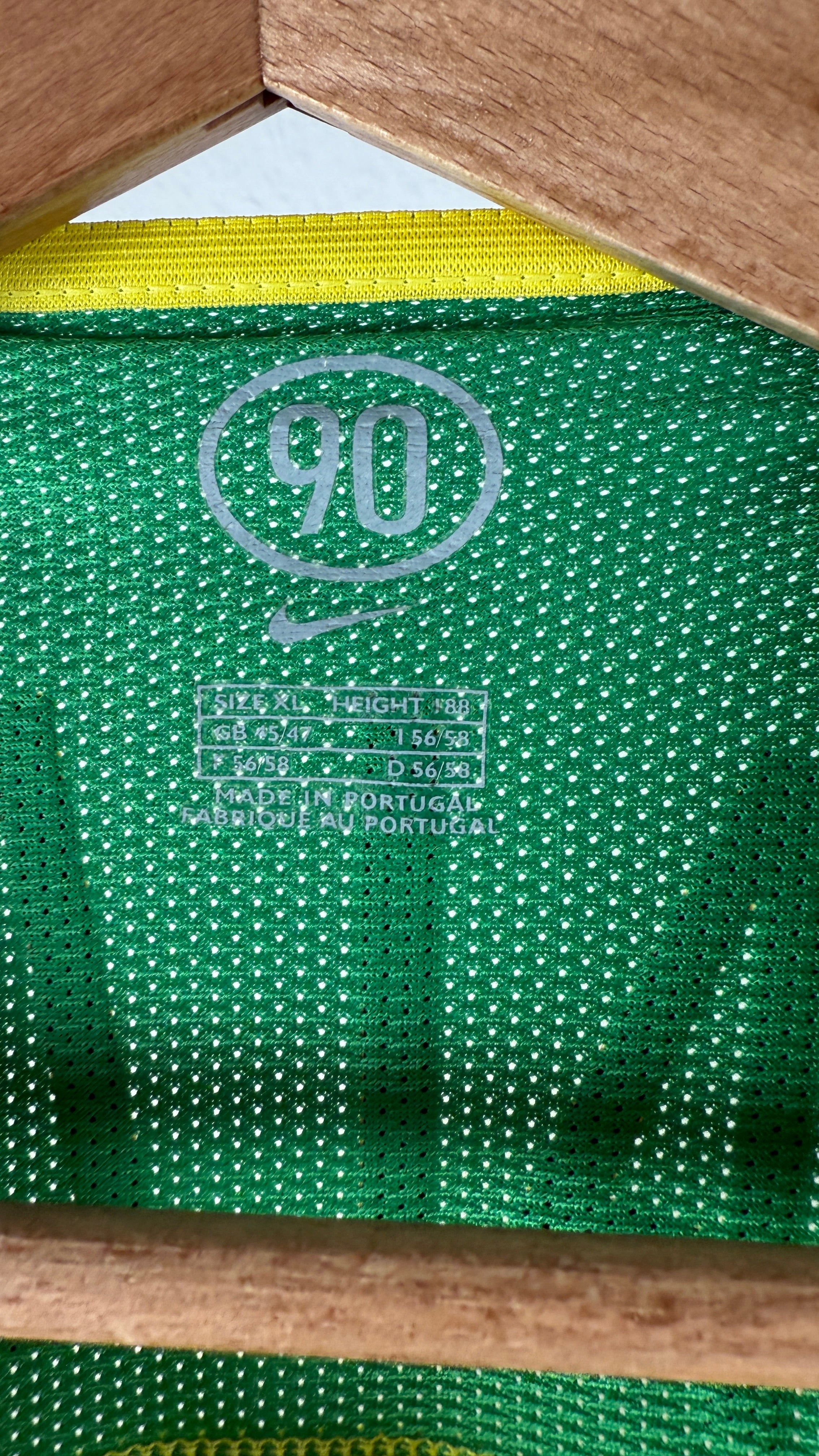 Schlichtes, ikonisches Nike-Design mit grünem Rundkragen und gesticktem Wappen – getragen in der goldenen Ära der Seleção.