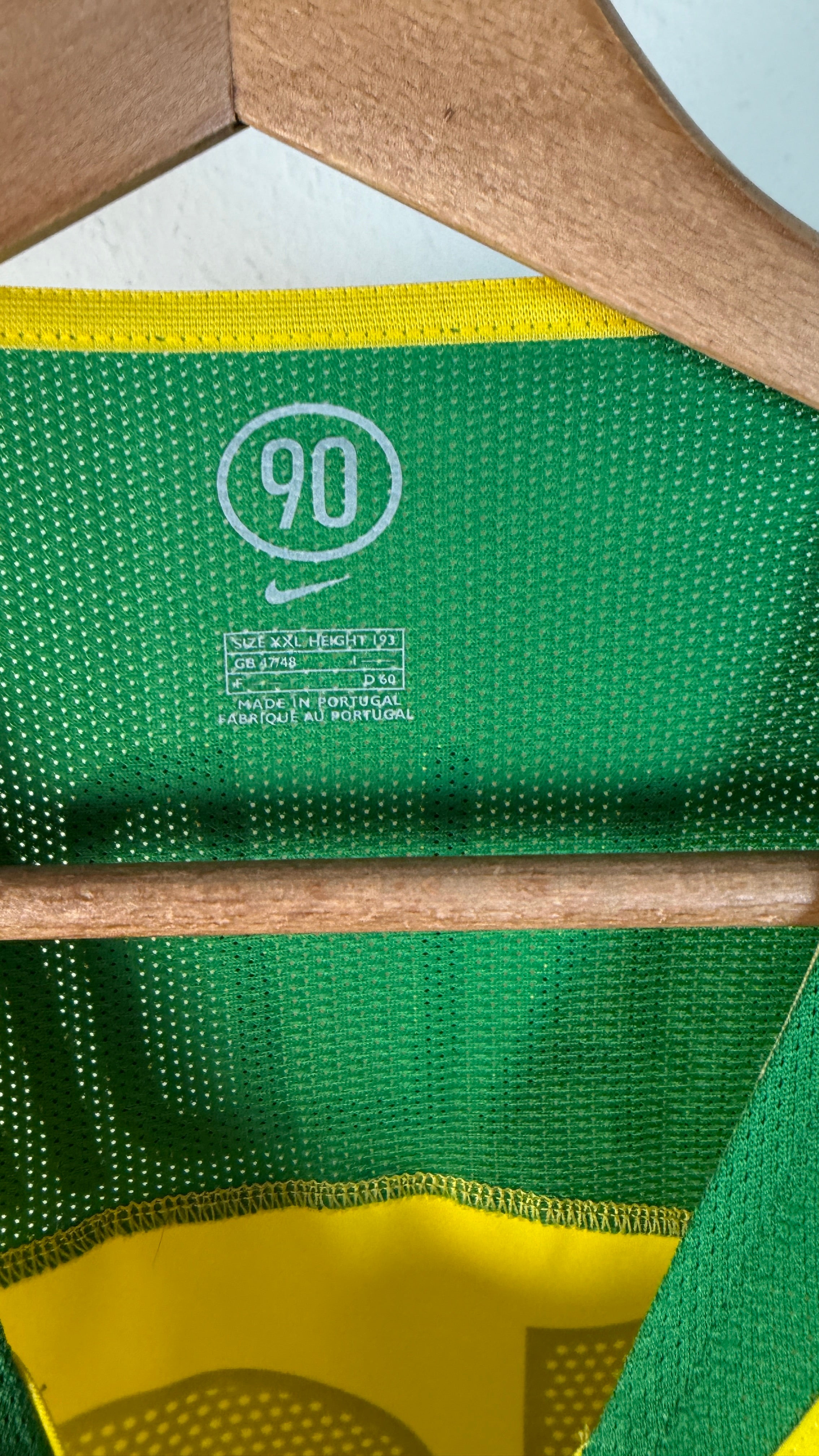 Schlichtes, ikonisches Nike-Design mit grünem Rundkragen und gesticktem Wappen – getragen in der goldenen Ära der Seleção.