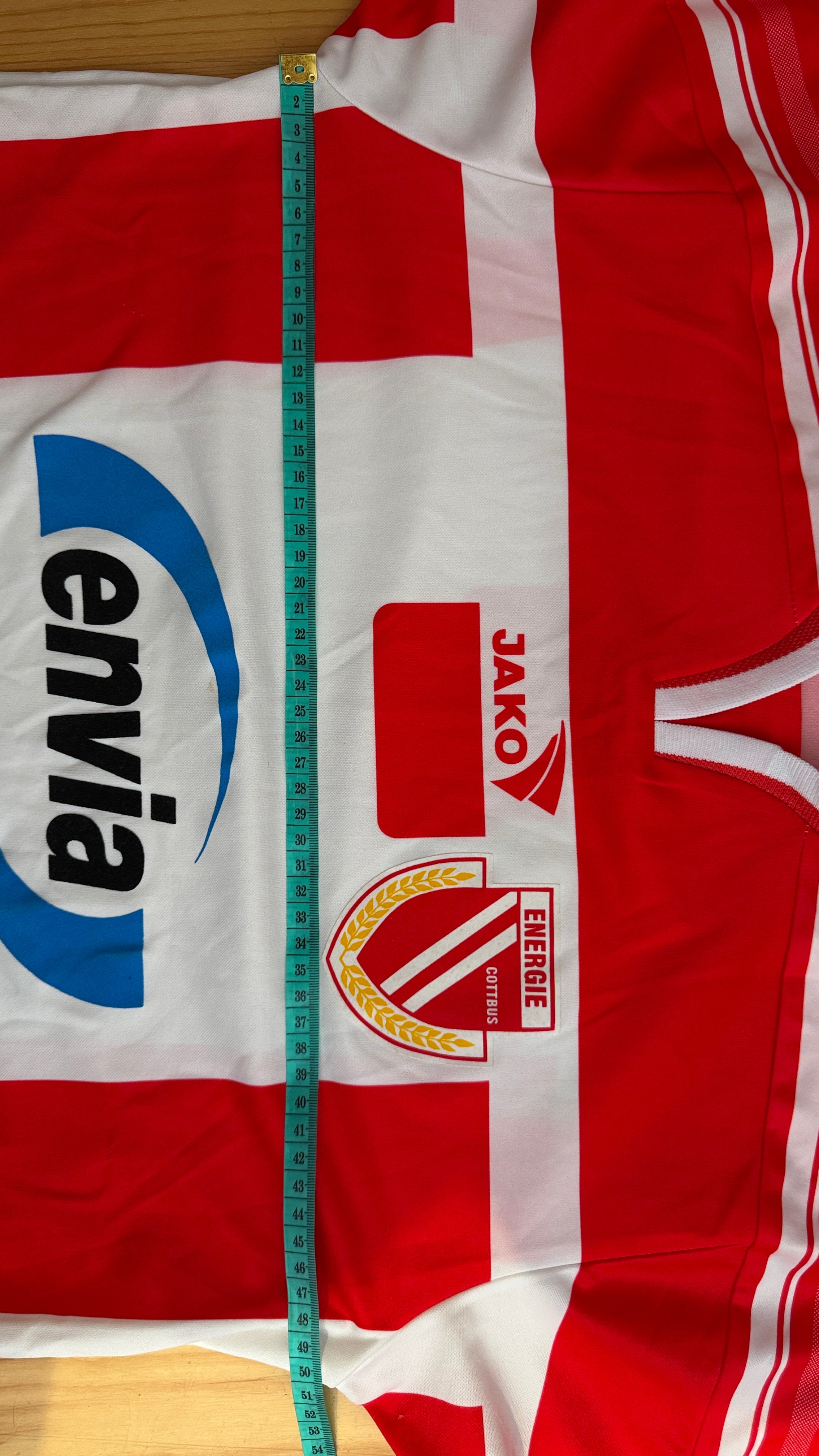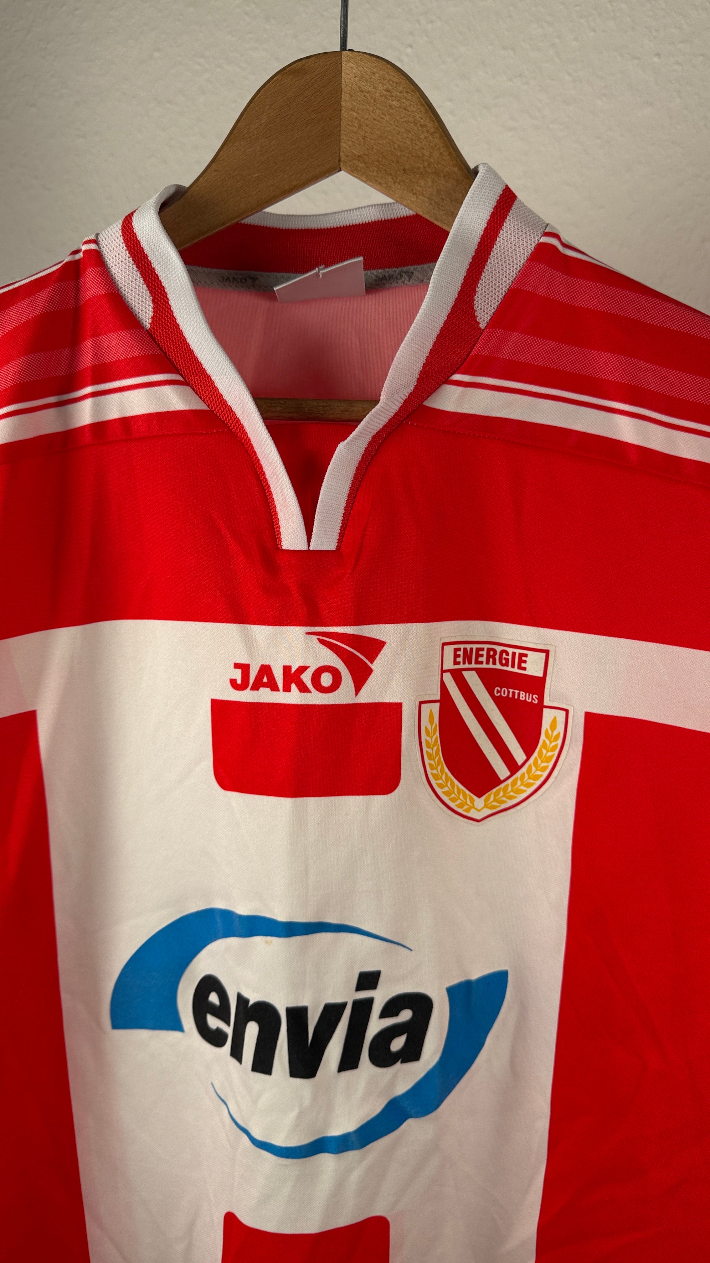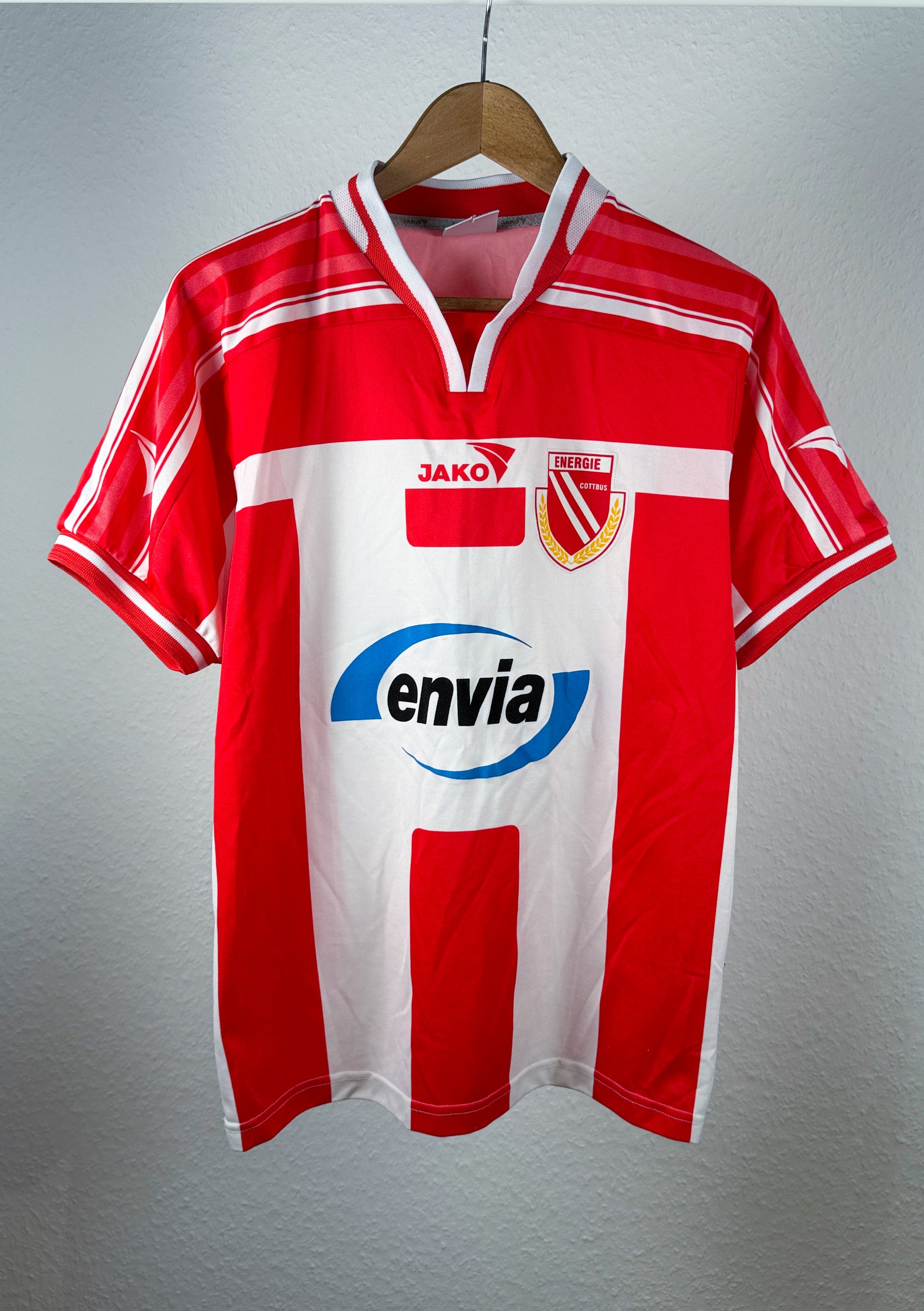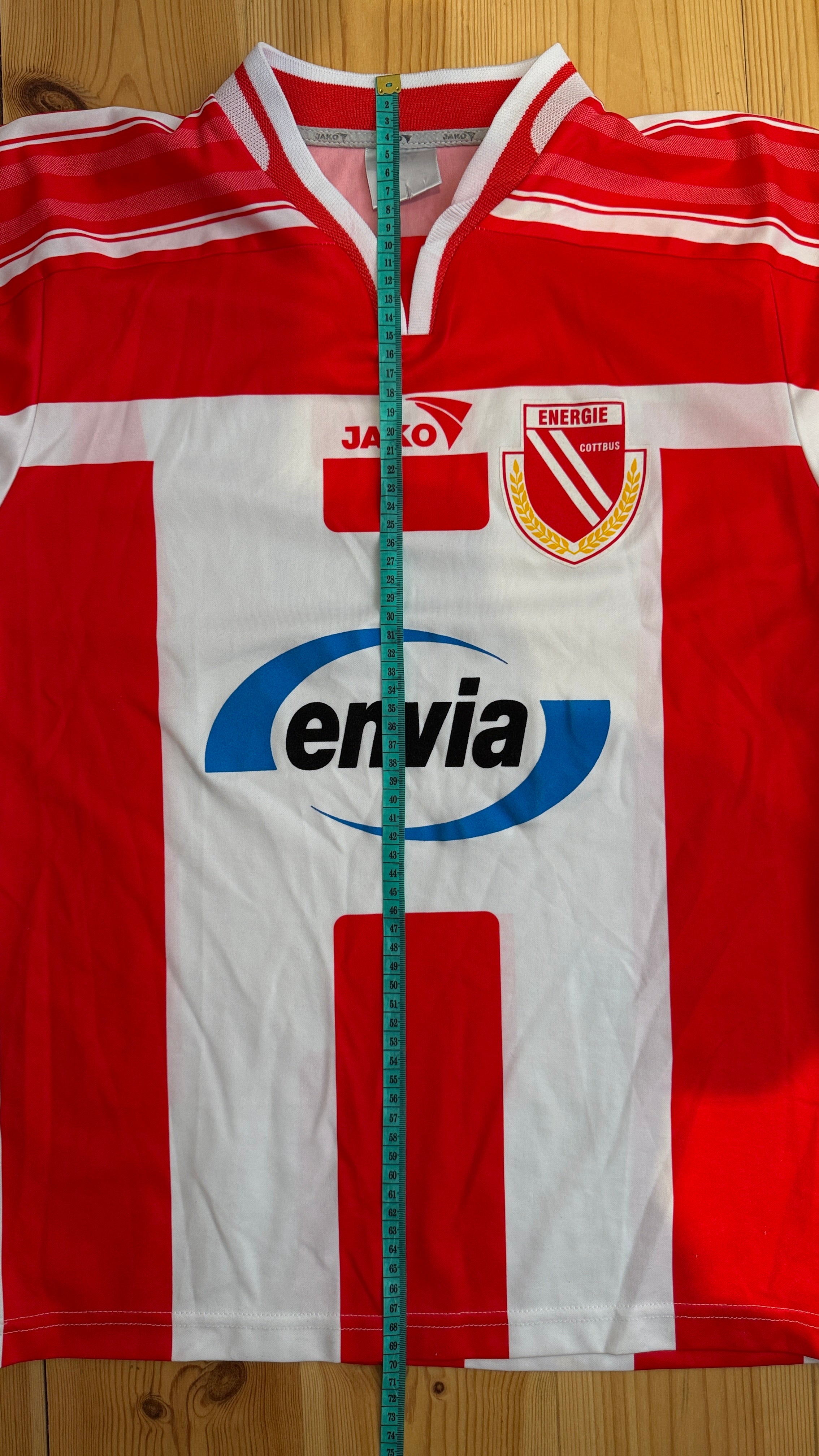 BESONDERHEITEN – Heimtrikot von Energie Cottbus aus der Bundesliga-Saison 2001/02 mit envia-Sponsor. Klassisches Jako-Design der frühen 2000er – seltenes Sammlerstück für Energie-Fans.