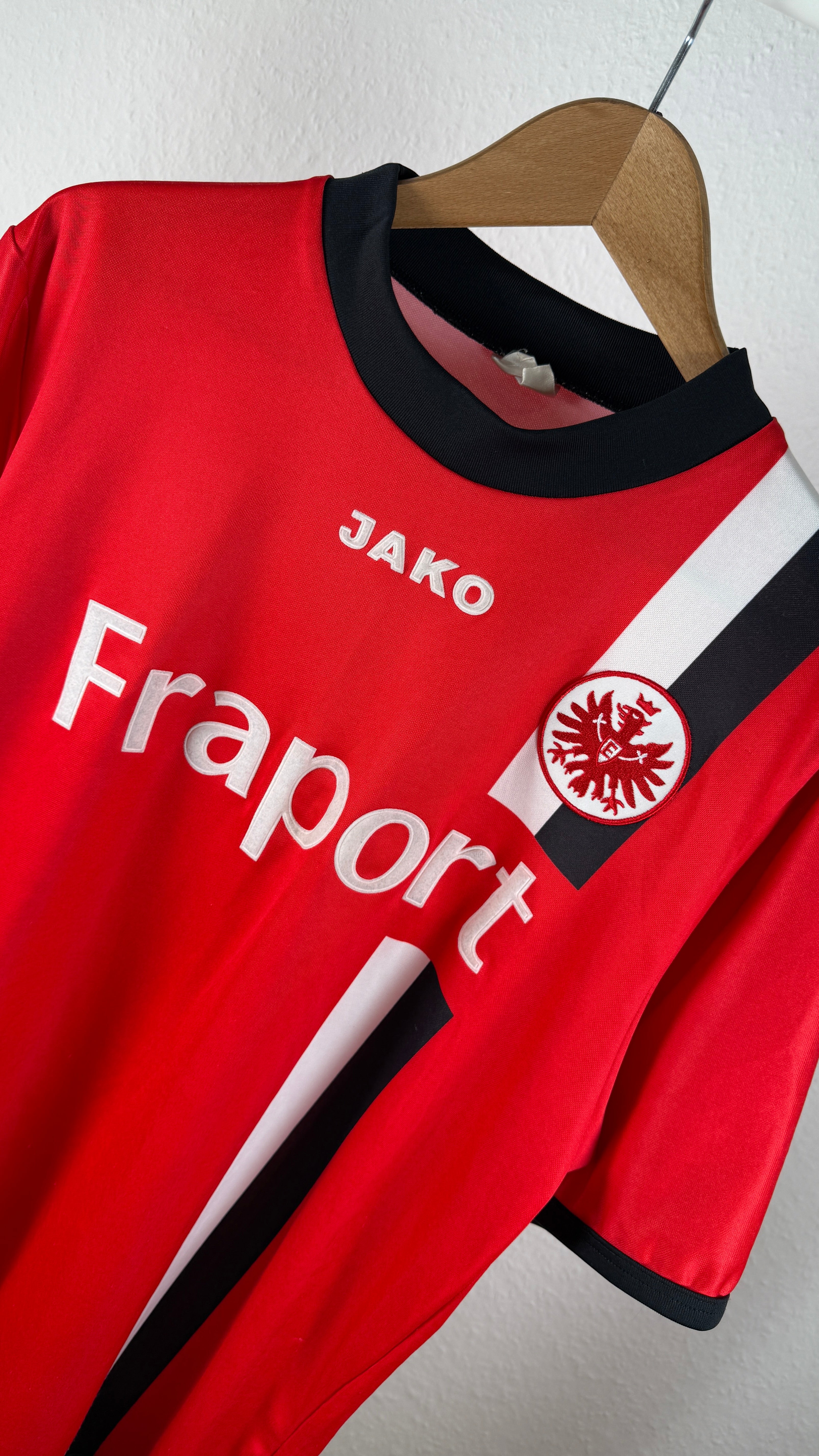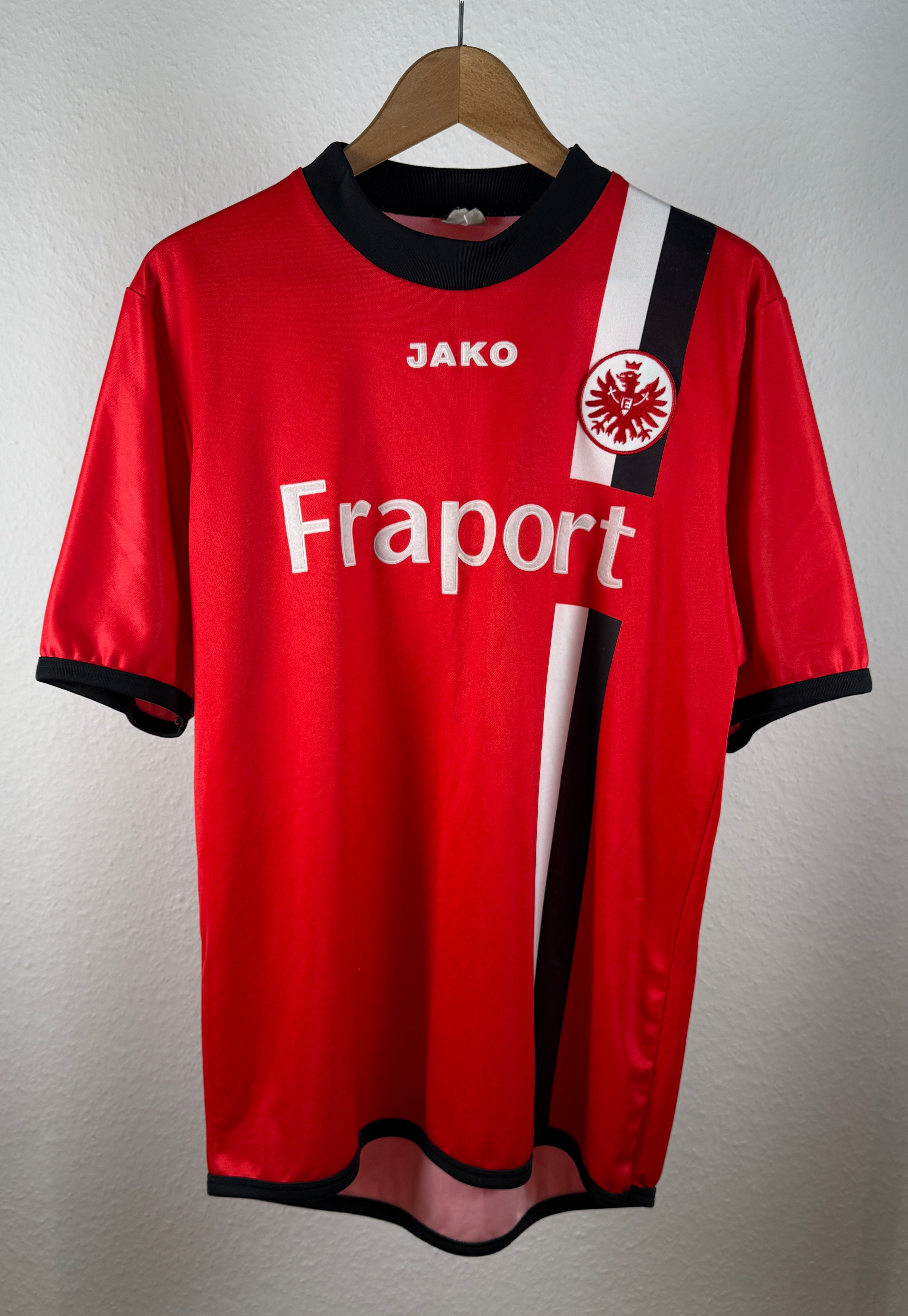 Original Heimtrikot von Eintracht Frankfurt aus der Saison 2005/06. Klassisches Design in Rot-Schwarz mit Fraport-Sponsor.