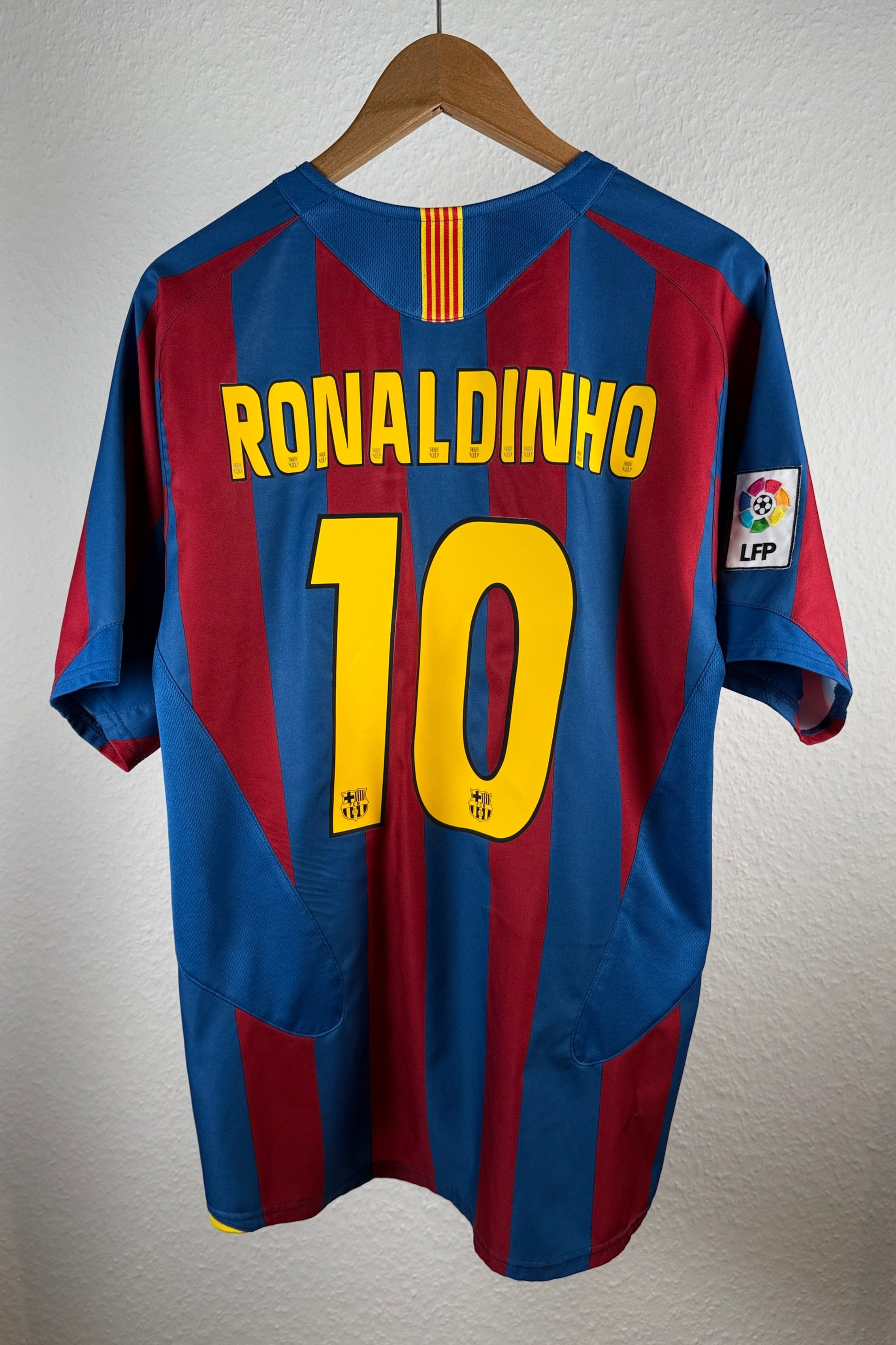 Originales Heimtrikot des FC Barcelona aus der Saison 2005/06, mit offiziellem Ronaldinho-Flock (#10) auf dem Rücken und LFP-Patch auf dem Ärmel.