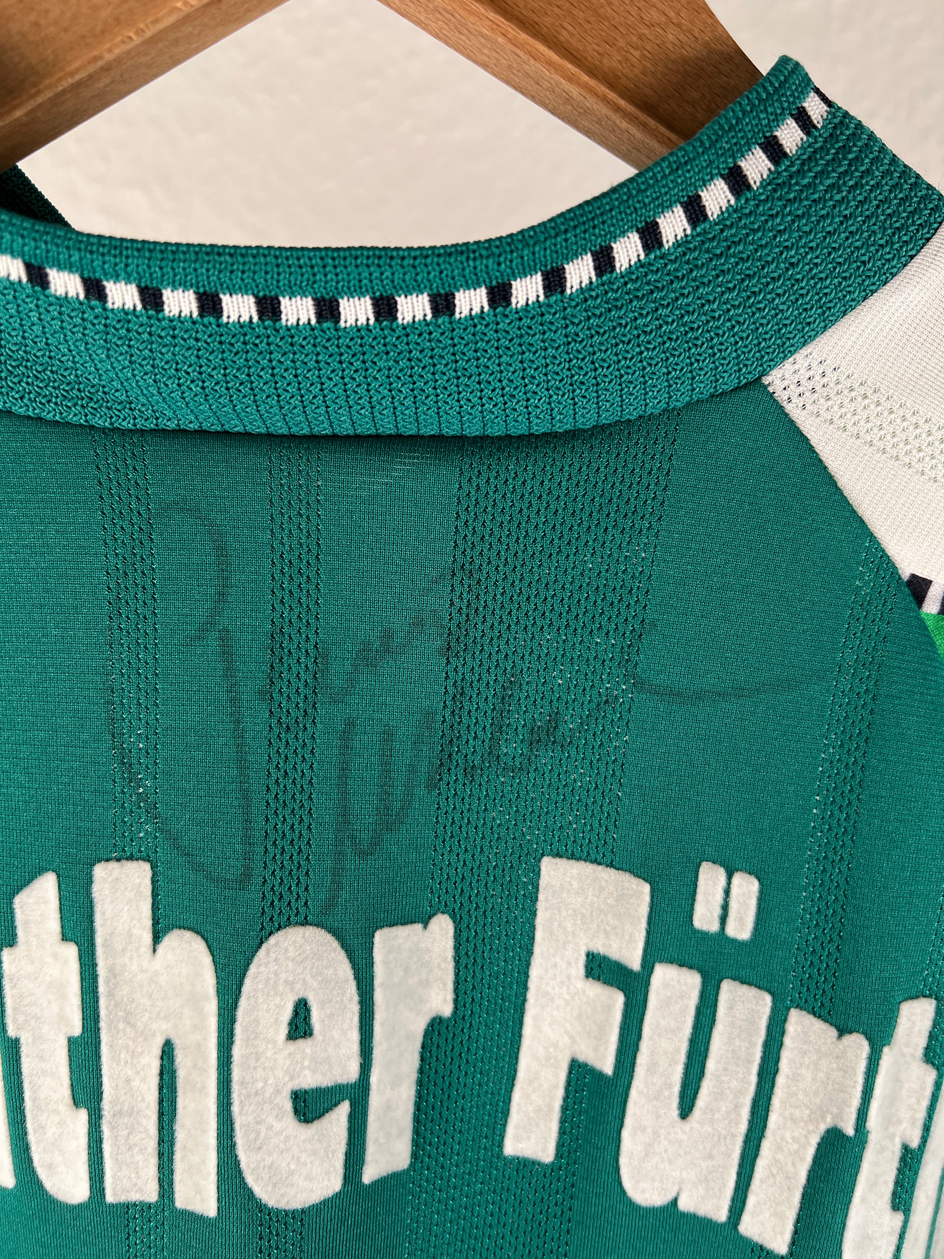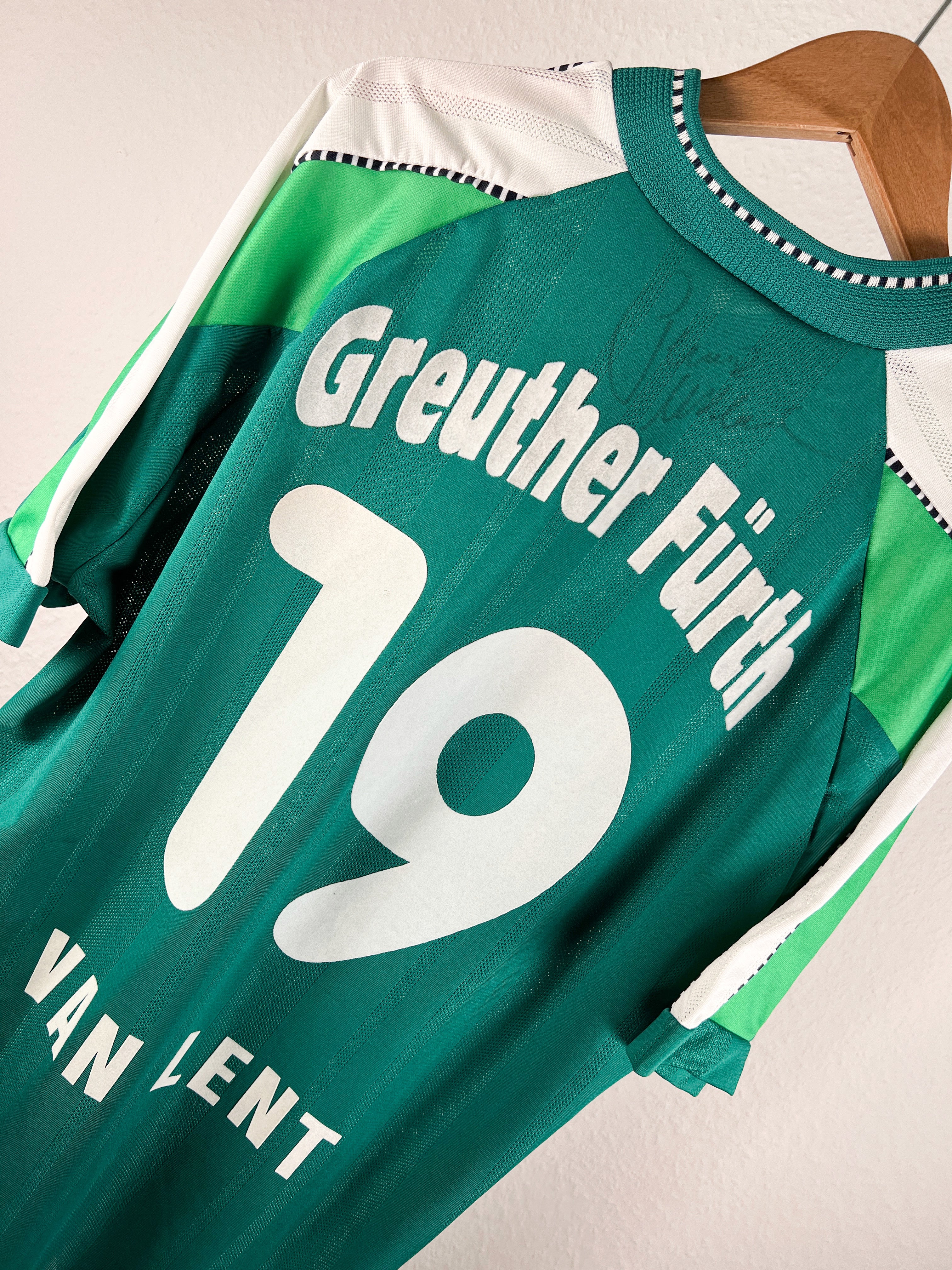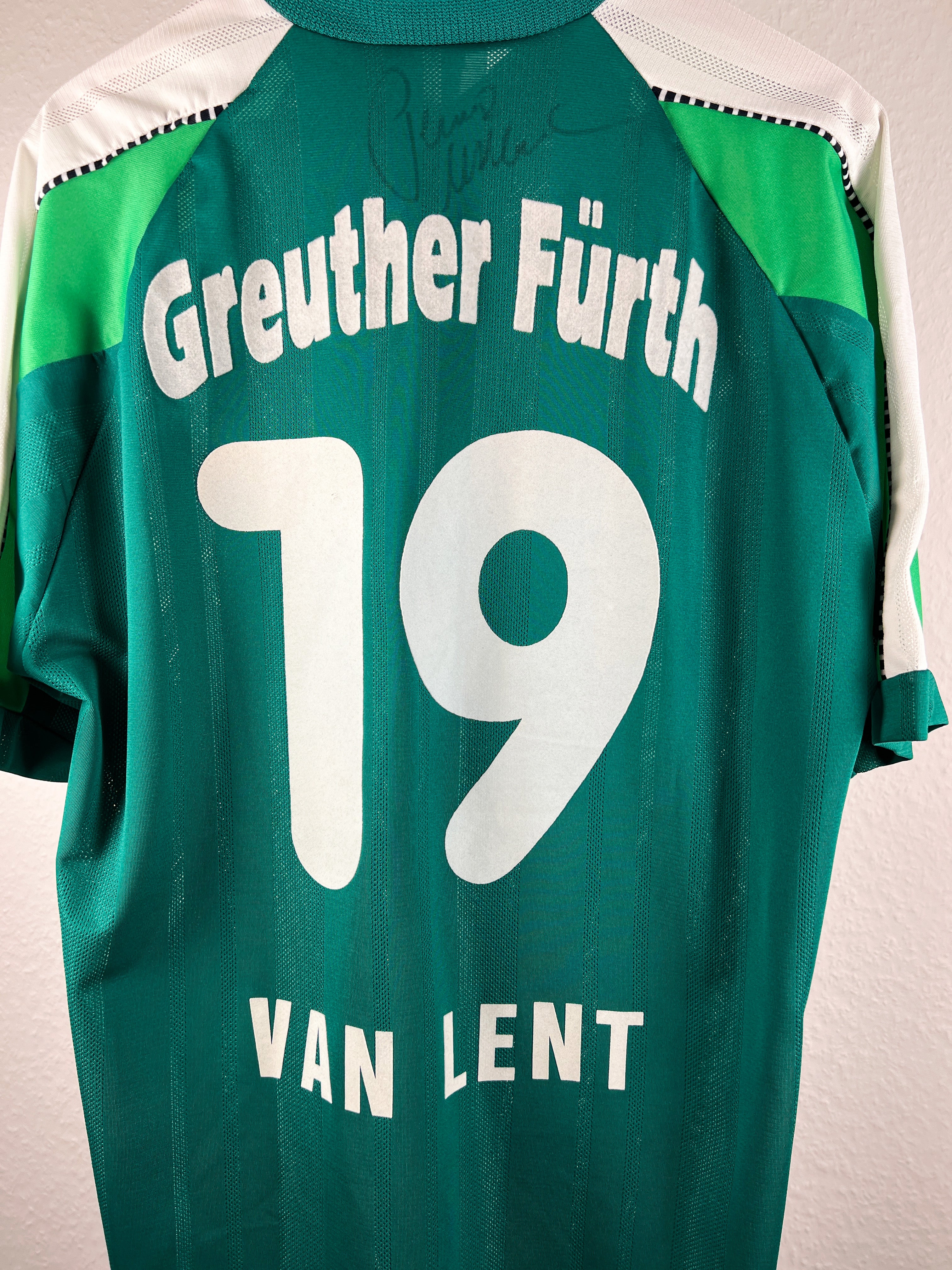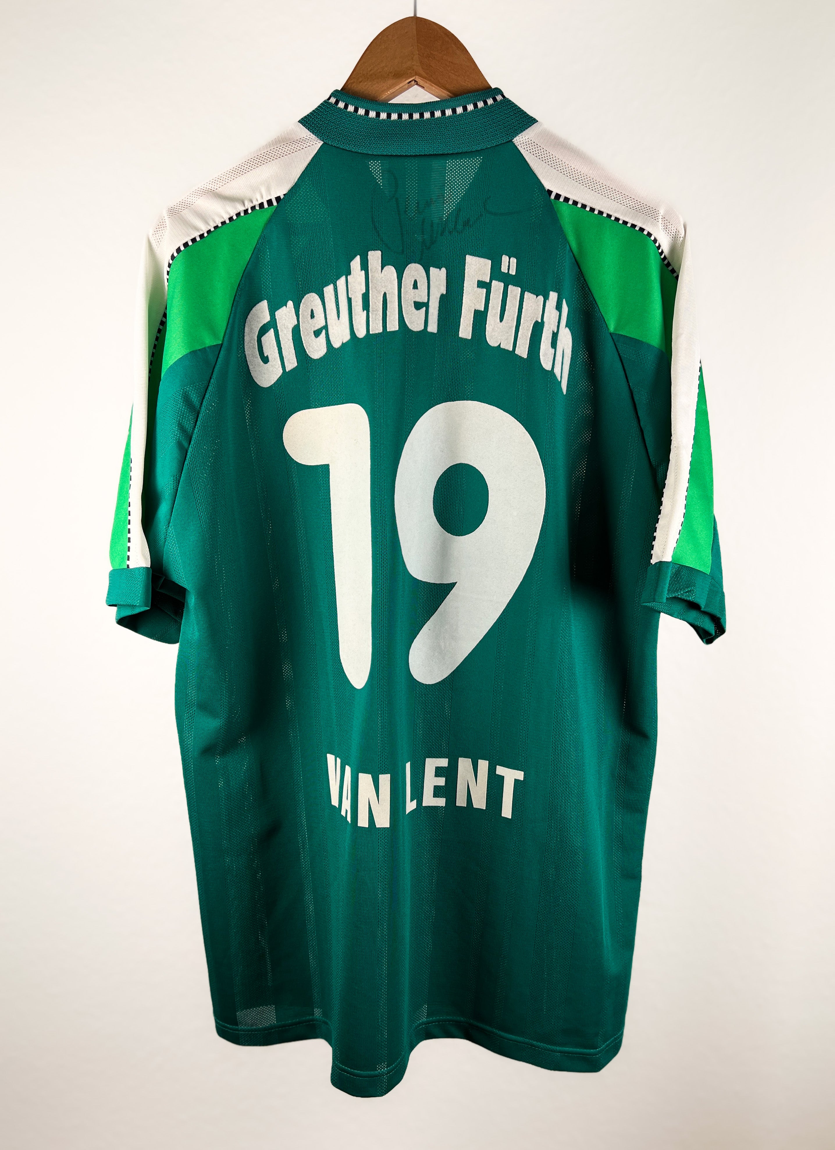 Original Vintage-Trikot des Greuther Fürth aus der Saison 1997/98. Trikot mit der Nummer #19 von Van Lent, signiert. Ein echtes Sammlerstück für Fans des Vereins und Sammler von signierten Trikots!