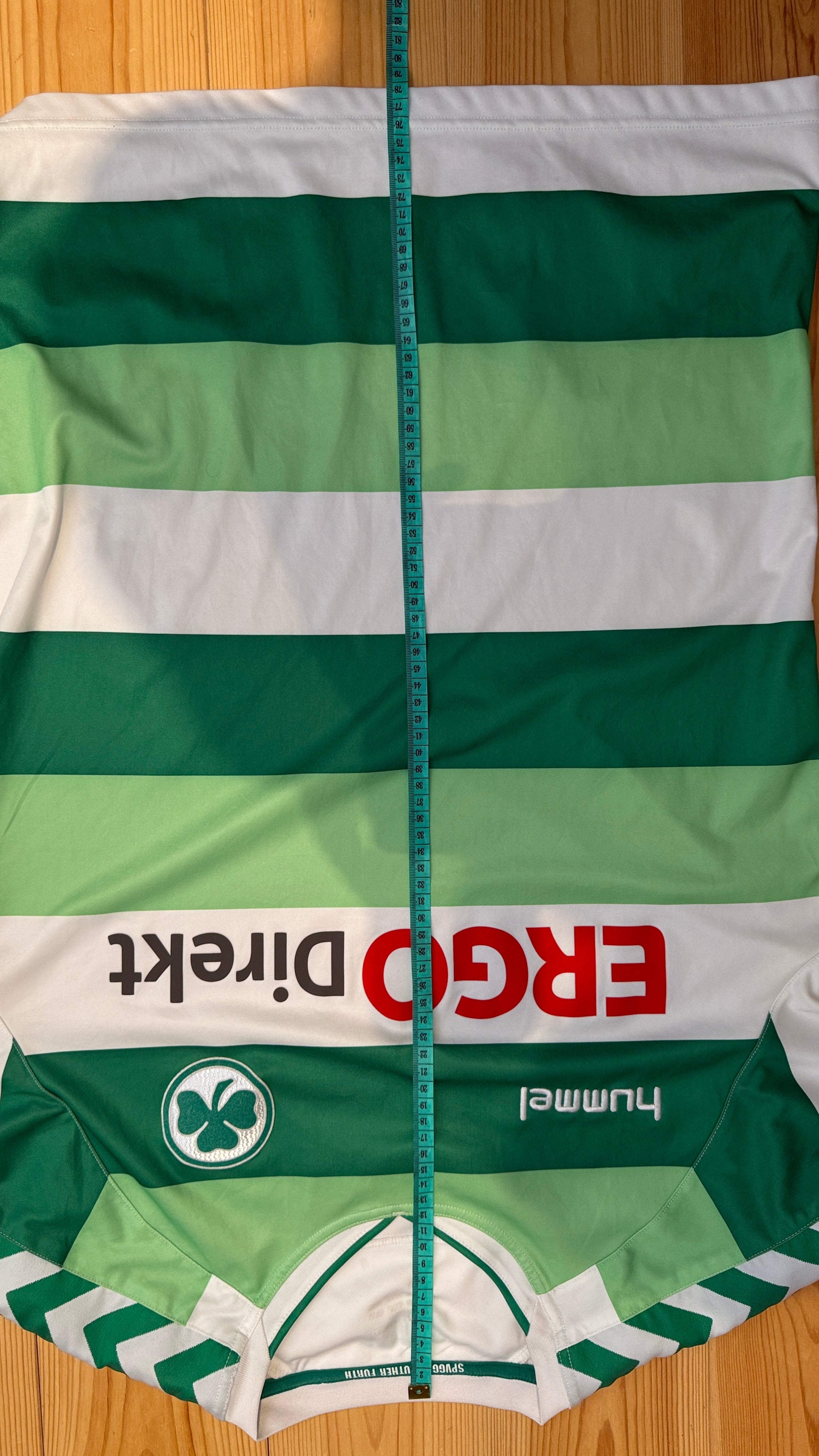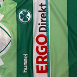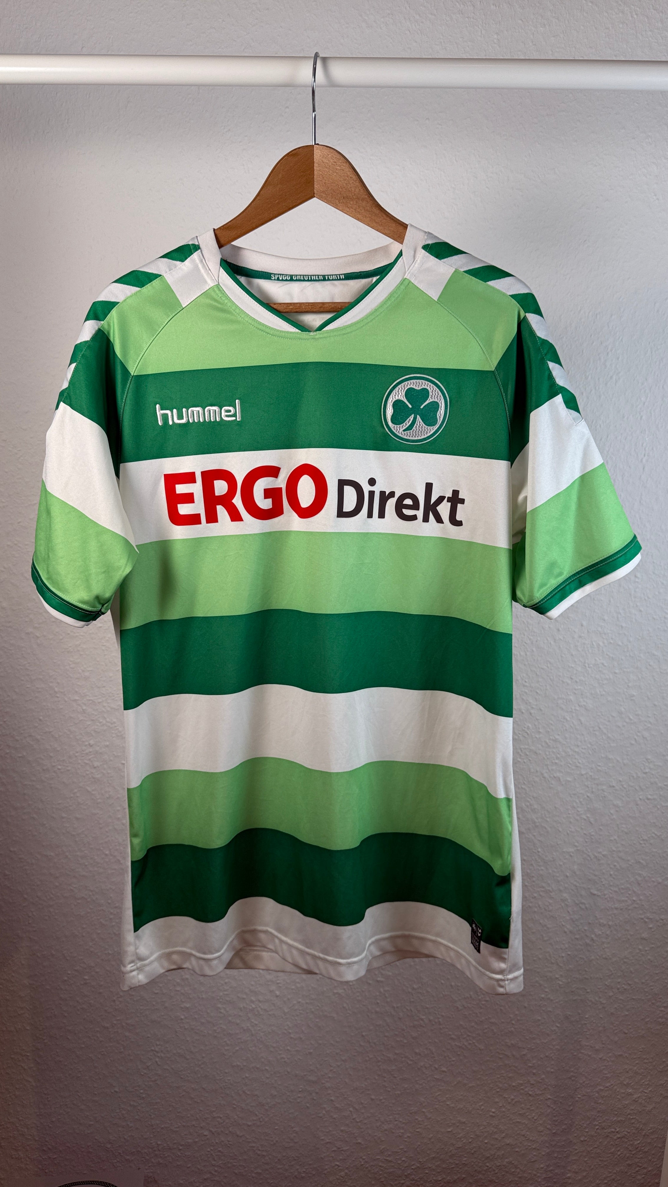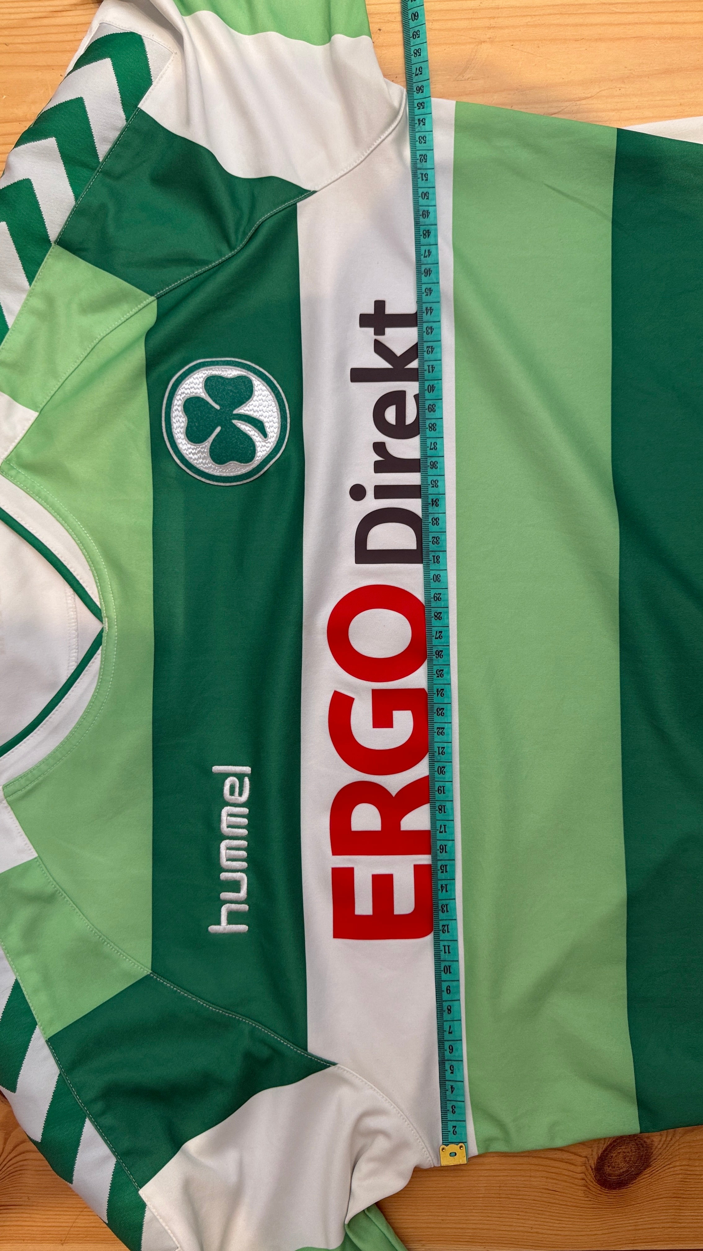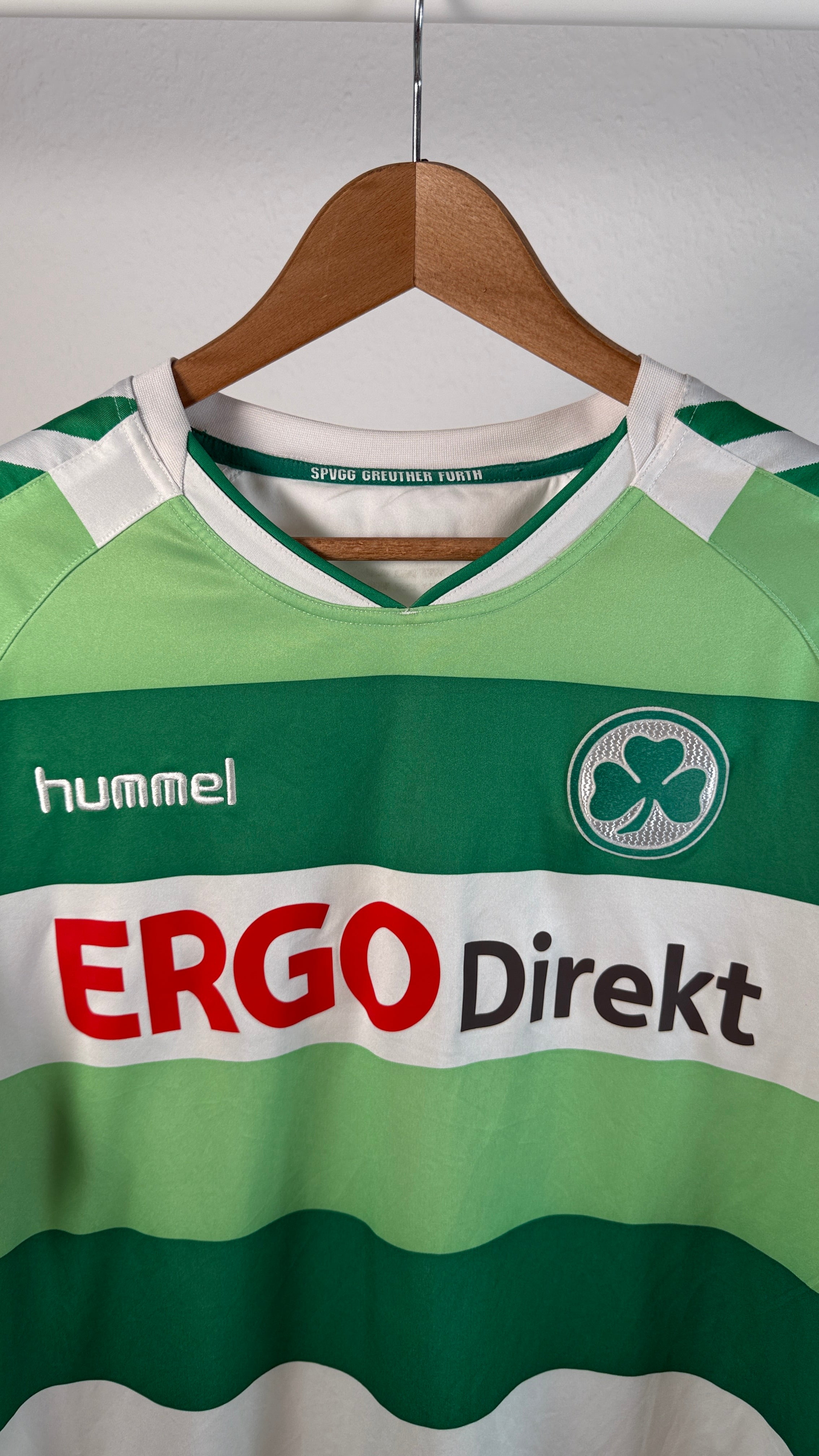 BESONDERHEITEN – Klassisches Heimtrikot der Spielvereinigung Greuther Fürth aus der Zweitligasaison 2014/15. Typisches Hummel-Design mit den charakteristischen Schulterstreifen und ERGO Direkt Sponsoring.