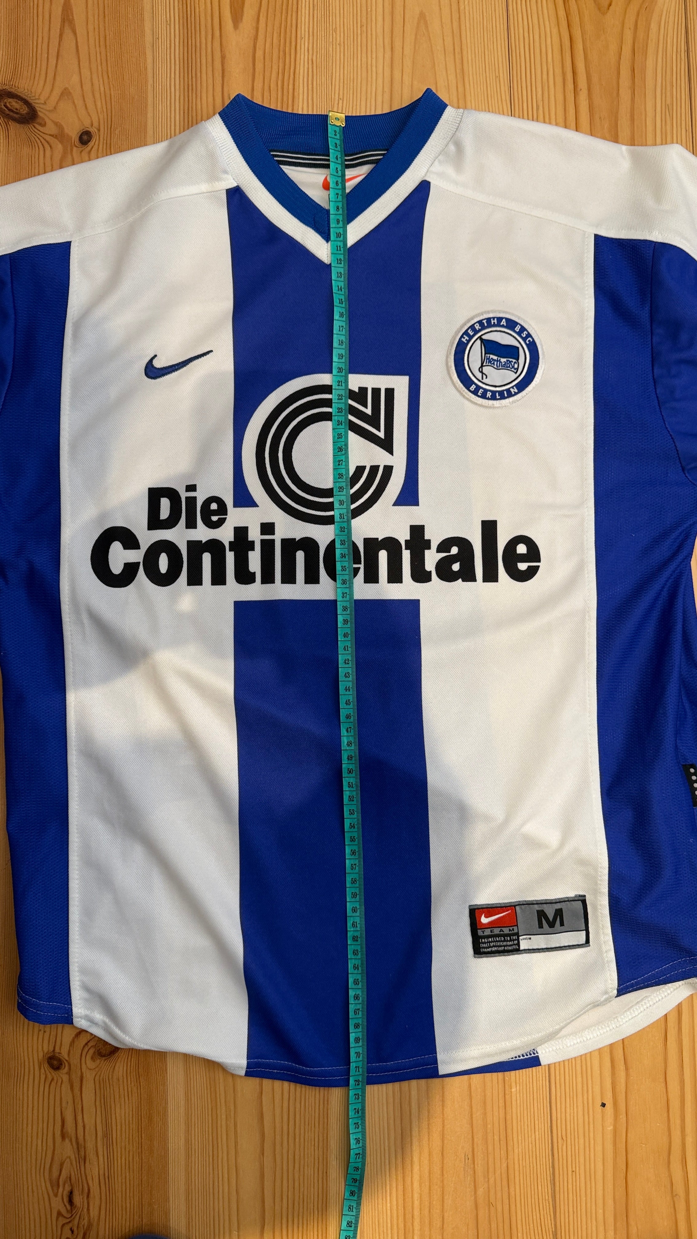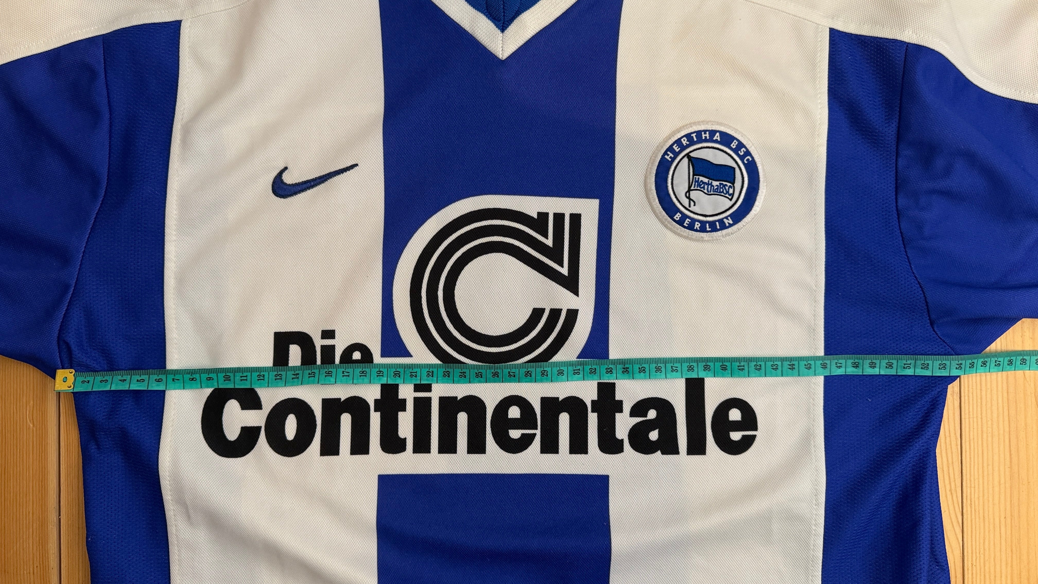 Original Hertha-Heimtrikot aus der Saison 1999/2000 mit Flock von Dariusz Wosz (#7), Spielmacher und Kapitän der Berliner. Klassisches Nike-Design mit Continentale-Sponsor – ein schönes Sammlerstück aus der Champions-League-Ära der Hertha.