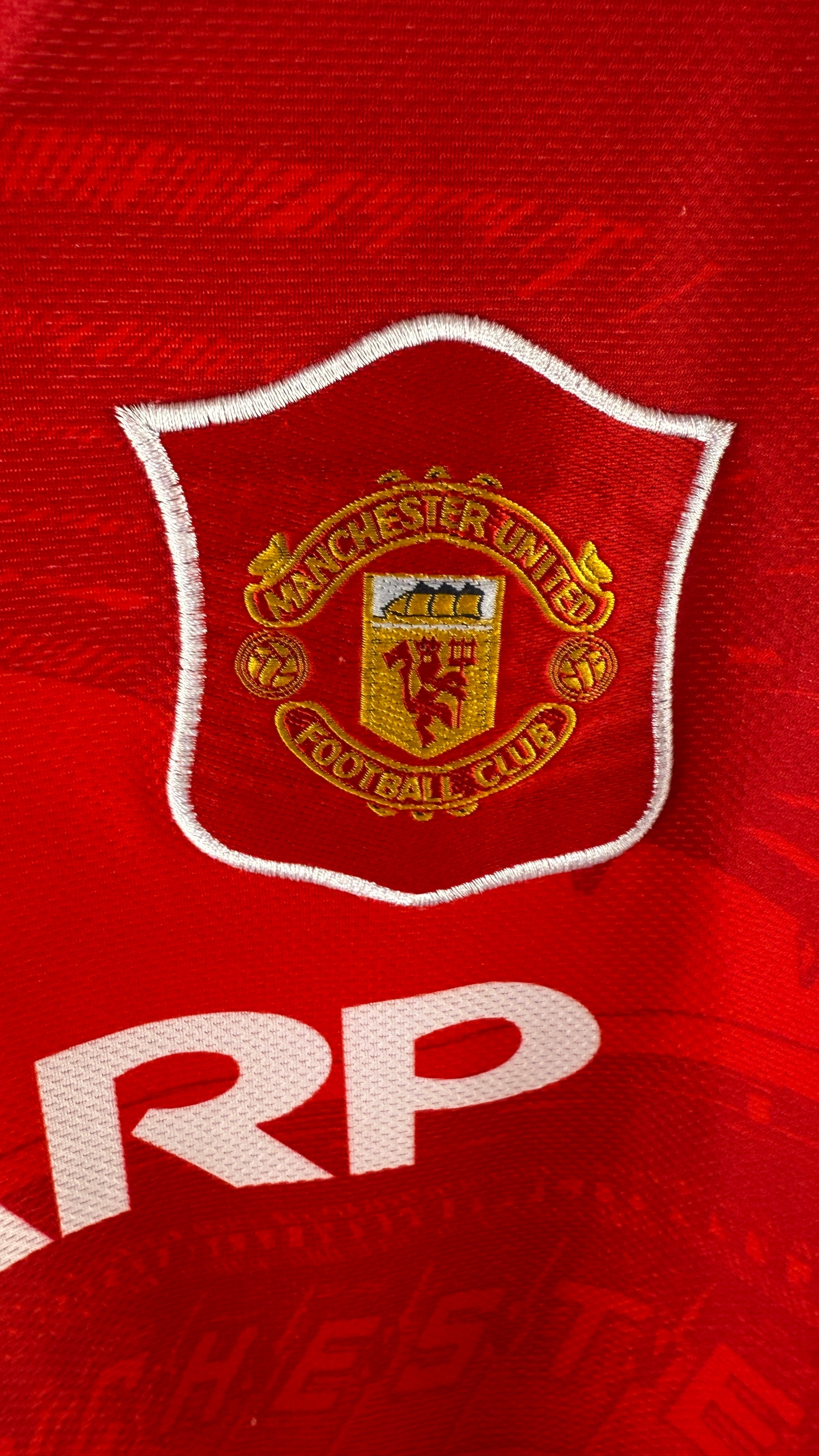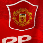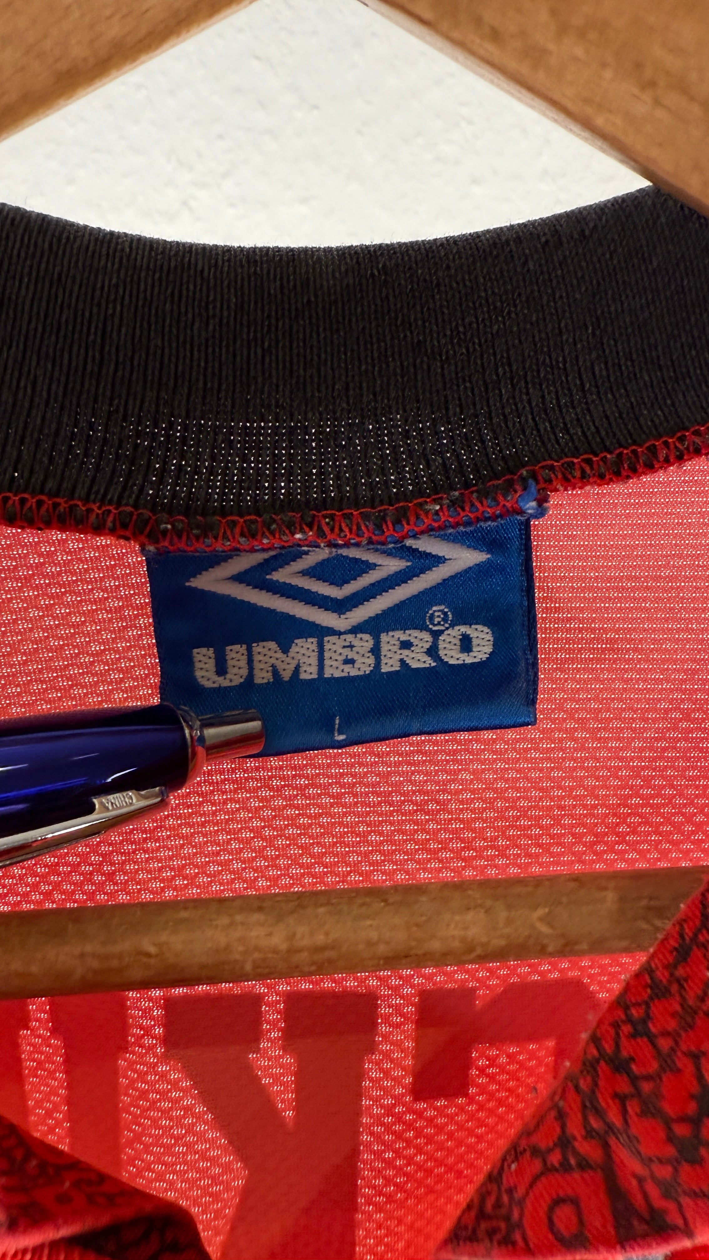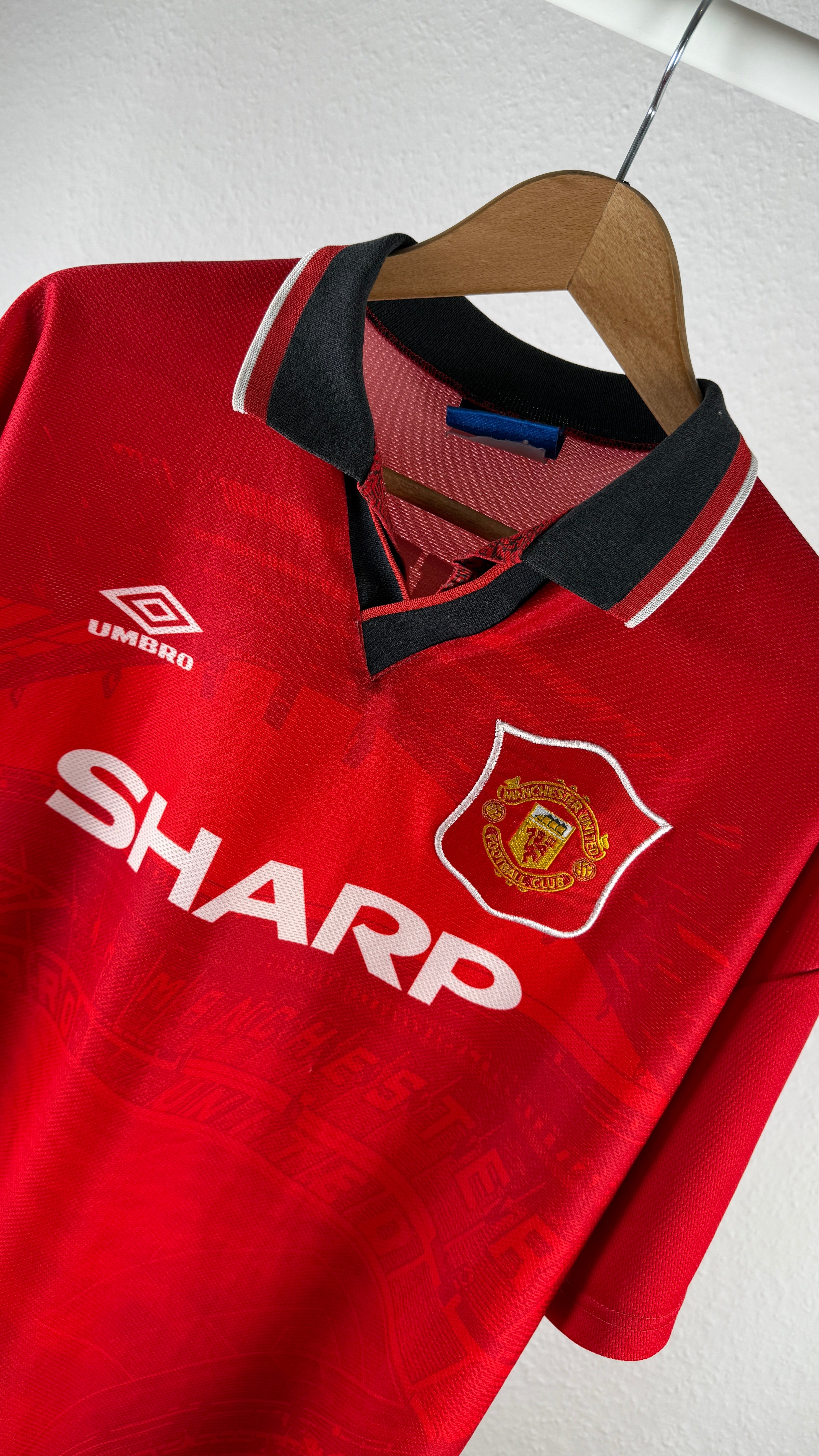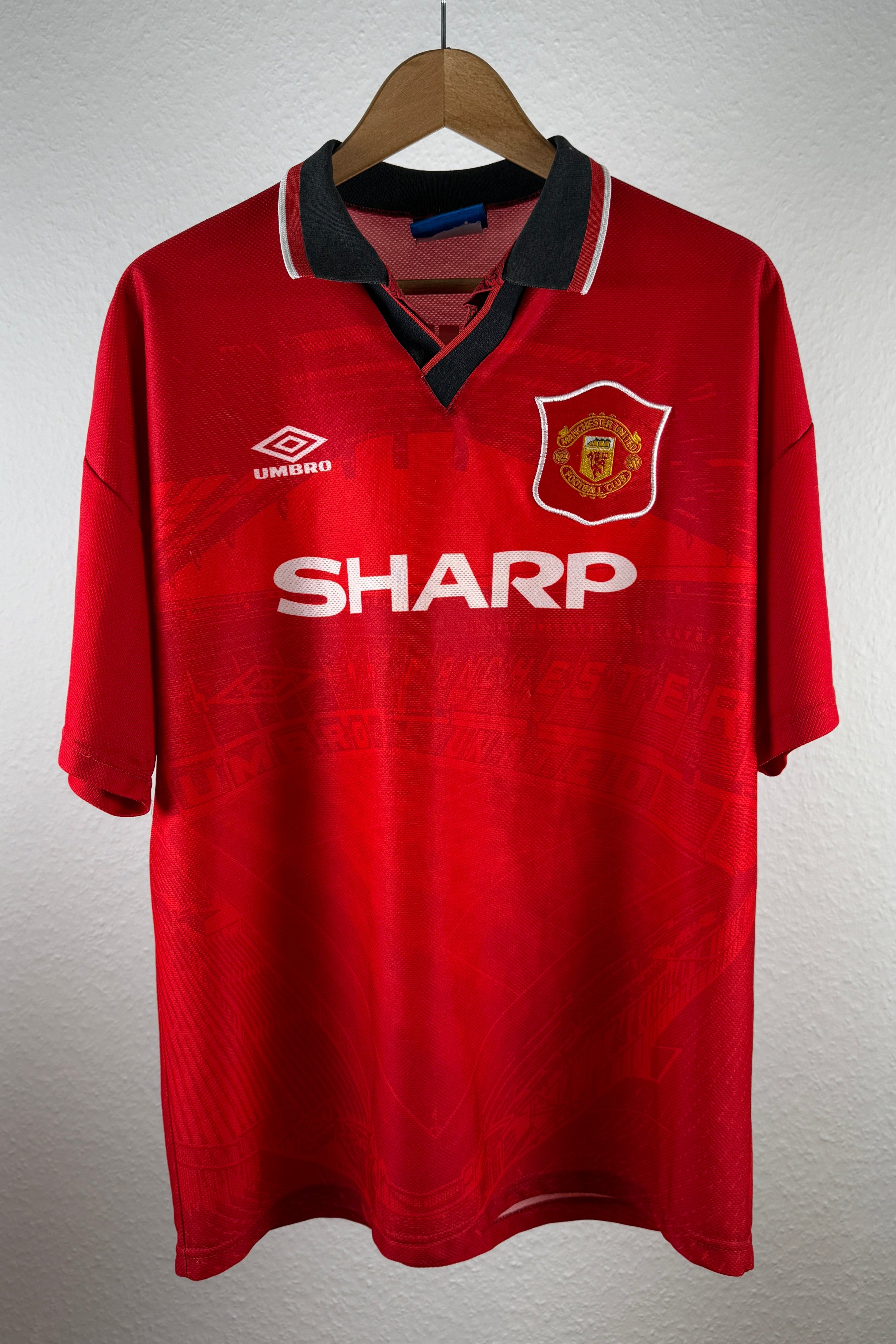 Kultiges Heimtrikot von Manchester United aus der Saison 1994/95, von Umbro mit klassischem Kragen und Sharp-Sponsor. Mit seltenem Beckham-Flock #24 – getragen in seinen allerersten Einsätzen für Man United. Frühes Pre-Fame-Stück, das unter Sammlern sehr begehrt ist!