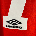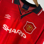 Original Heimtrikot von Manchester United aus der Saison 1994/95 mit dem legendären Flock von Eric Cantona (#7). Klassisches Design mit Kragen und Knopf, hergestellt von Umbro. Eines der ikonischsten Trikots der 90er – ein absolutes Sammlerstück!