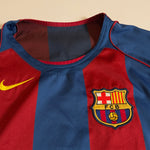 Original FC Barcelona Heimtrikot aus der Saison 2004/05, getragen in Messis Debütsaison bei den Profis. Klassisches Nike-Design mit breiten Streifen, sponsorfrei wie in La Liga getragen. Mit Rückenflock Messi #30 – einer der seltensten und gefragtesten Flocks weltweit. Ein absolutes Sammlerstück!