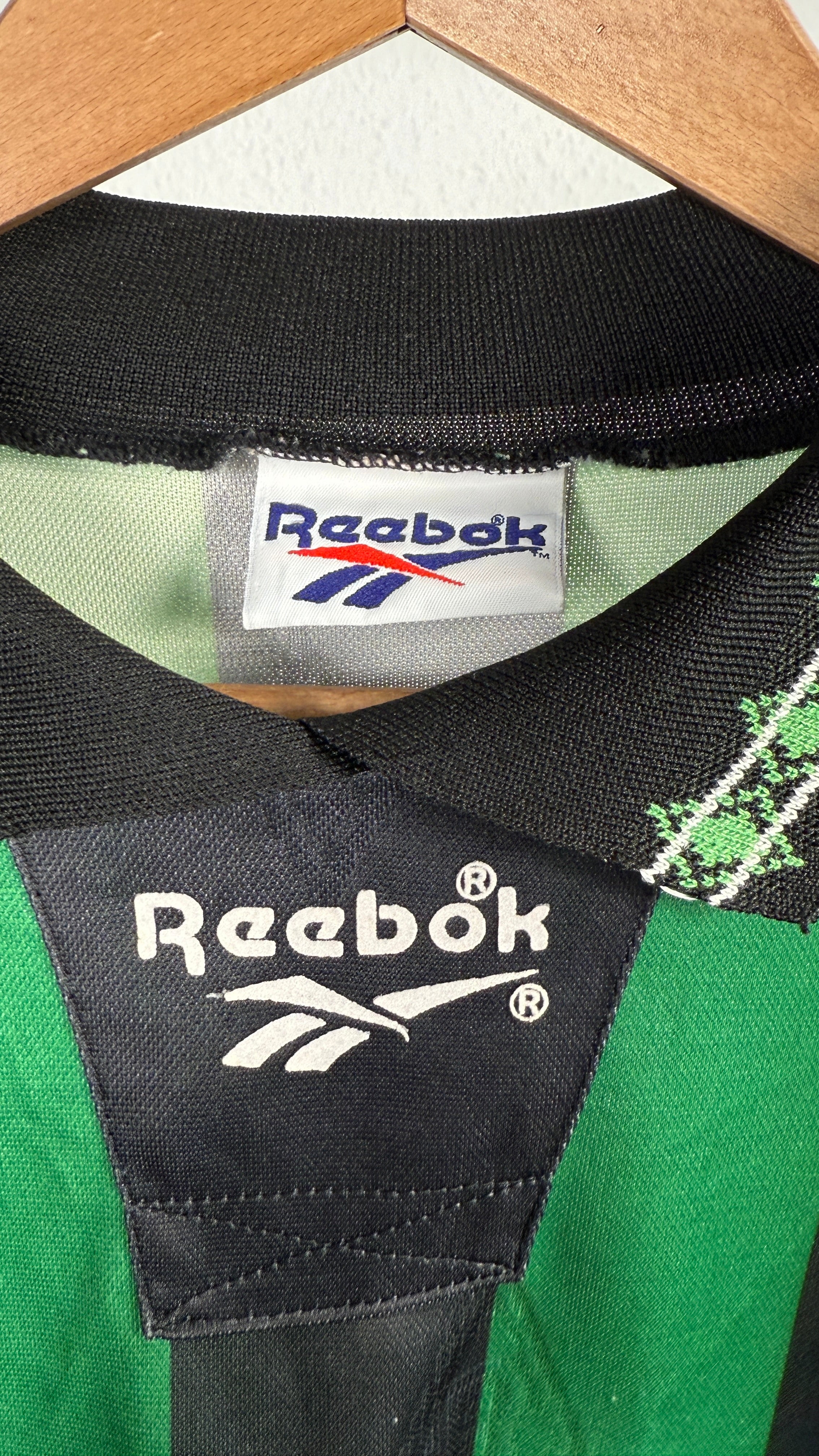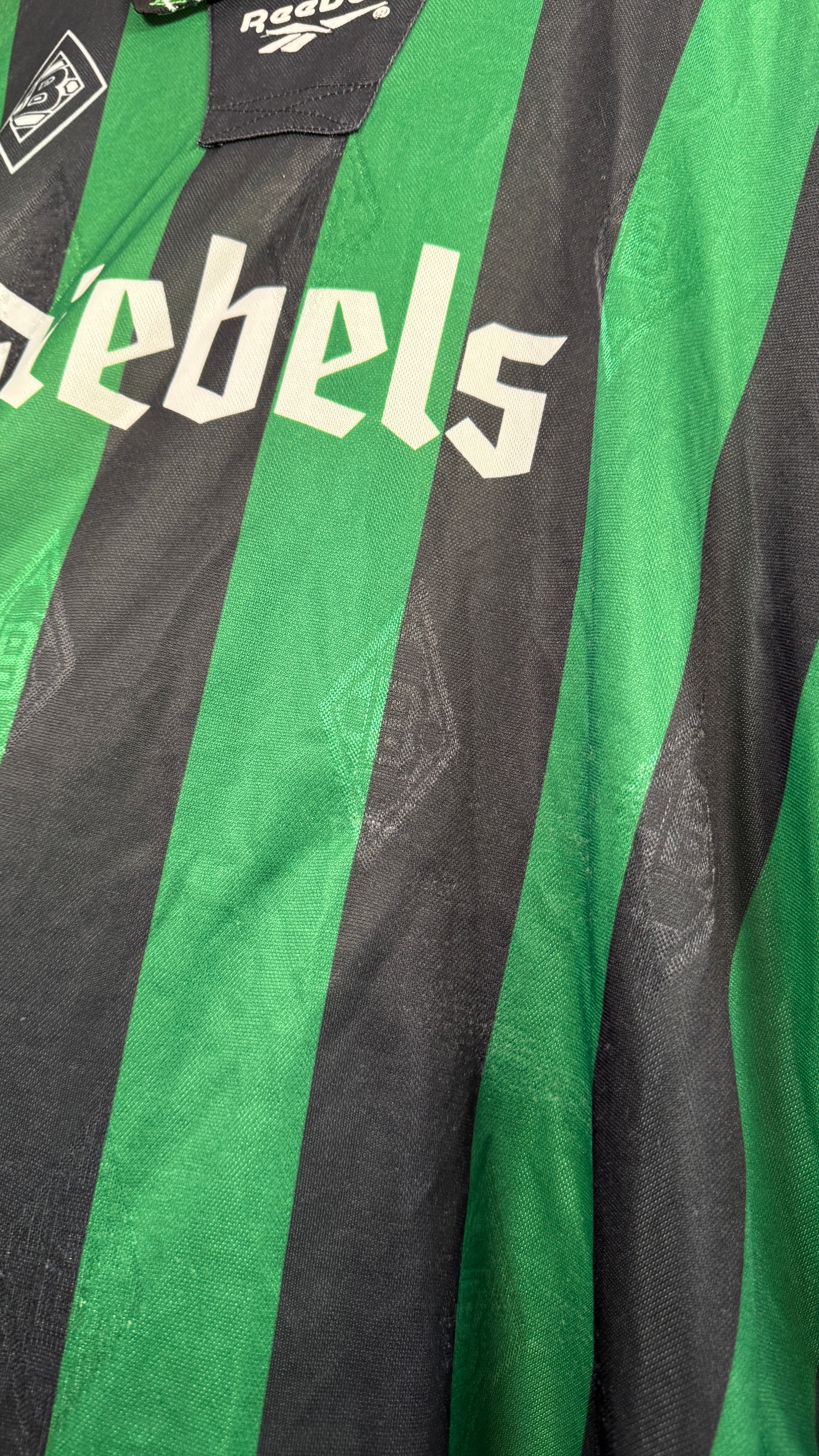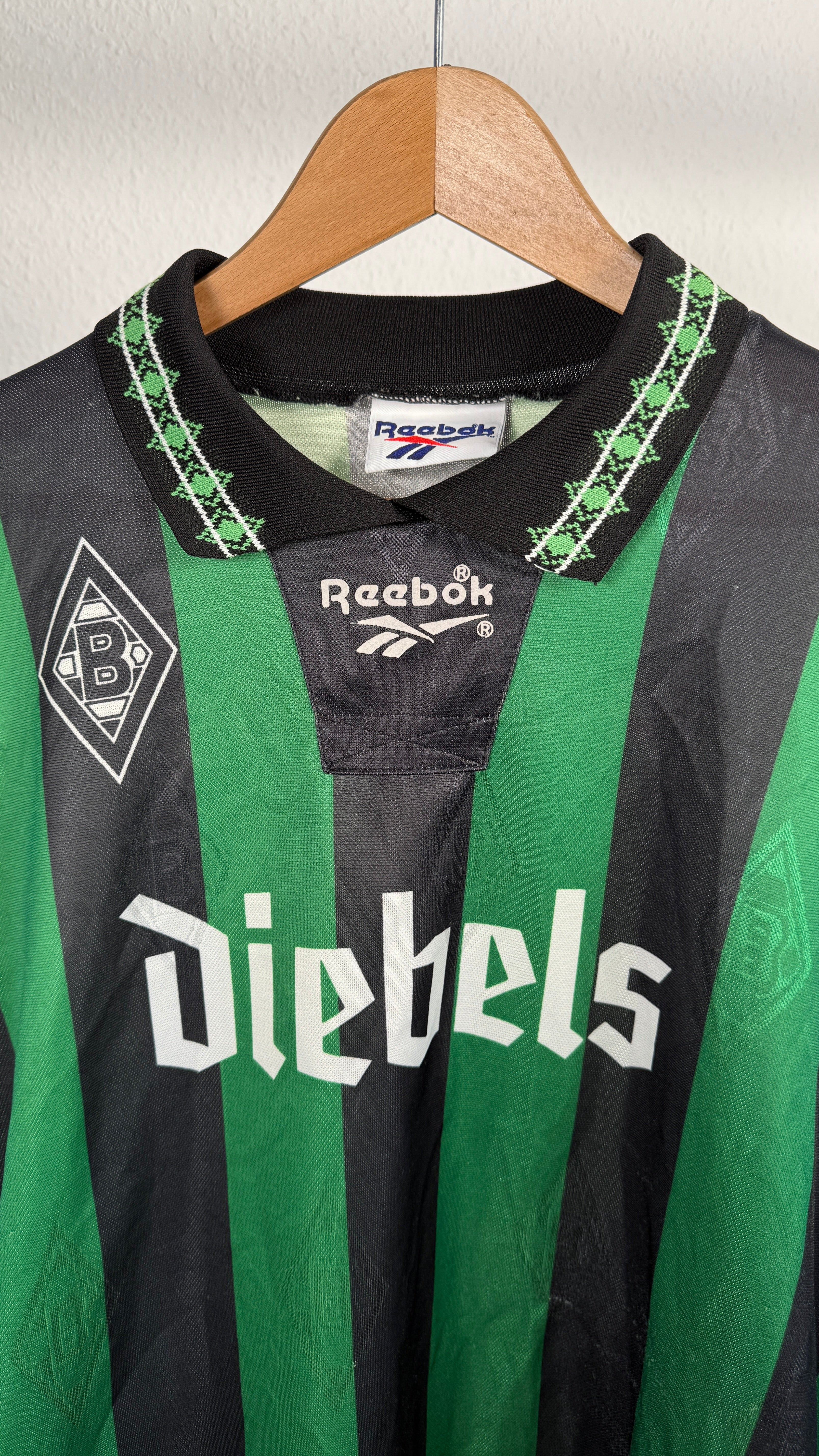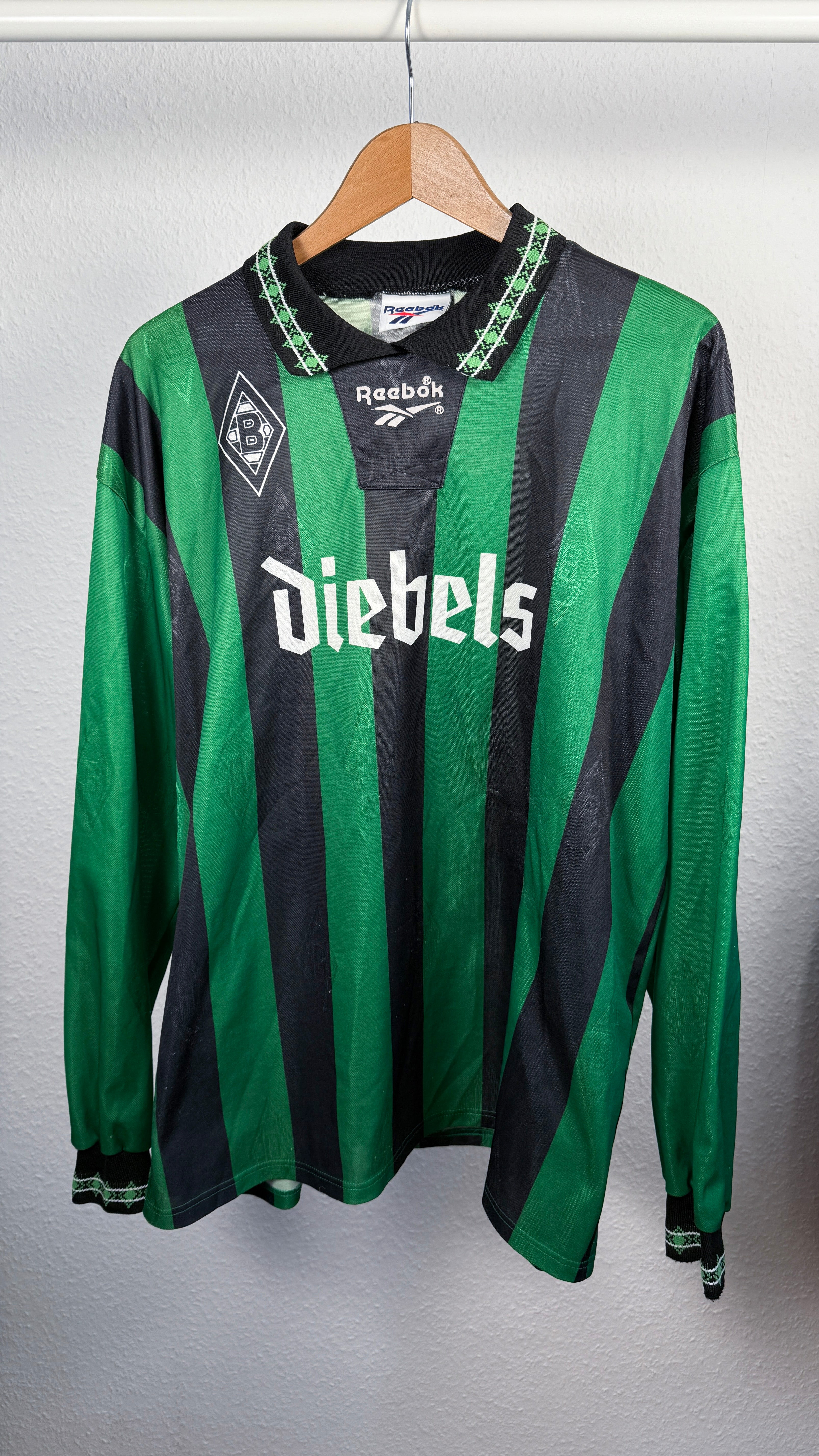 BESONDERHEITEN – Klassisches Gladbach-Auswärtstrikot der 90er mit ikonischem Diebels-Sponsor und Reebok-Design.