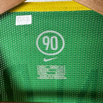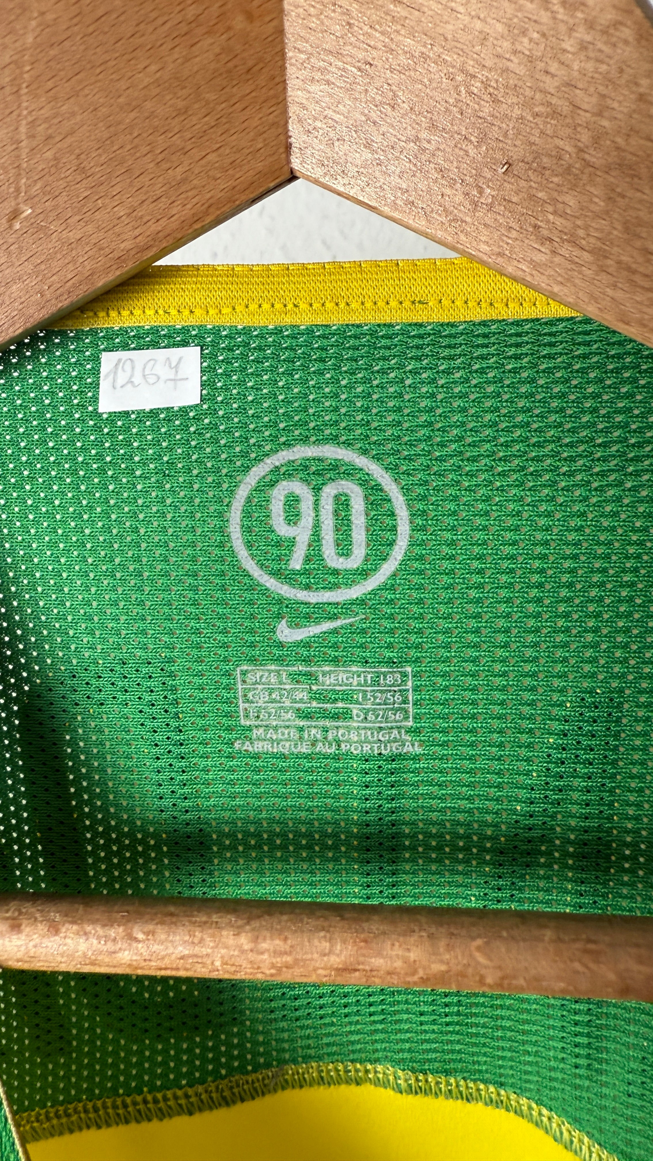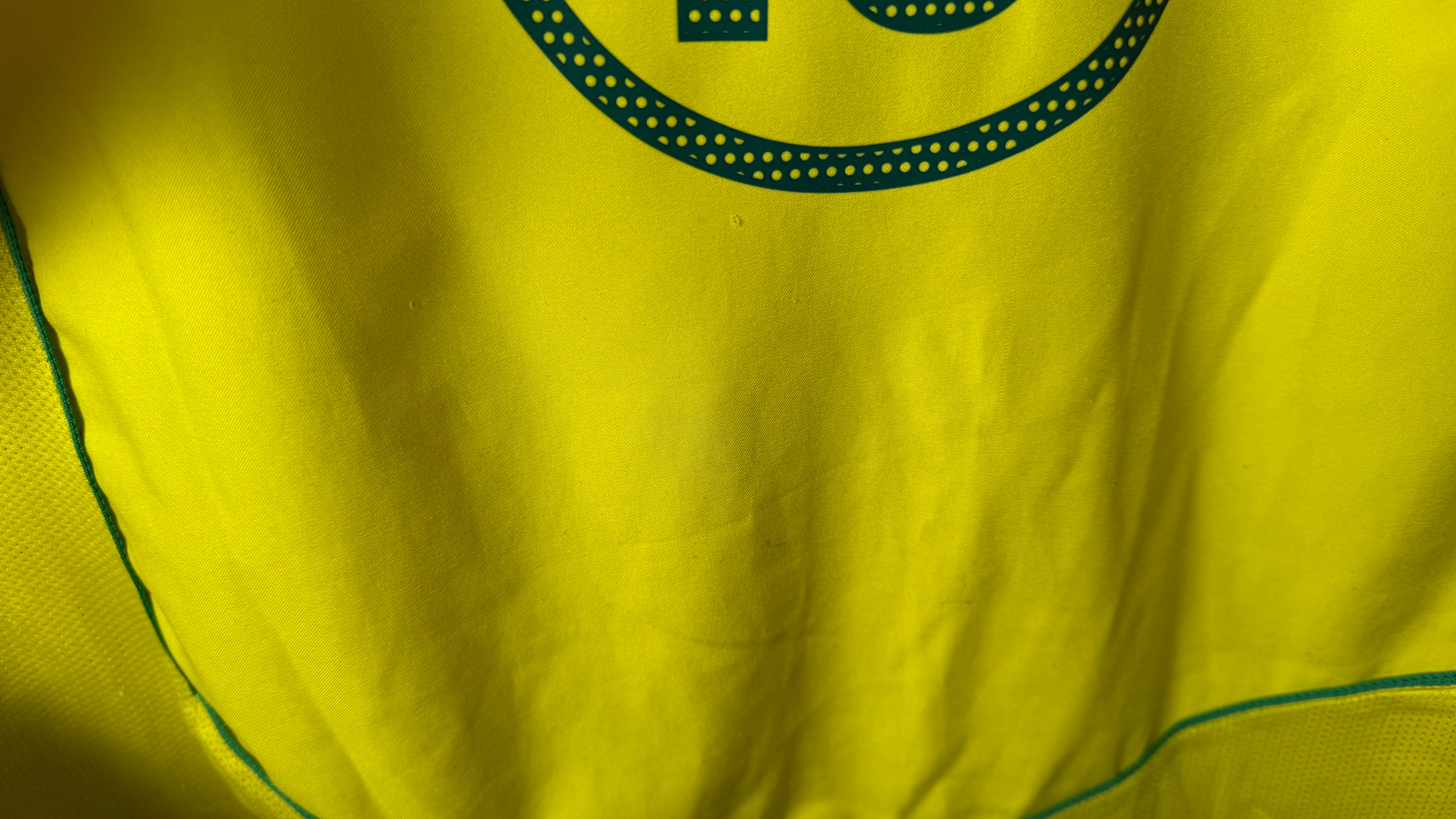 BESONDERHEITEN – Originales Heimtrikot der brasilianischen Nationalmannschaft von 2004 mit Rückenflock von Ronaldinho, dem Magier des Fußballs. Ikonisches Nike-Design mit grünem Rundkragen und gesticktem Wappen – getragen in der goldenen Ära der Seleção. In Größe L und in sehr gutem Zustand eine seltene Gelegenheit für Sammler und Fans.