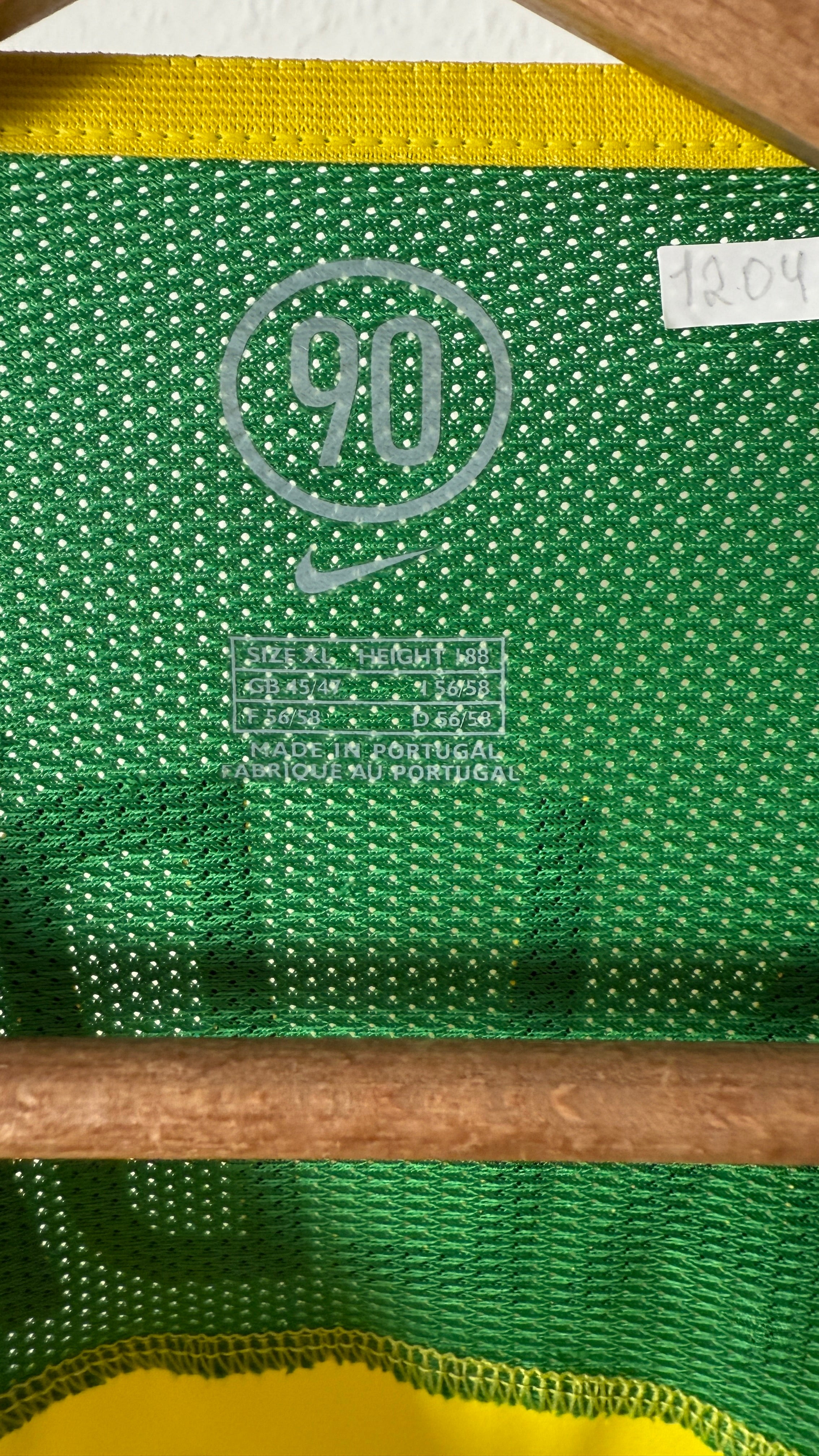 Schlichtes, ikonisches Nike-Design mit grünem Rundkragen und gesticktem Wappen – getragen in der goldenen Ära der Seleção.