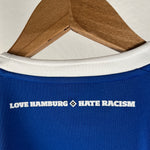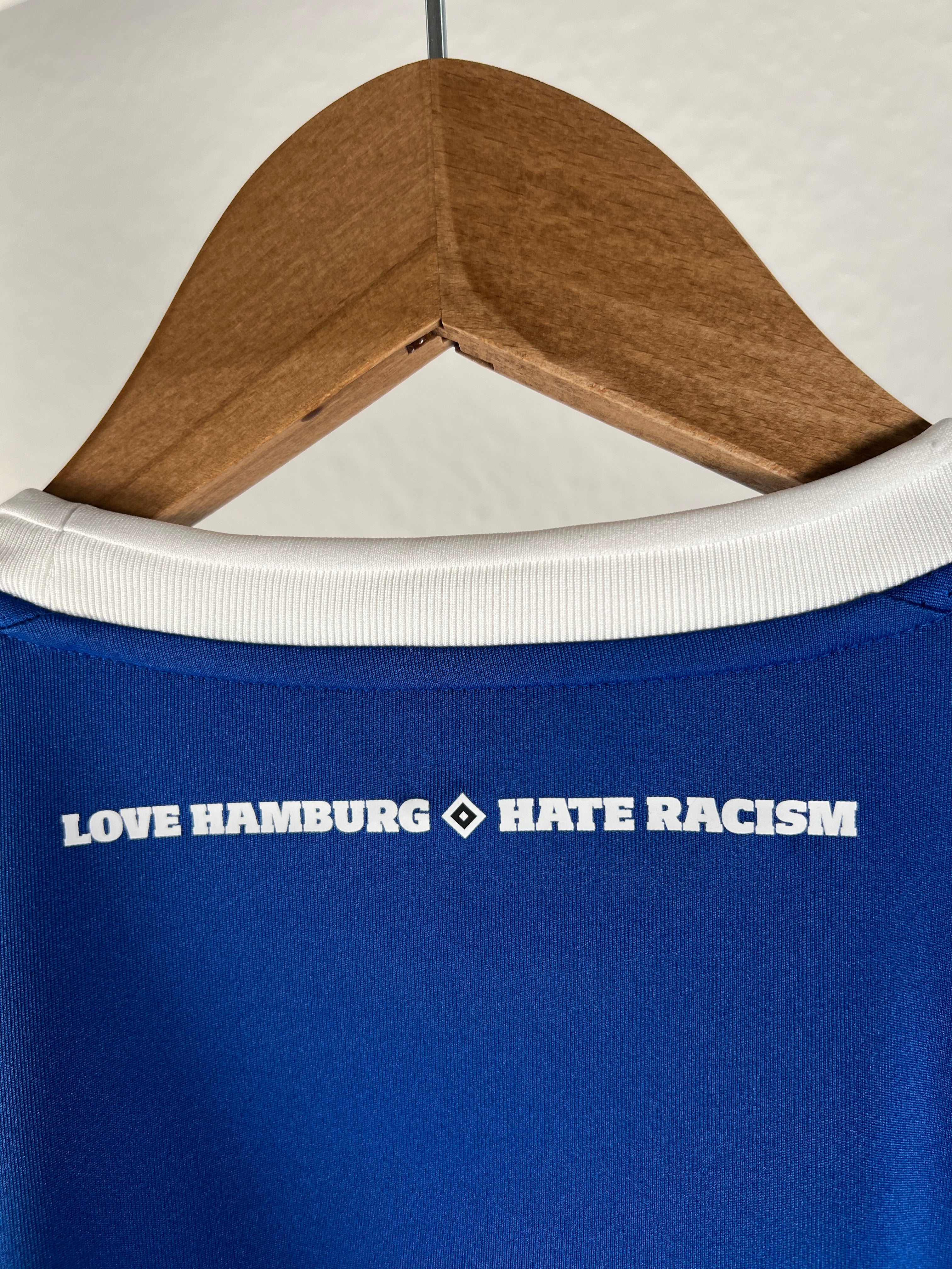 Exklusive Sonderedition zum 135-jährigen Vereinsjubiläum. Das Trikot kommt im klassischen Nadelstreifen-Design mit dem besonderen „LOVE HAMBURG – HATE RACISM“-Schriftzug im Nacken. Weißer Rundkragen, Retro-Feeling, hochwertiger Stick auf der Brust. Ein Muss für jeden HSV-Fan oder Sammler!