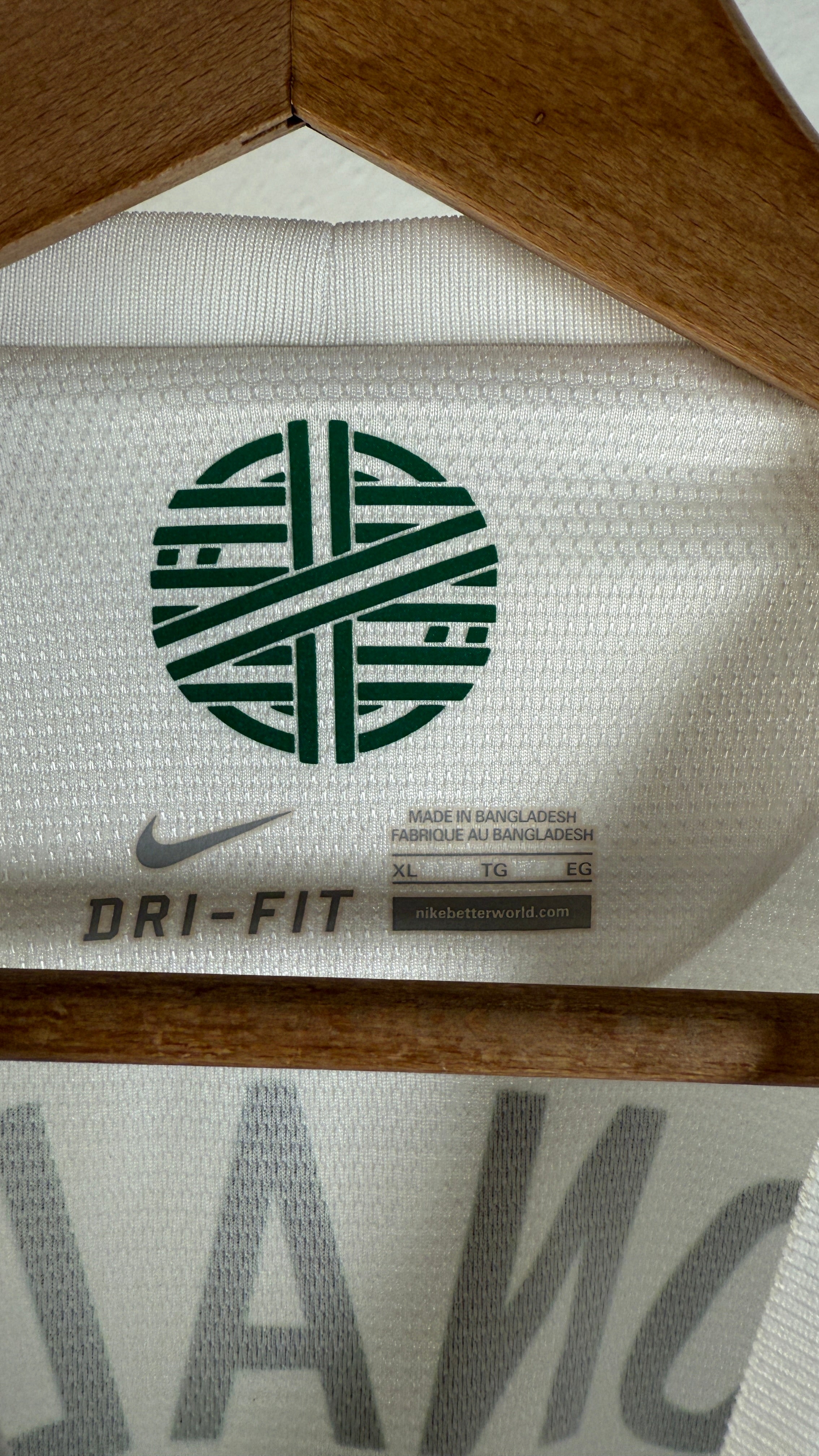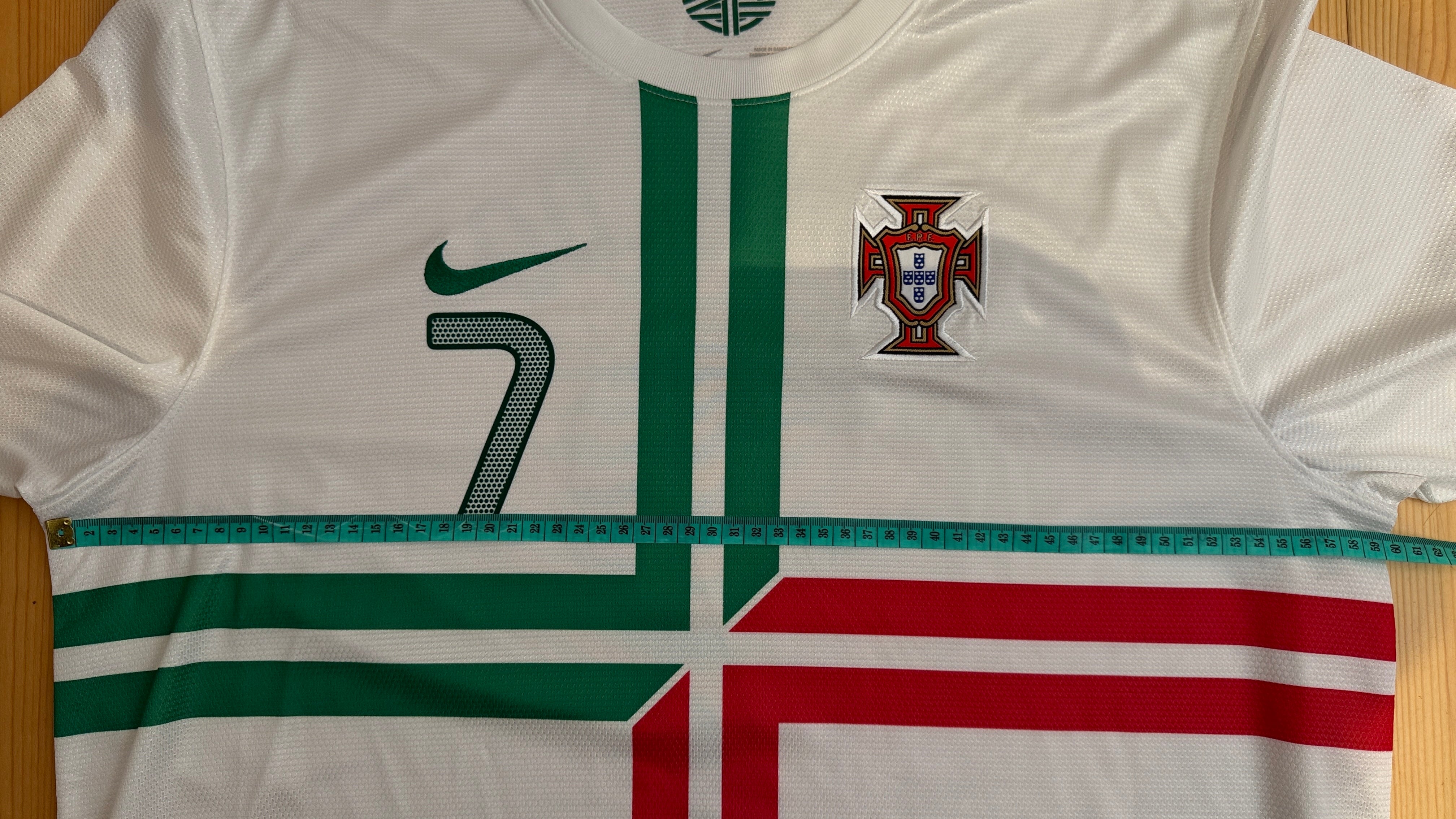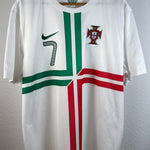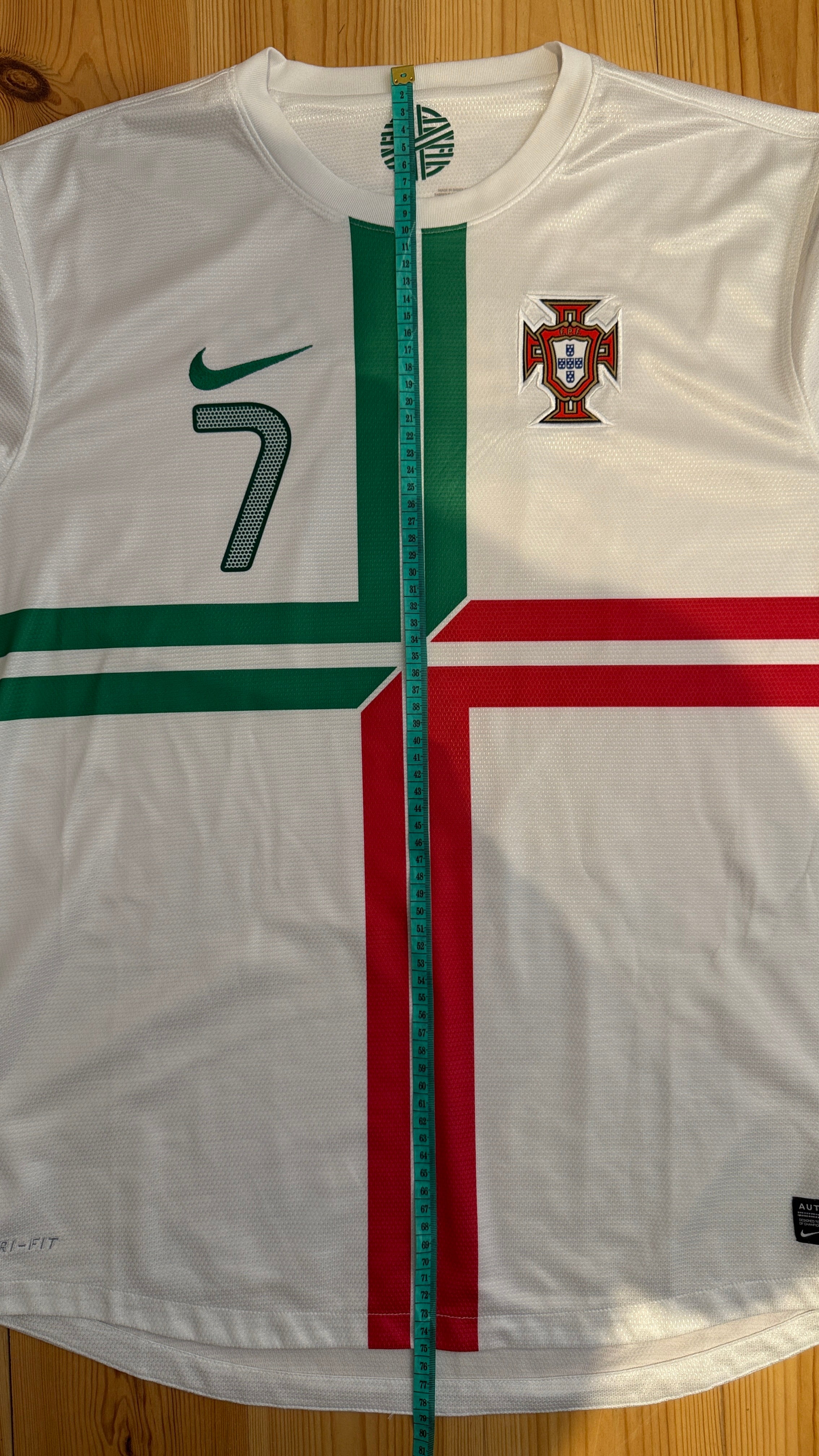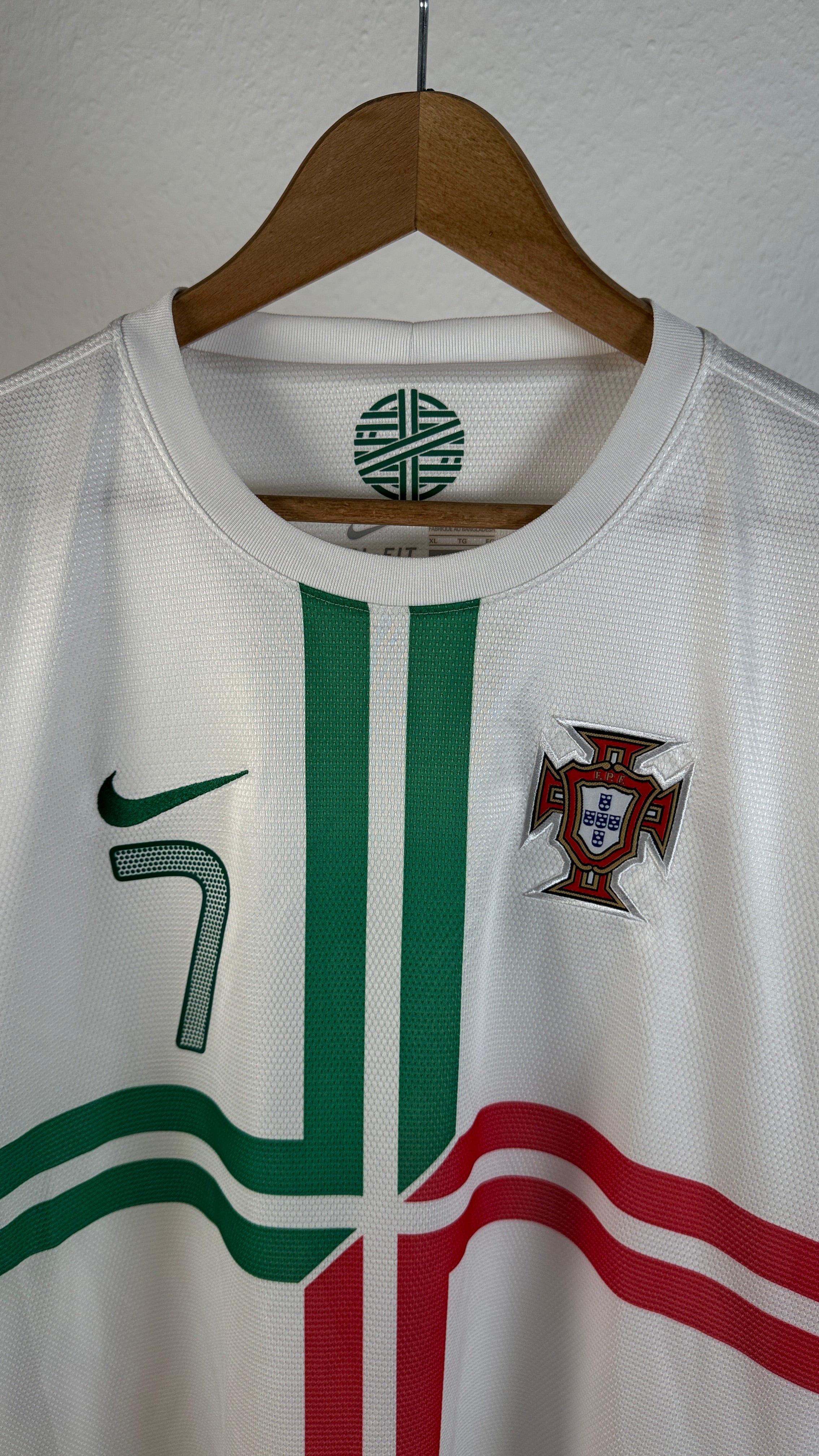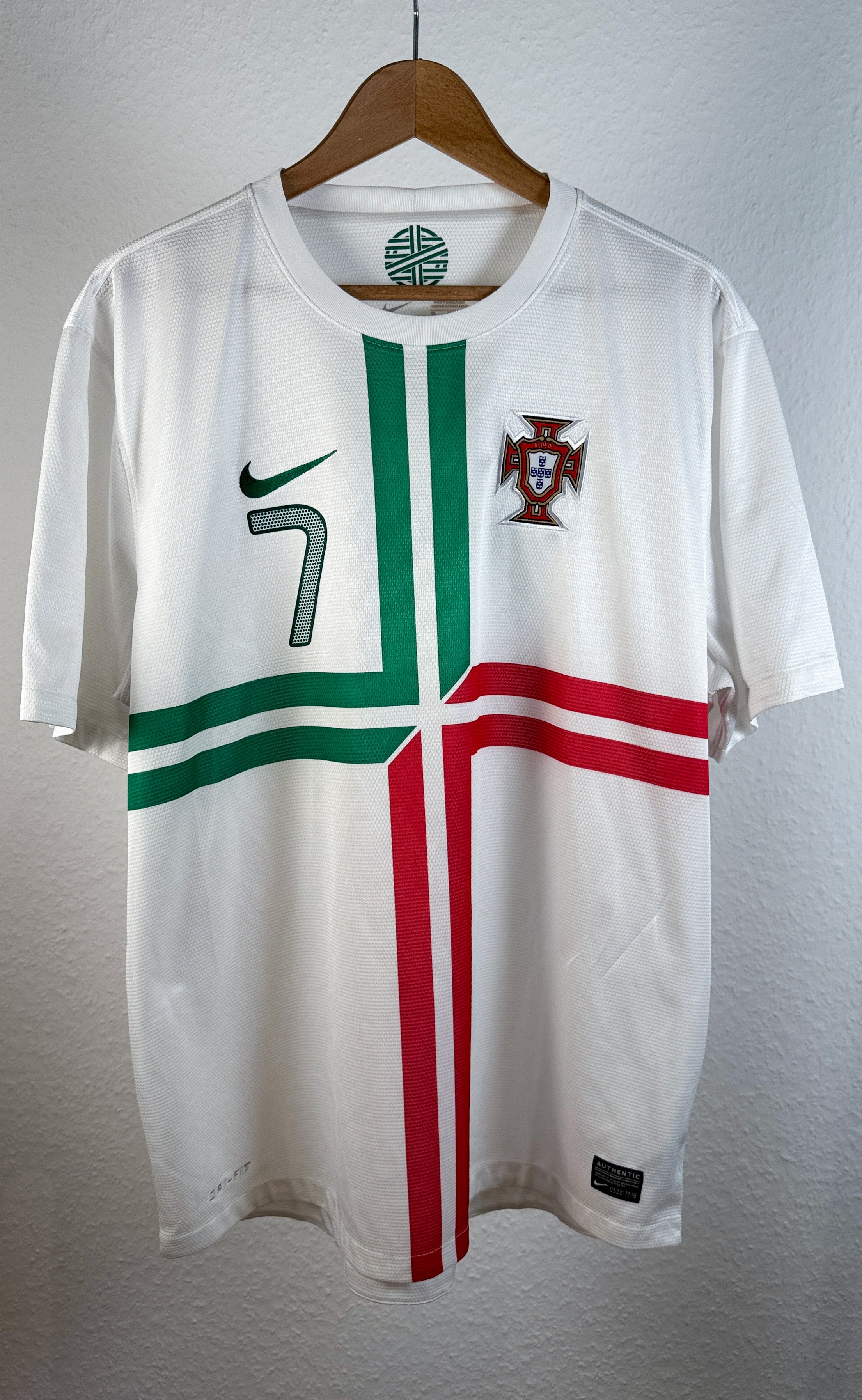 Original Auswärtstrikot der portugiesischen Nationalmannschaft aus der Saison 2012 mit Flock von Cristiano Ronaldo (#7). Klassisches weißes Nike-Design mit grün-rotem Kreuz – getragen bei der EM 2012. Ein beliebtes Sammlerstück in XL.
