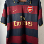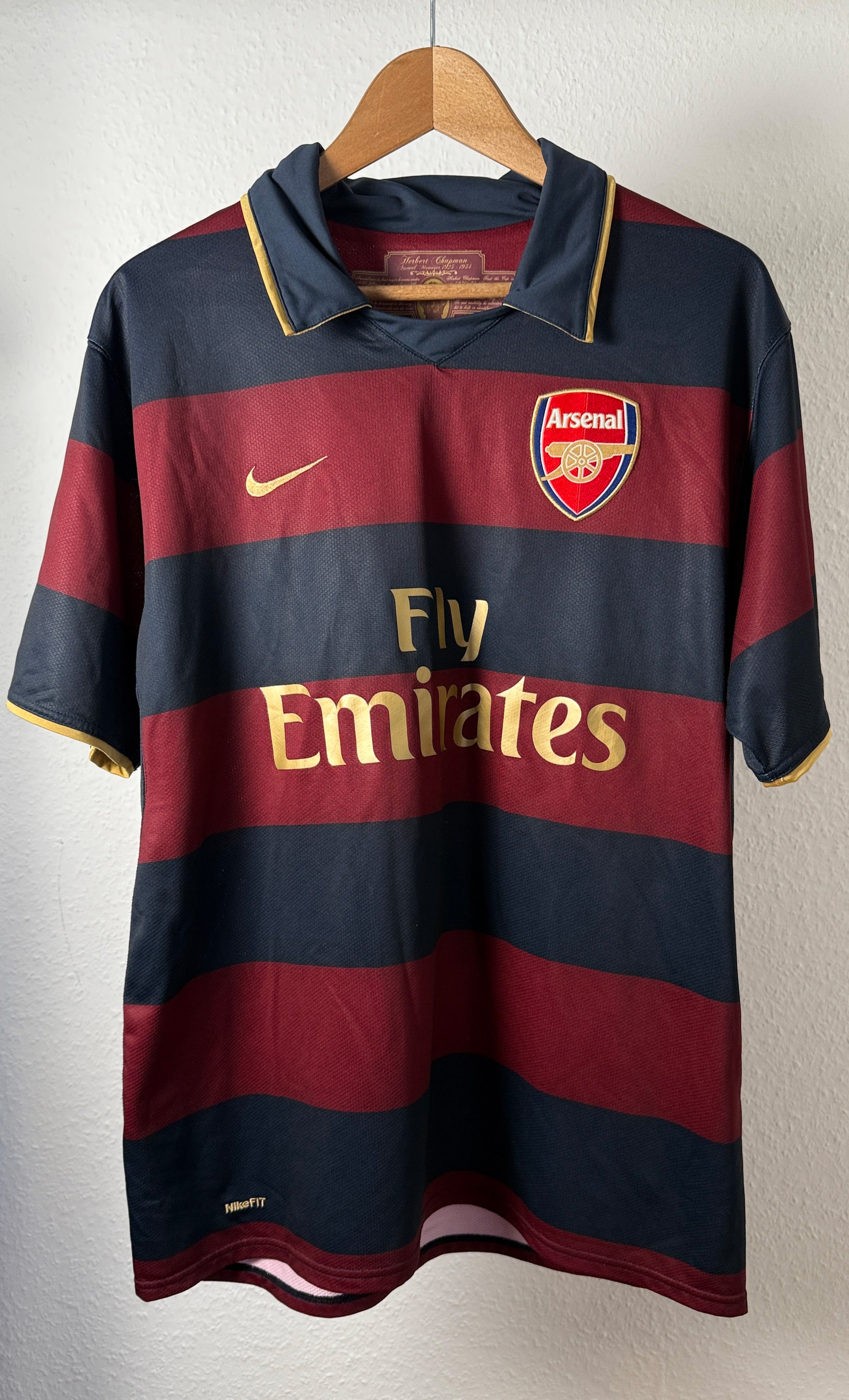 Dunkles, elegantes Nike-Design mit roten Details und Fly-Emirates-Sponsor. Eines der gefragtesten Arsenal-Ausweichtrikots der 2000er und besonders selten mit Walcott #32-Flock.