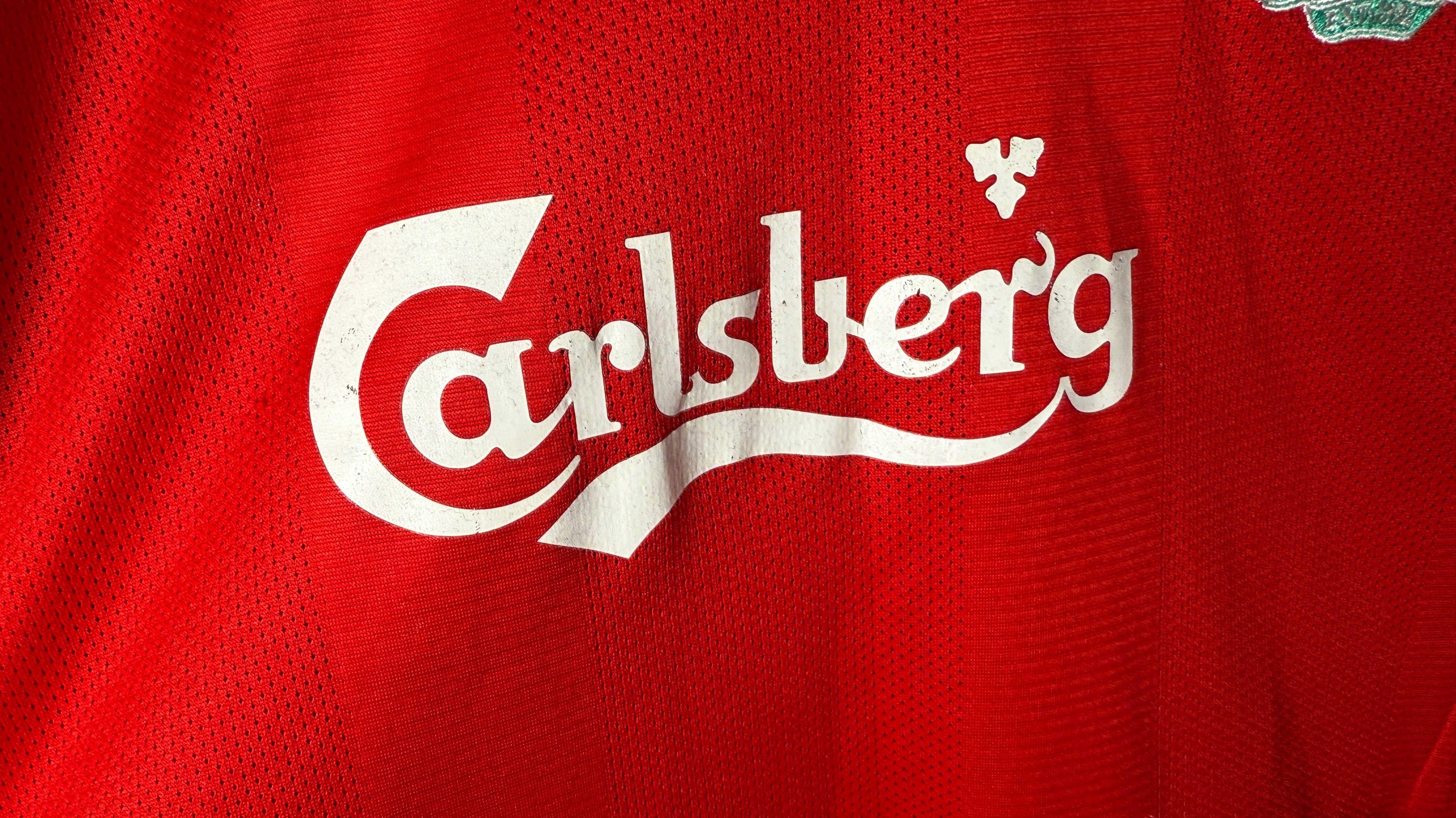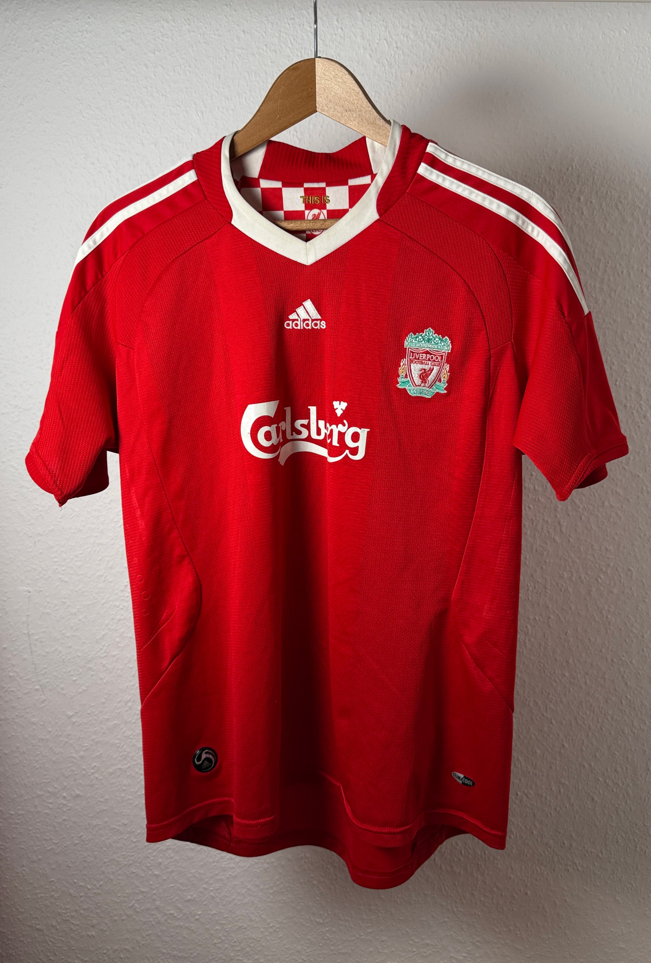 Klassisches Adidas-Design mit Carlsberg-Sponsor, getragen in der Ära um Gerrard, Torres, Mascherano und Alonso.