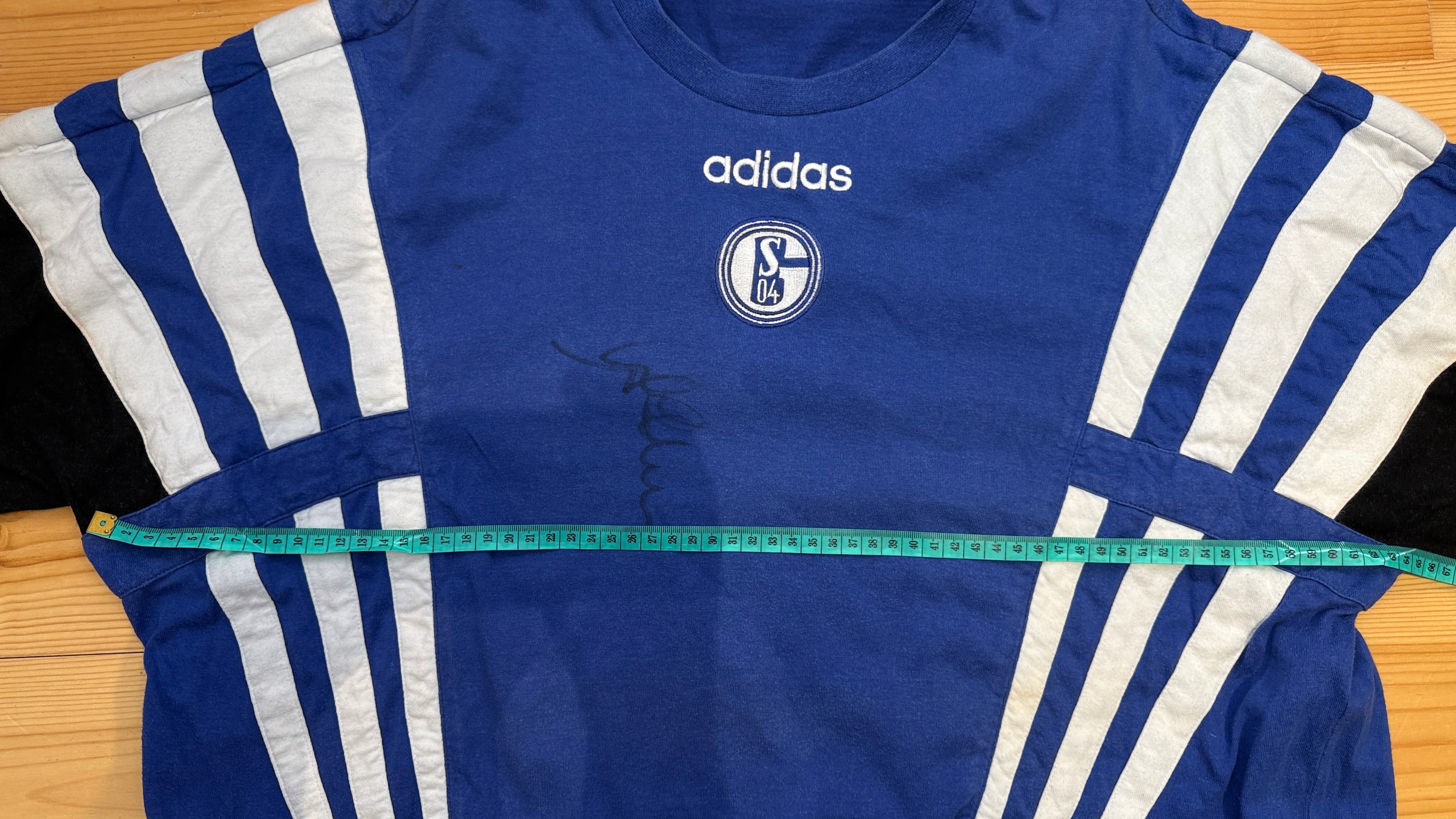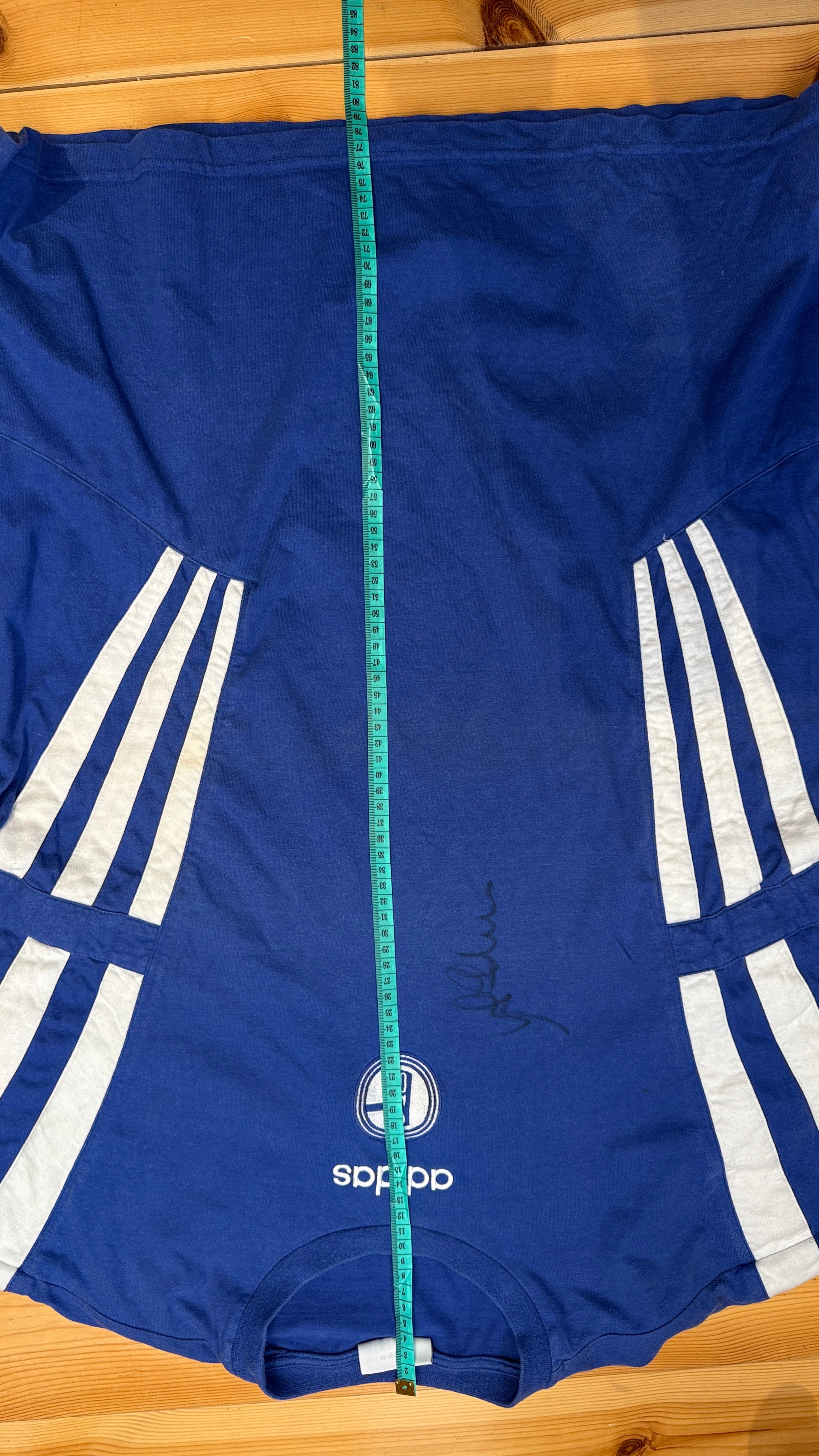 BESONDERHEITEN – Seltenes Adidas-Trainings-Trikot des FC Schalke 04 aus den 90er Jahren. Mit zahlreichen originalen Spieler-Autogrammen vorne und hinten – ein einzigartiges Sammlerstück für echte Schalke-Fans.