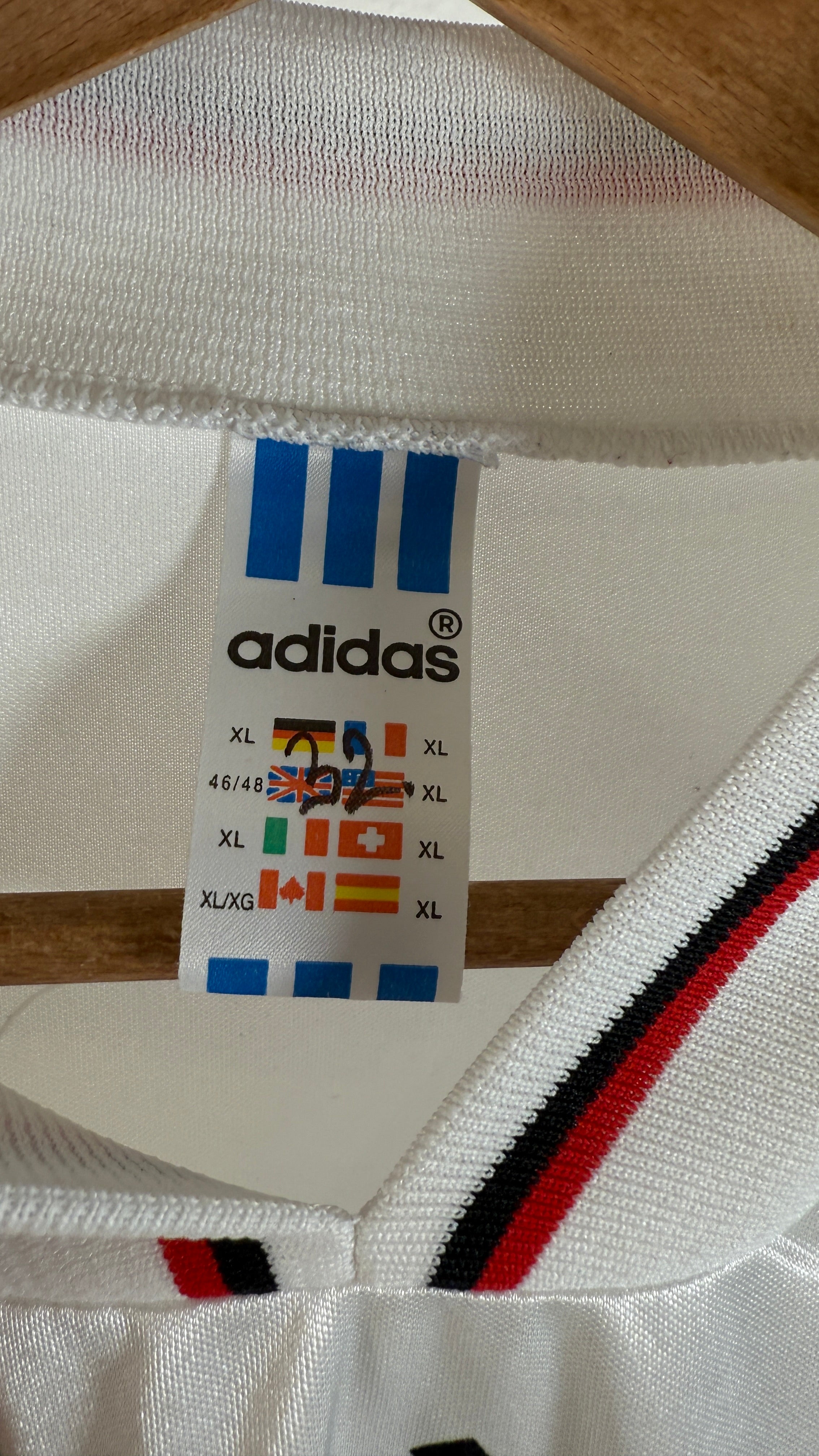Originales Heimtrikot des VfB Stuttgart mit klassischem Südmilch-Sponsor, getragen ca. 1993 bis 1996. Kultiges adidas-Design mit rotem Brustring, gesticktem Wappen und weitem 90s-Schnitt. Getragen in der Ära von Stars wie Balakov, Elber und Bobic.