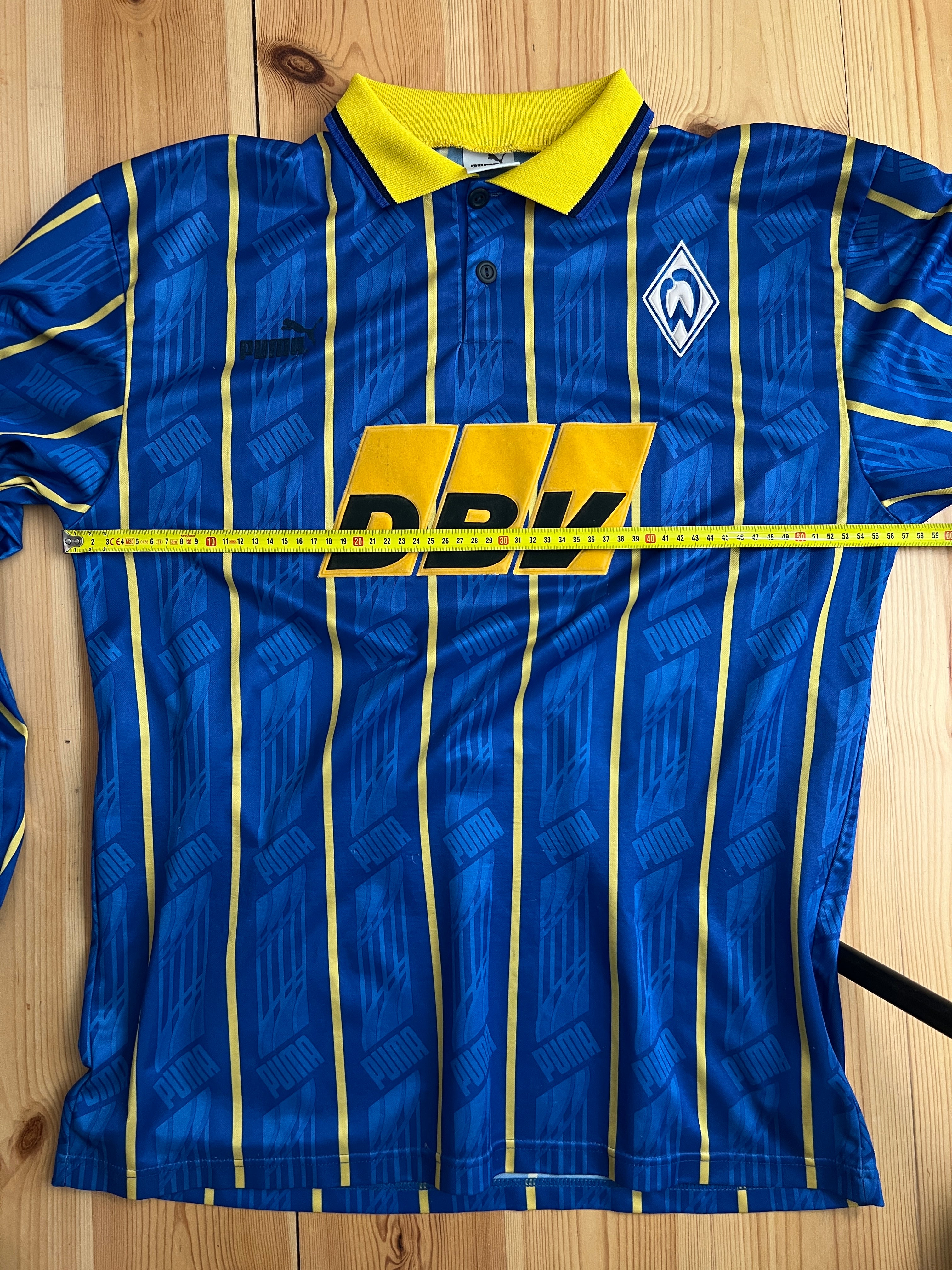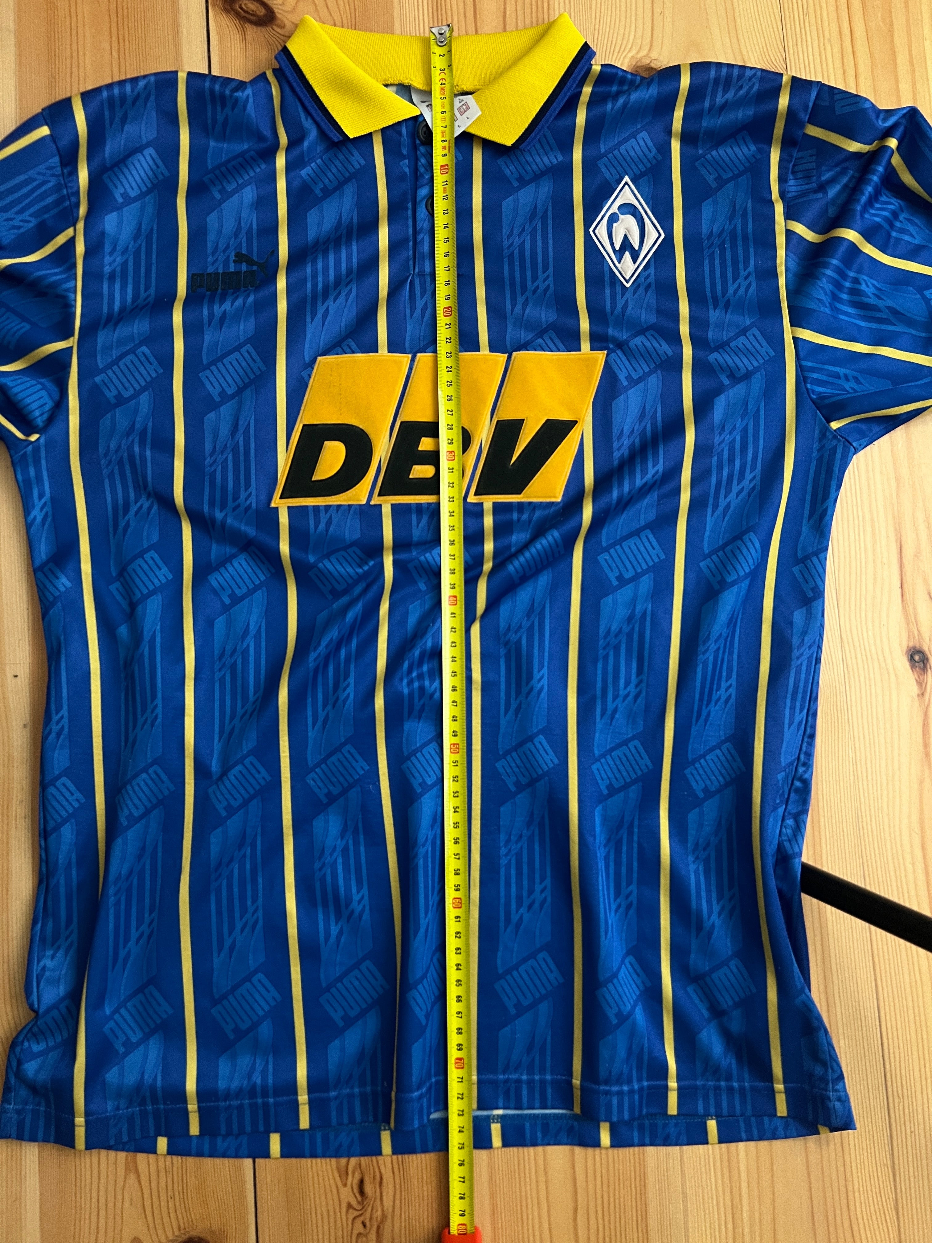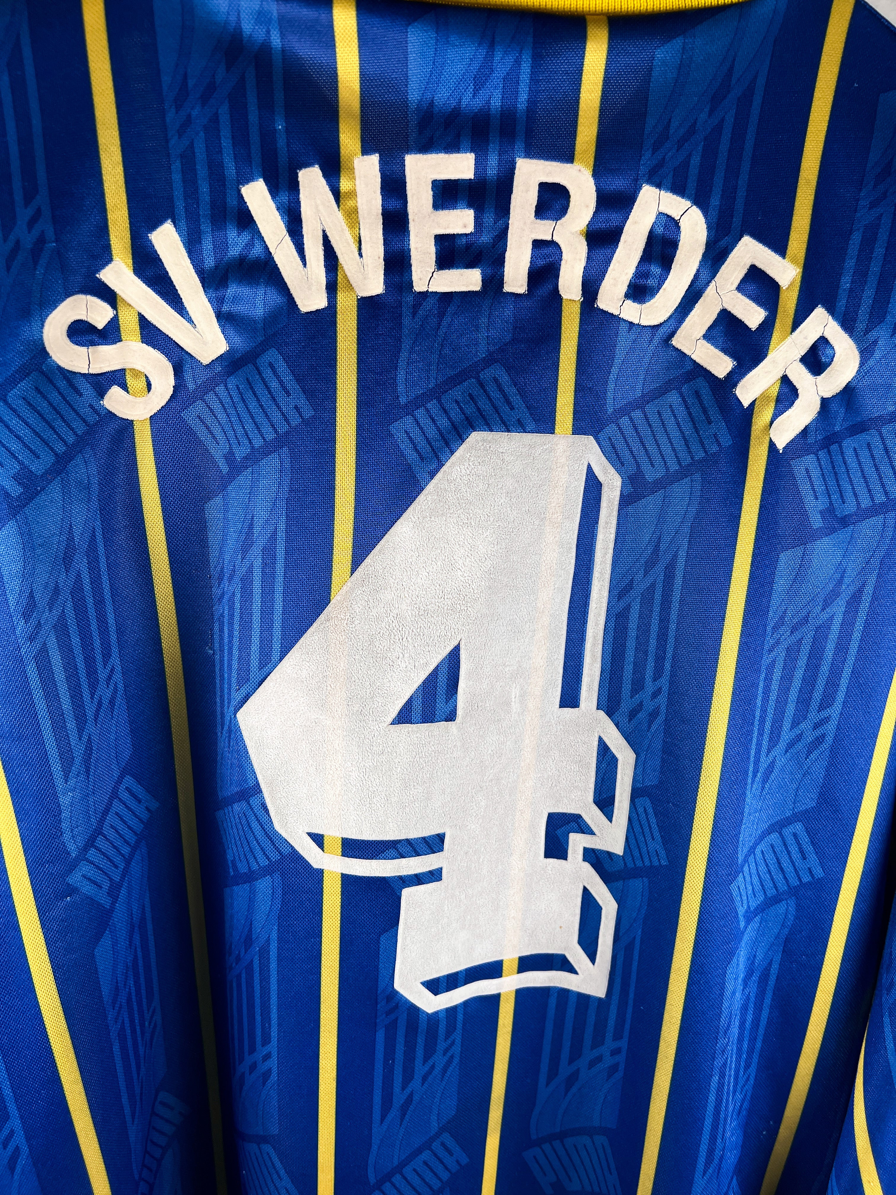 Besonderheiten: Seltenes Auswärtstrikot der Saison 1995/96 mit originalem Flock (#4). Unter dieser Nummer spielte damals u.a. der Tunesier Mohamed Zouita Ramzy. Eingewebtes Puma- und Werder-Logo im Stoff. Schwer in dieser Ausführung zu finden!