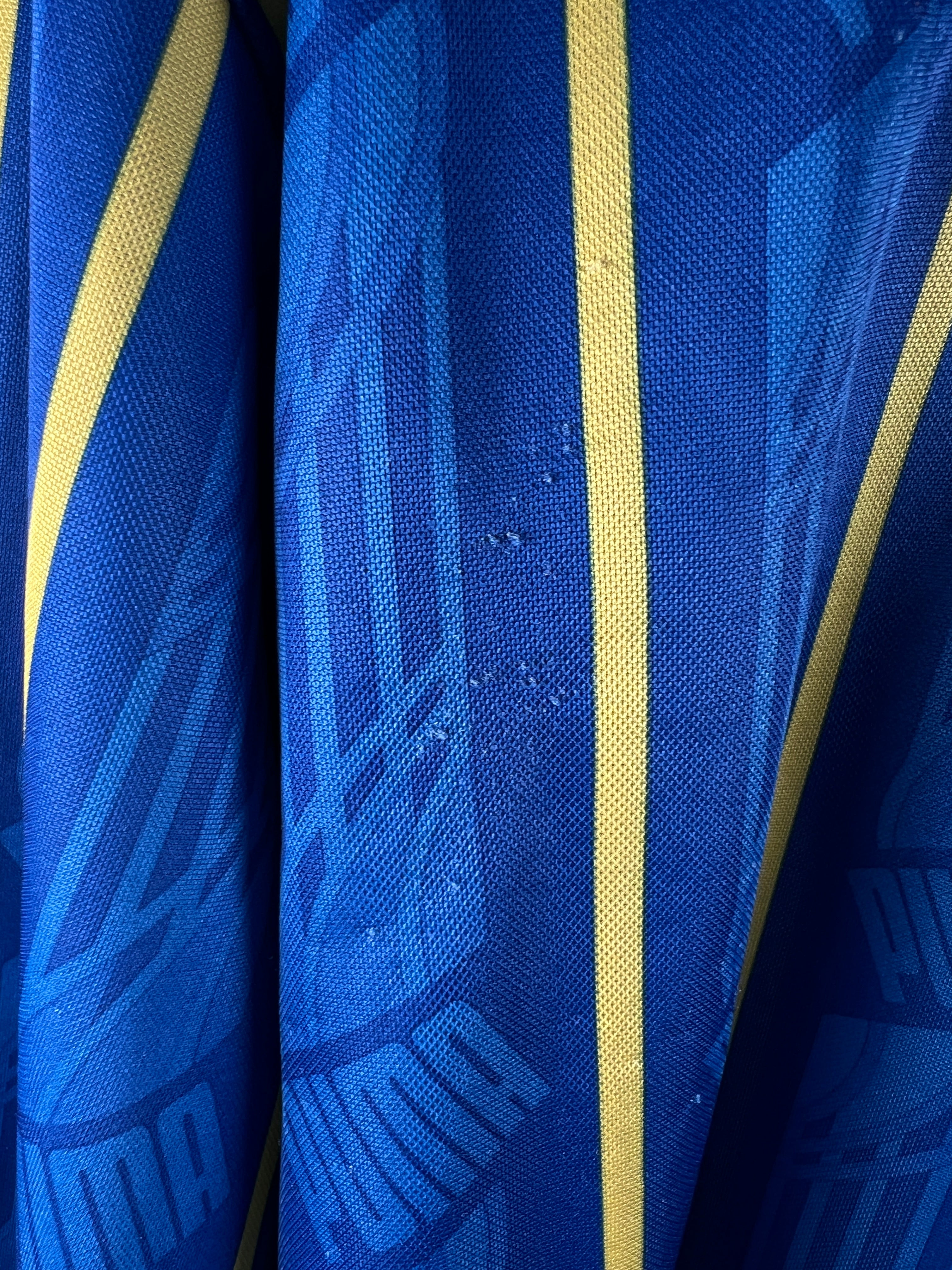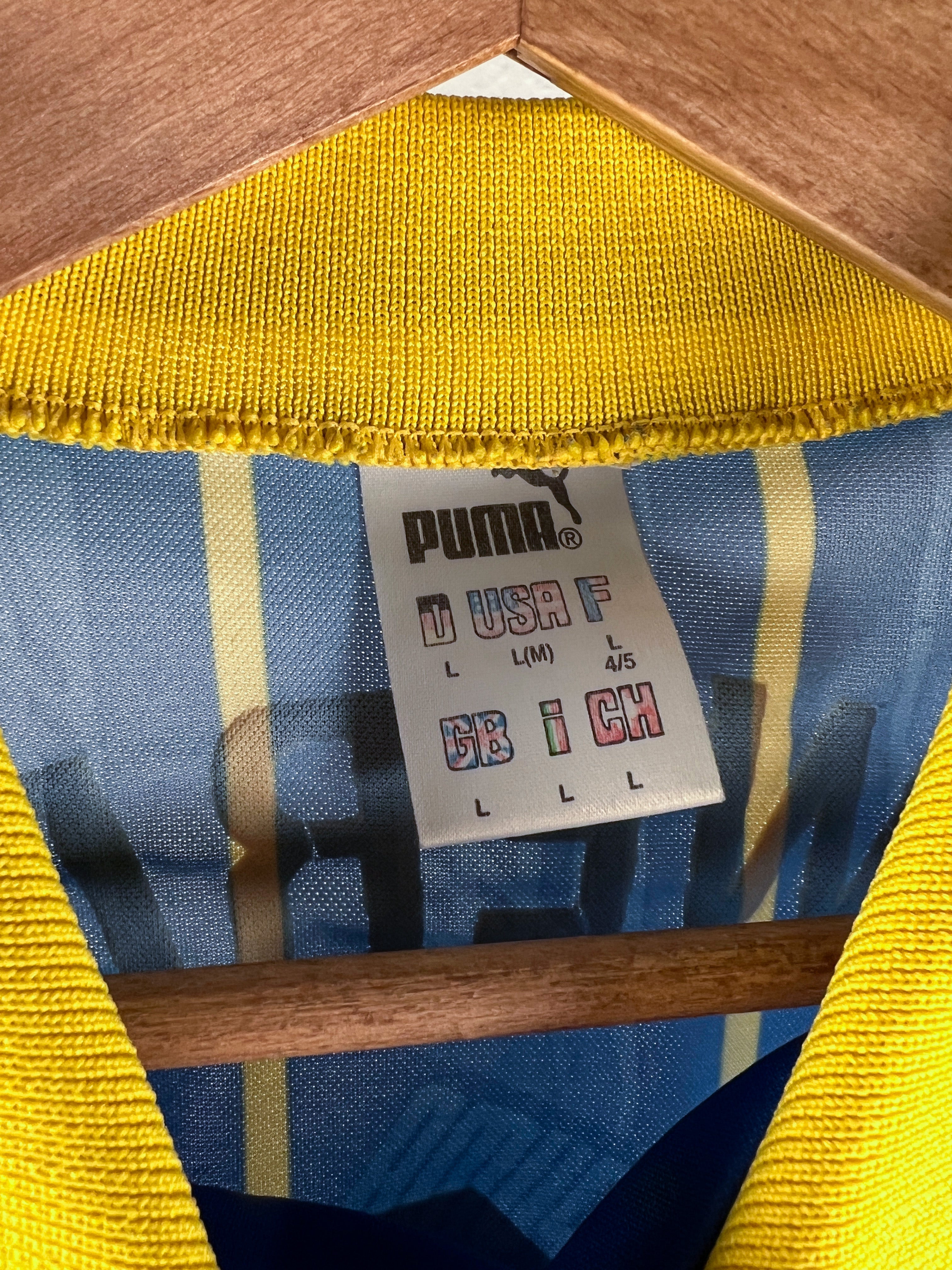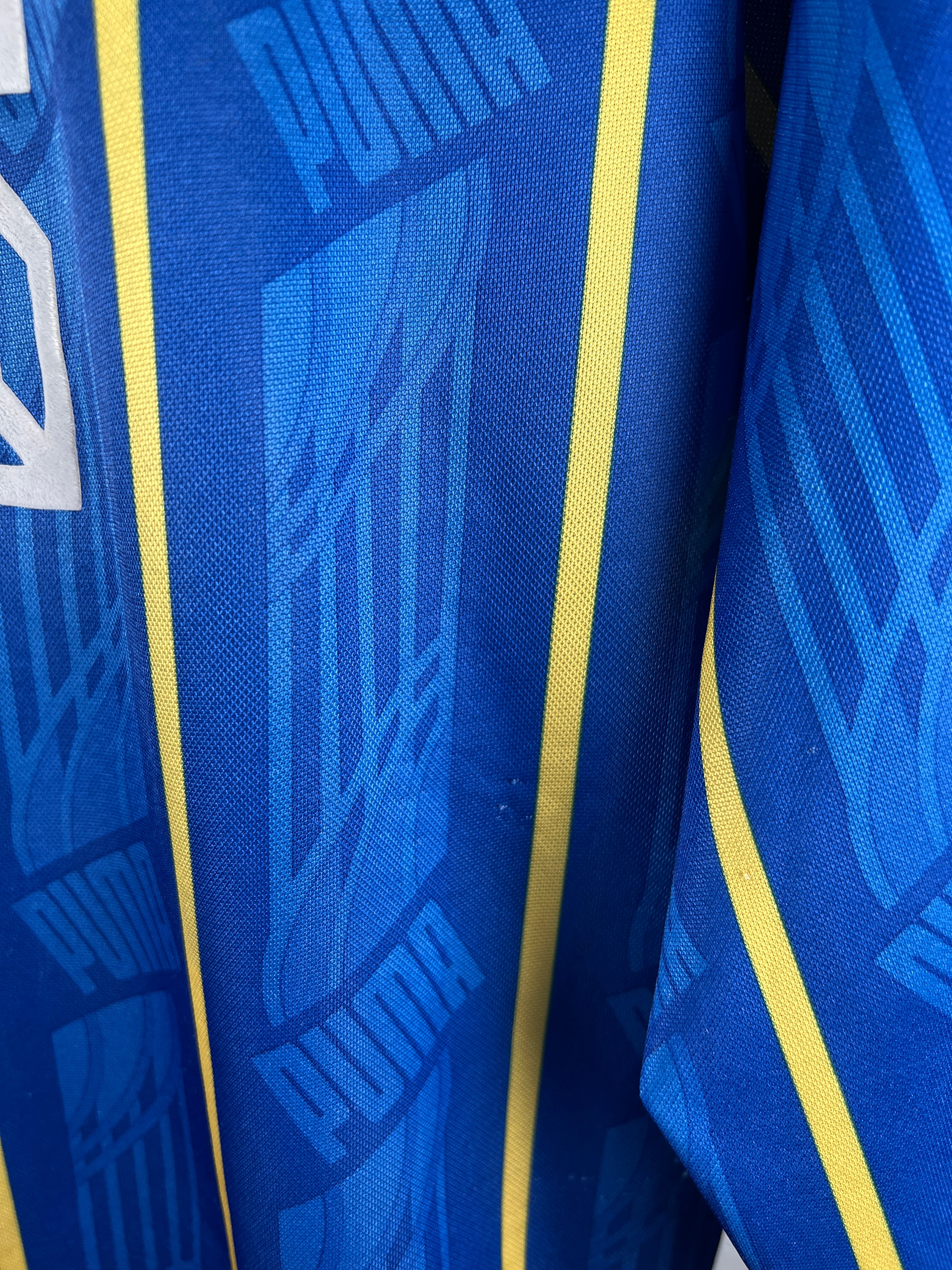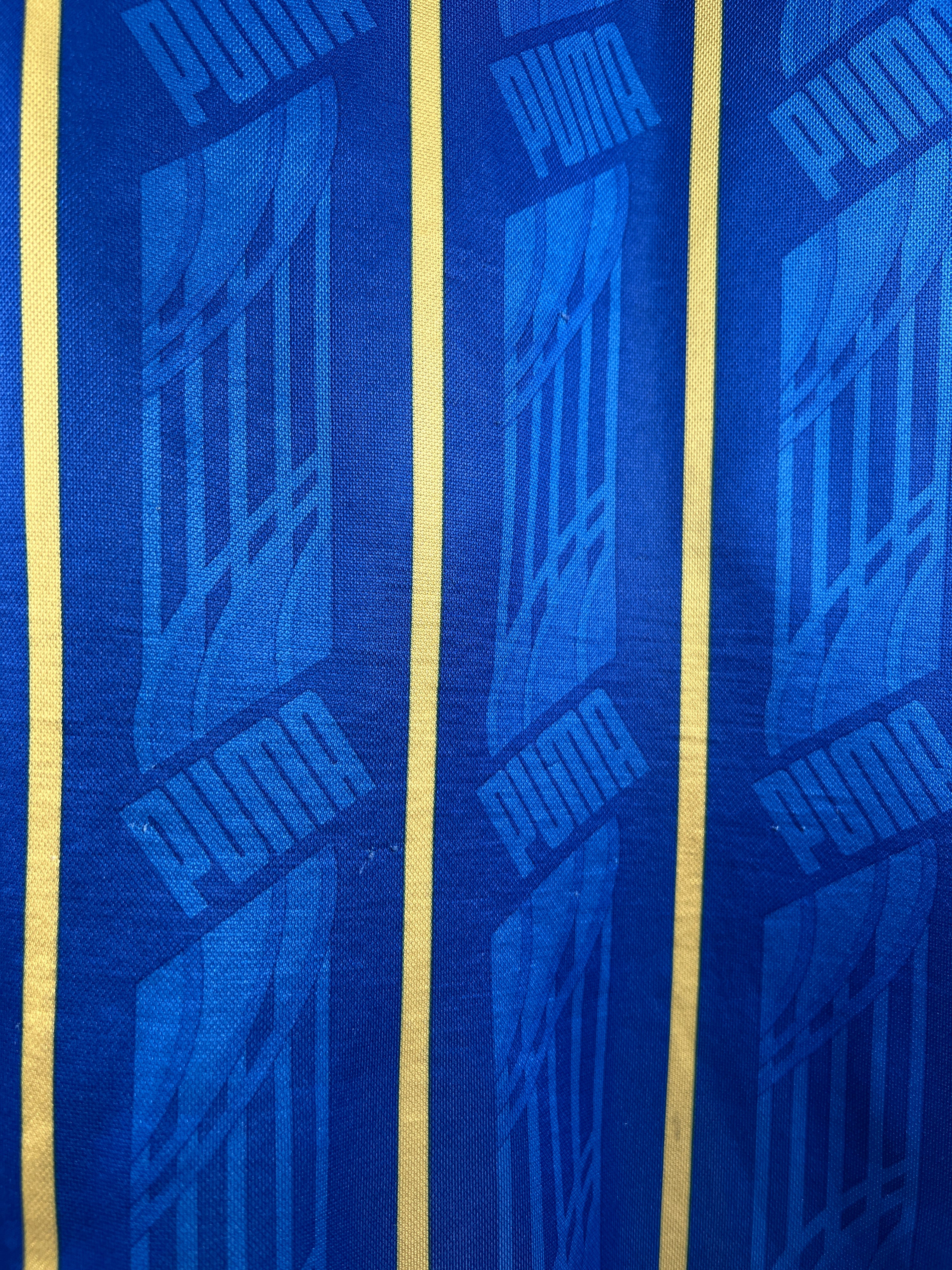 Besonderheiten: Seltenes Auswärtstrikot der Saison 1995/96 mit originalem Flock (#4). Unter dieser Nummer spielte damals u.a. der Tunesier Mohamed Zouita Ramzy. Eingewebtes Puma- und Werder-Logo im Stoff. Schwer in dieser Ausführung zu finden!