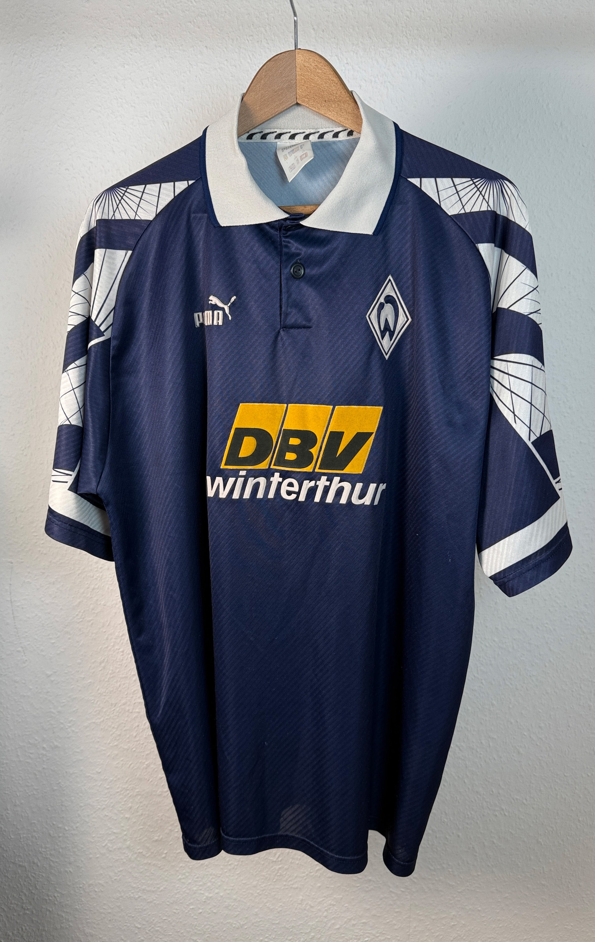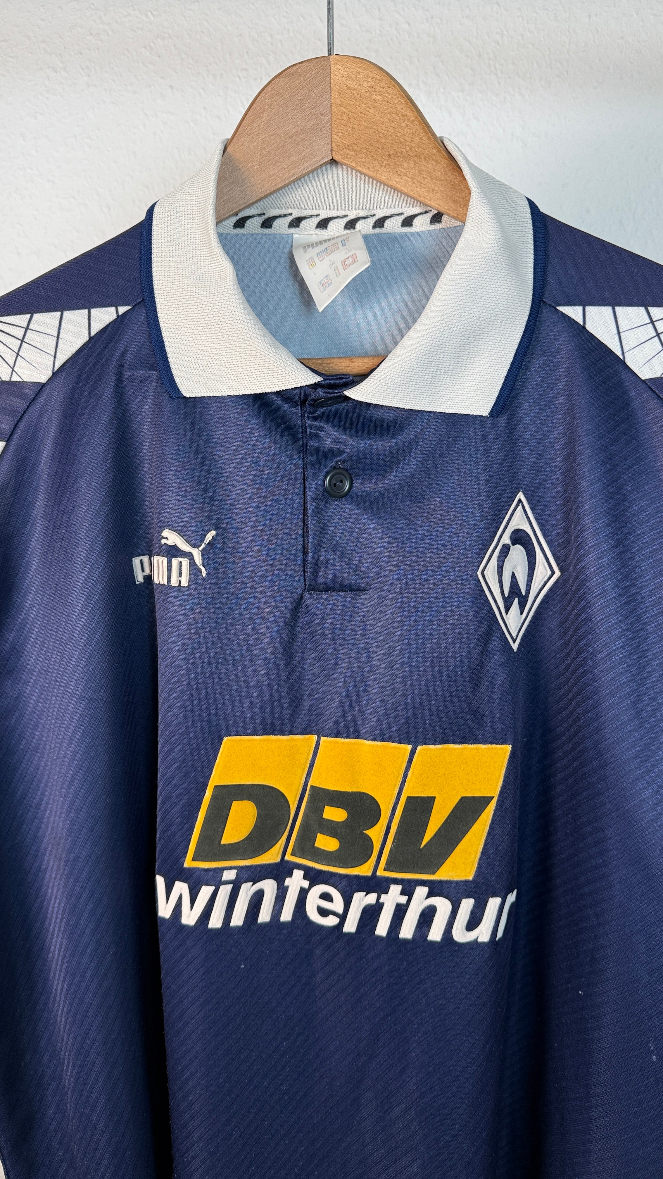 BESONDERHEITEN – Seltenes Auswärtstrikot von Werder Bremen aus der Saison 1996/97 mit DBV Winterthur-Sponsor. Klassisches Puma-Design der 90er in auffälligem Stil. Authentisches Vintage-Stück mit leichten altersbedingten Spuren – ideal für Sammler von 90er-Jahre-Trikots und Werder-Fans.