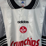 BESONDERHEITEN – Originales Auswärtstrikot des 1. FC Kaiserslautern aus der legendären Meistersaison 1997/98 mit Crunchips-Sponsor. Klassisches Adidas-Design in Weiß mit roten Details. Sehr selten in ungetragenem Zustand – ein echtes Highlight für Sammler der FCK-Geschichte und Fans der Rehhagel-Ära.