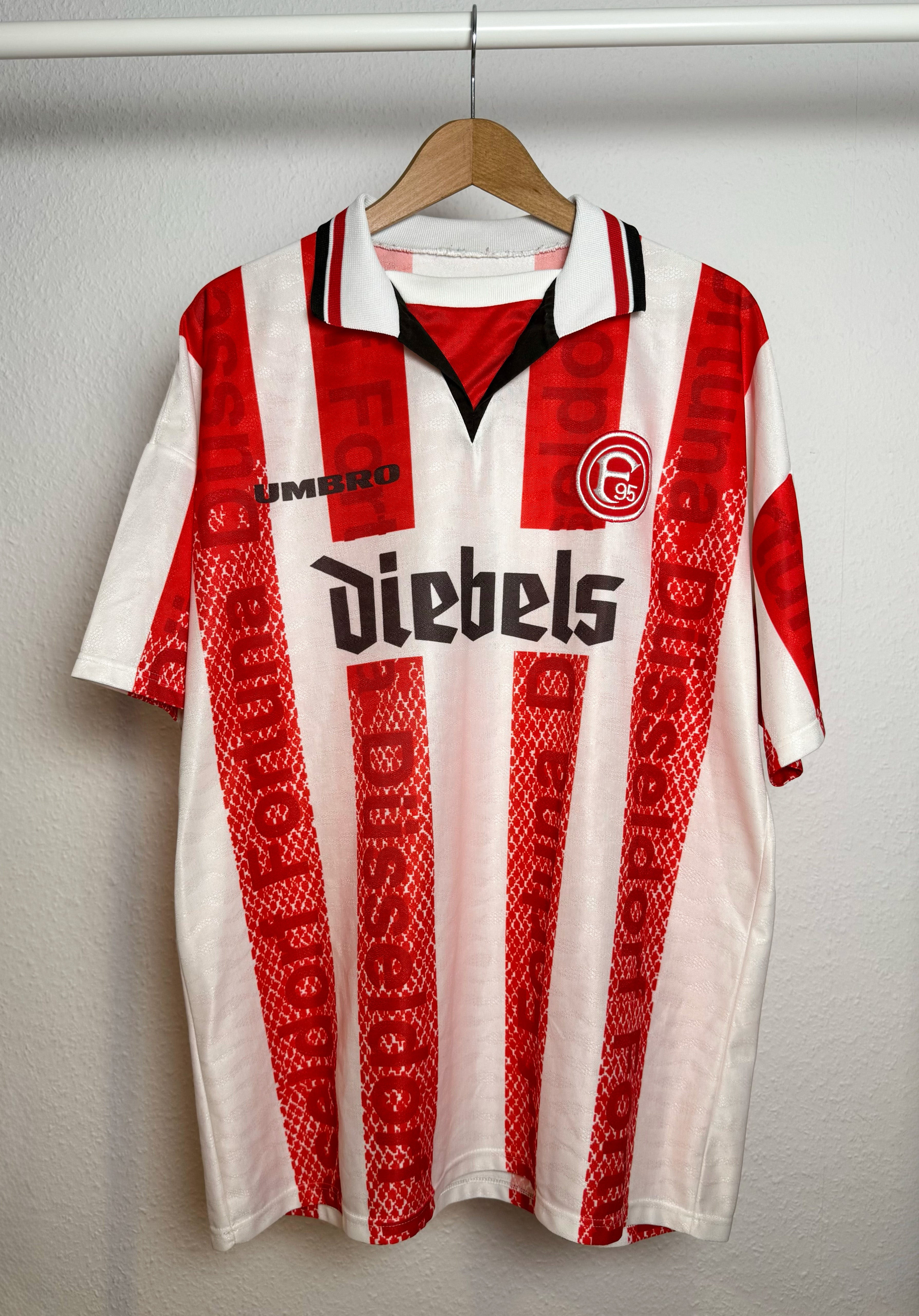 BESONDERHEITEN – Klassisches Fortuna-Düsseldorf-Heimtrikot der 90er mit ikonischem Diebels-Sponsor und typischem Umbro-Design.